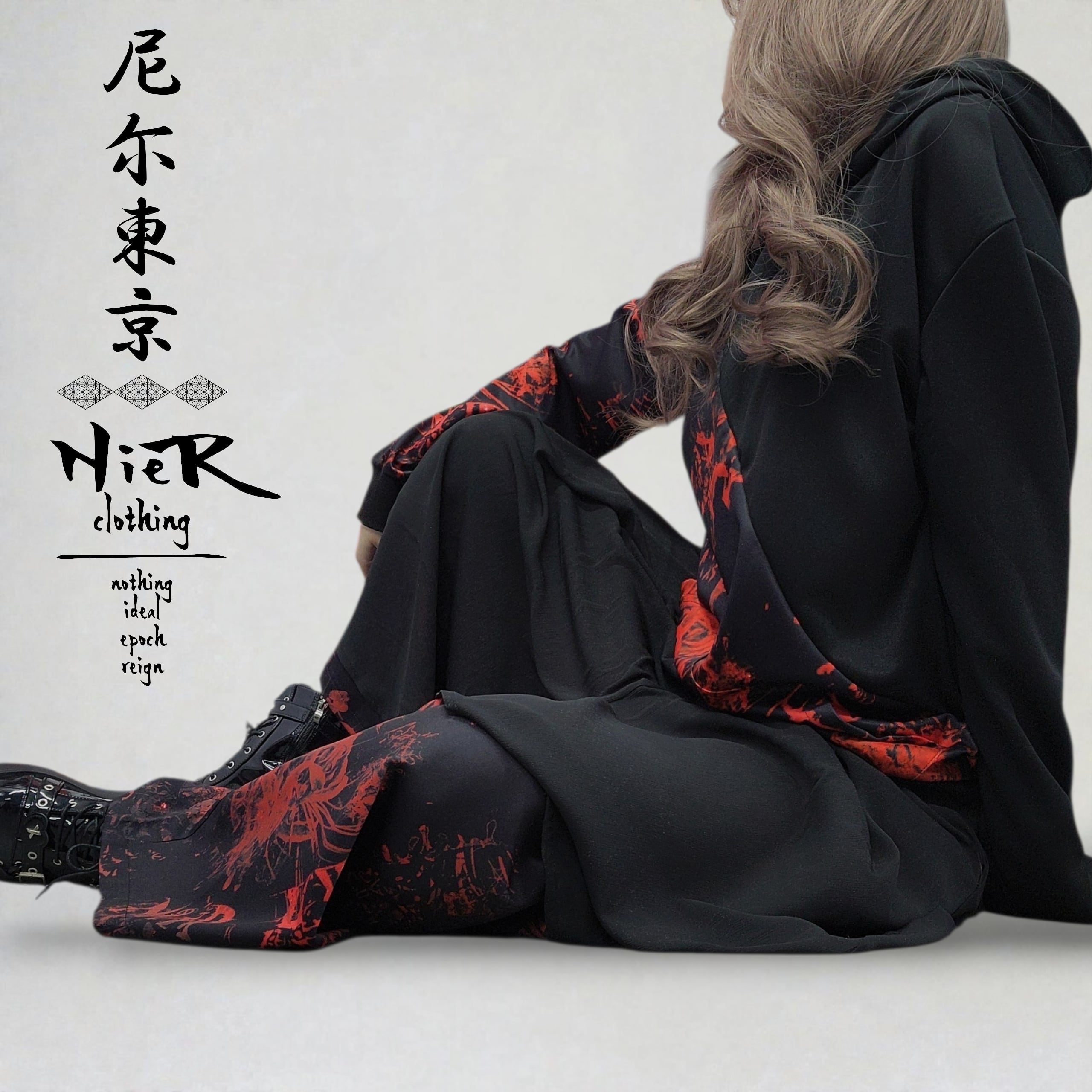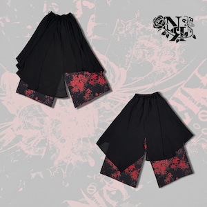 彼岸花モチーフの裾総柄パンツをレイヤードしたフラップ付きパンツです。