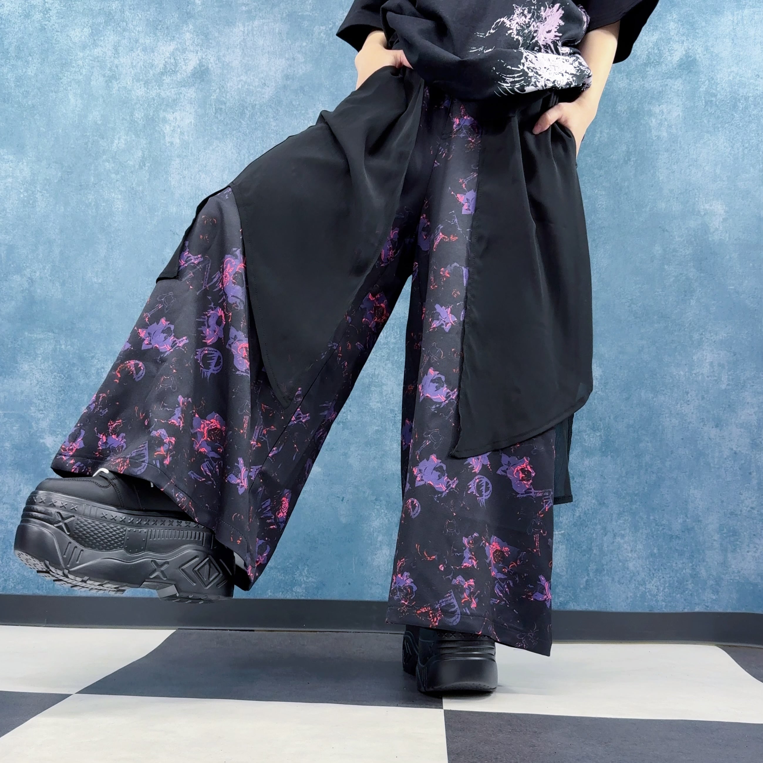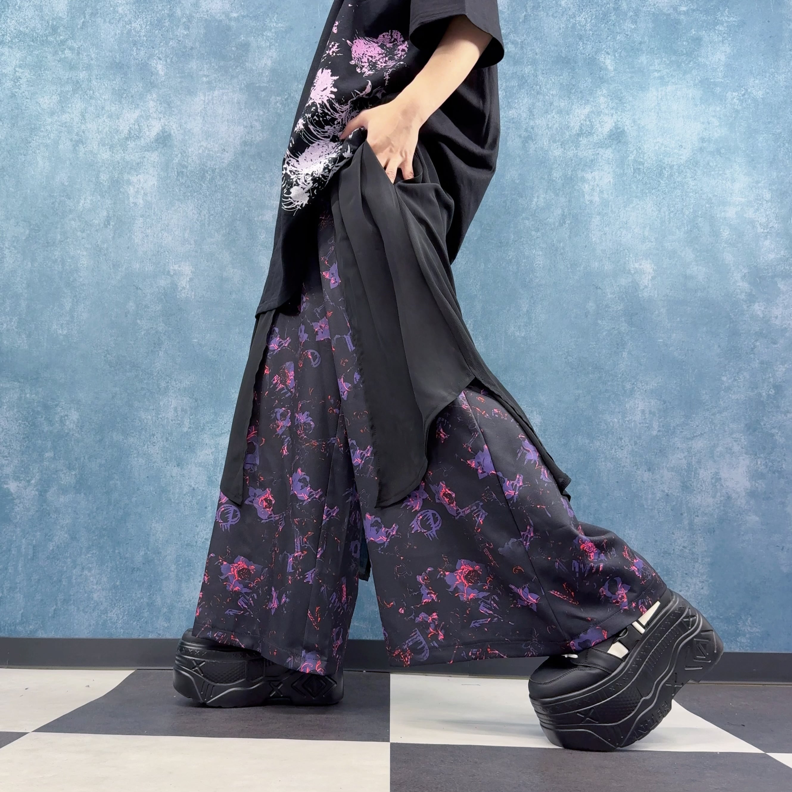 総柄デザインが印象的なワイドパンツです。
