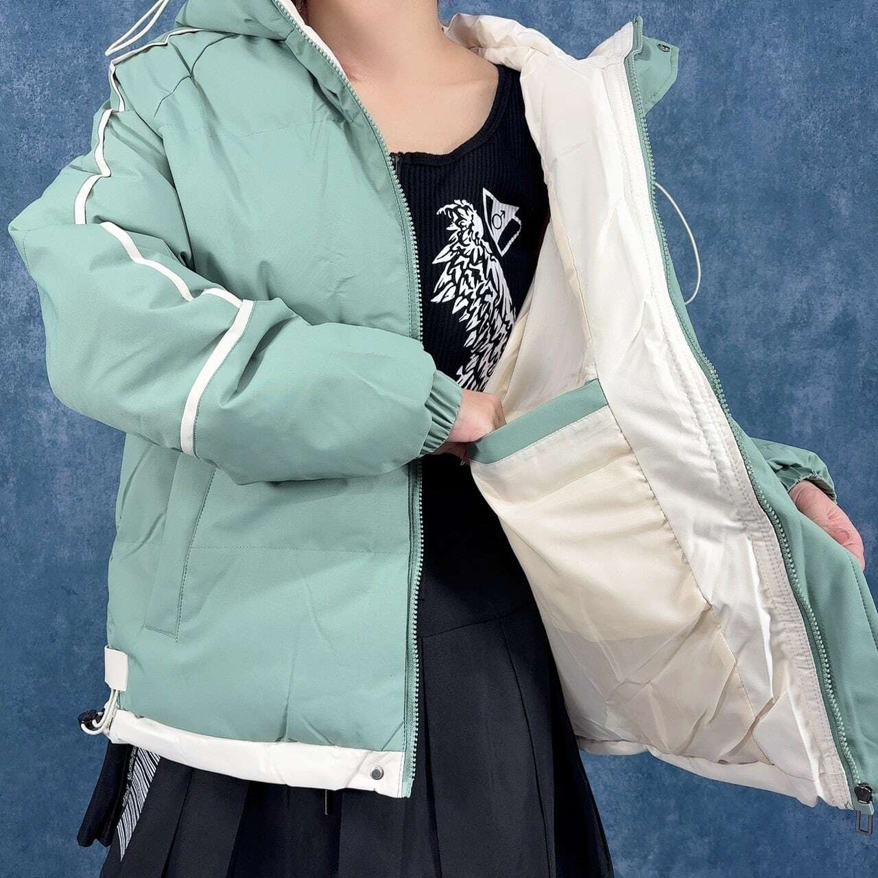 【掲載の-肉球PRINT‐中綿入りハイネックフード付きアウター【MINT GREEN】】