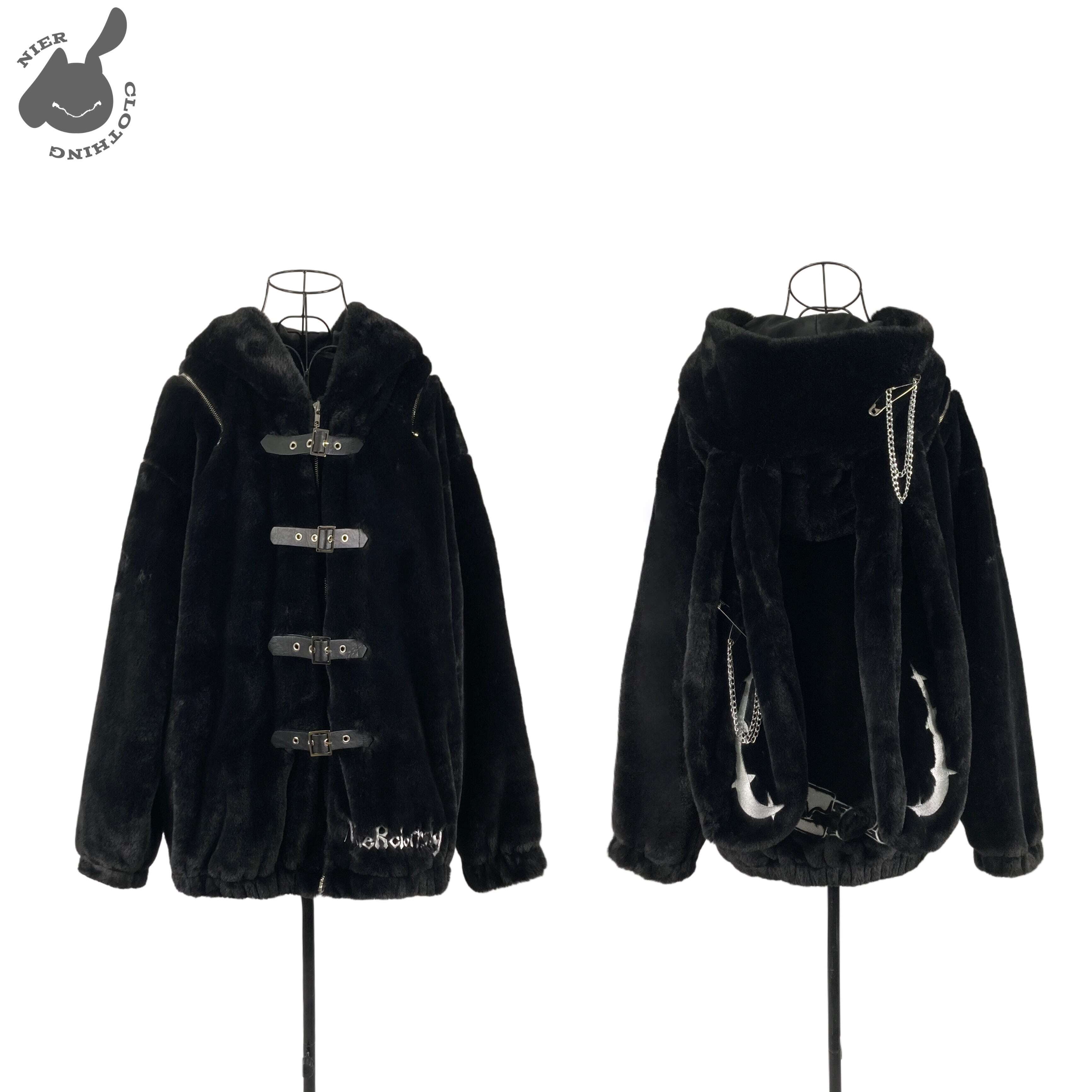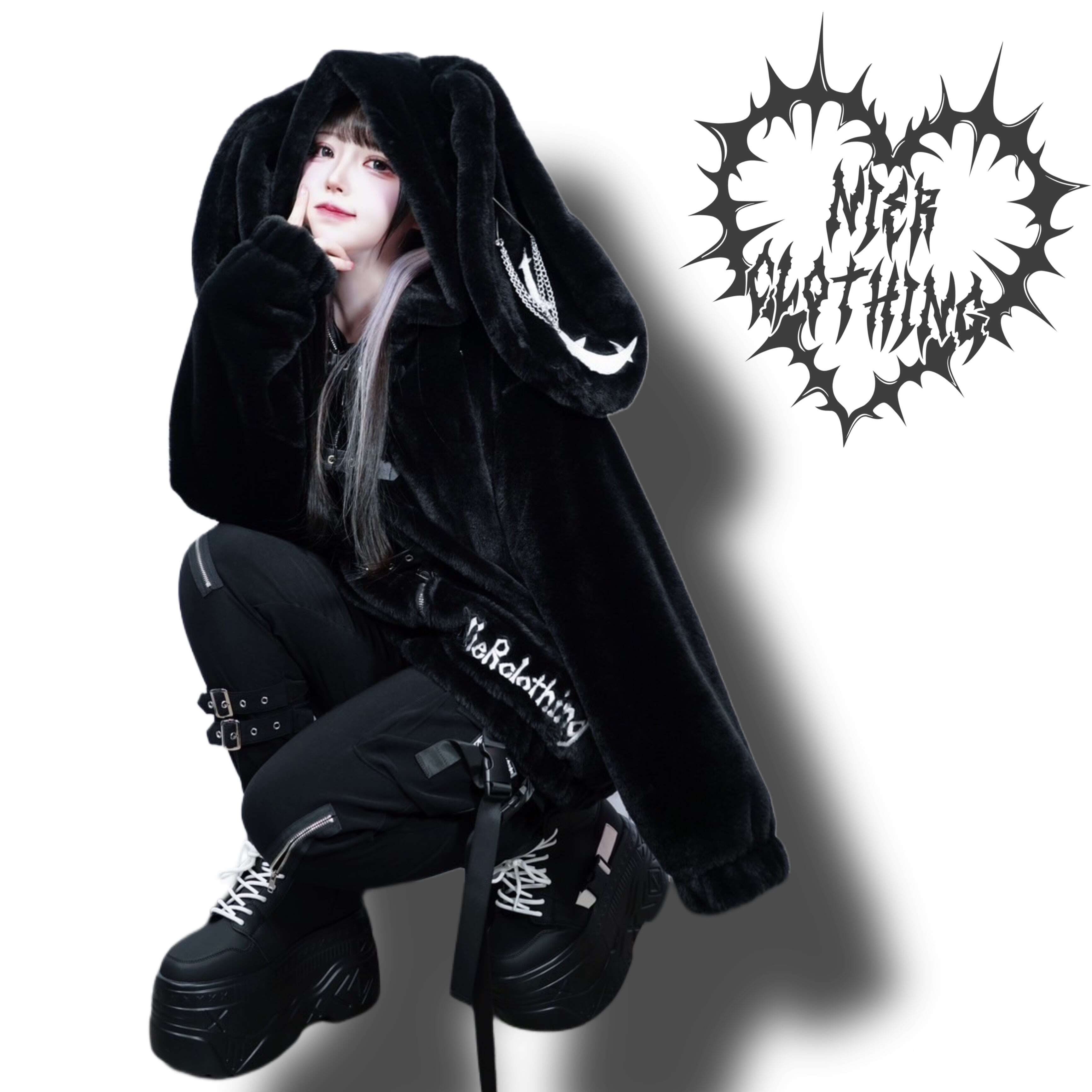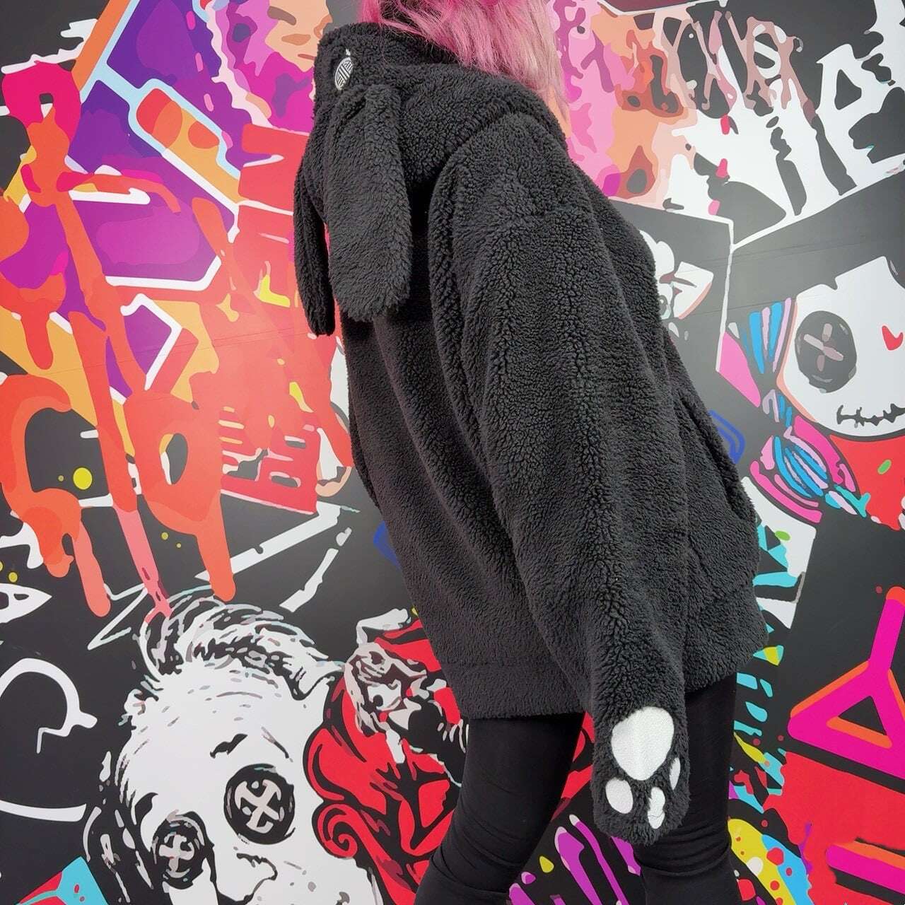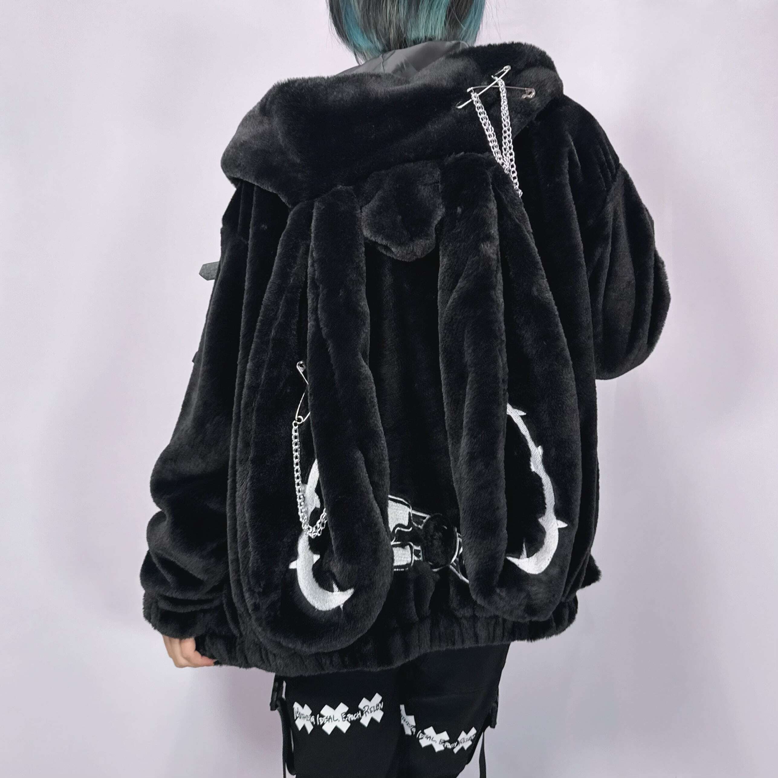 ・肉球刺繍×うさ耳 ふわもこブラックボアアウター