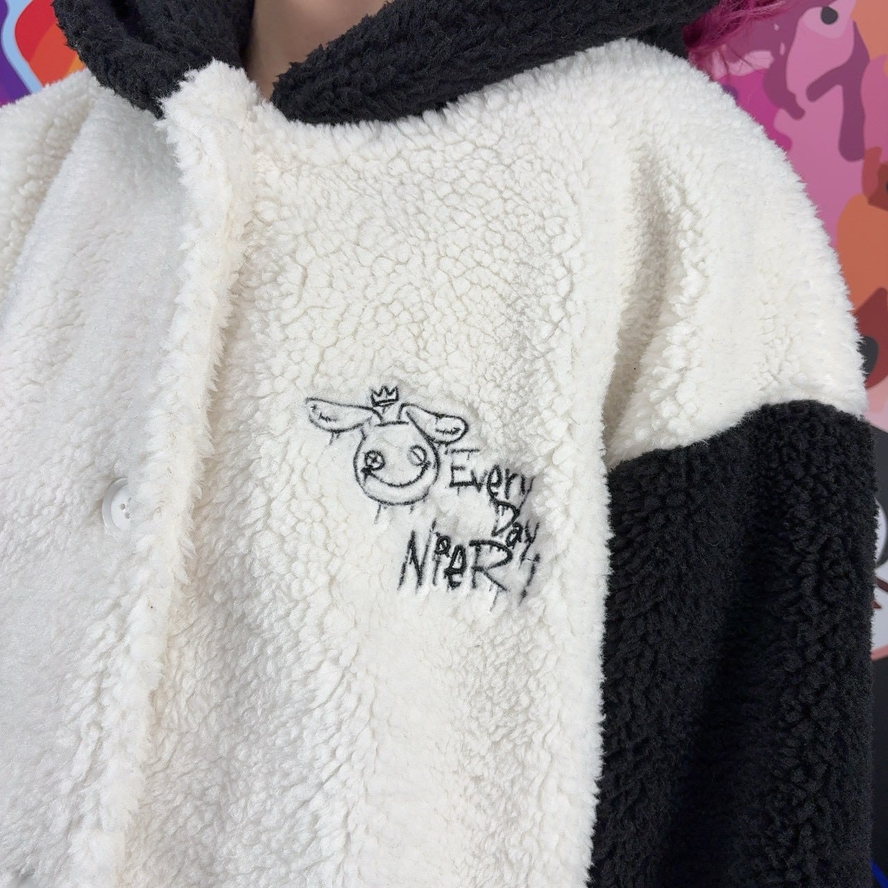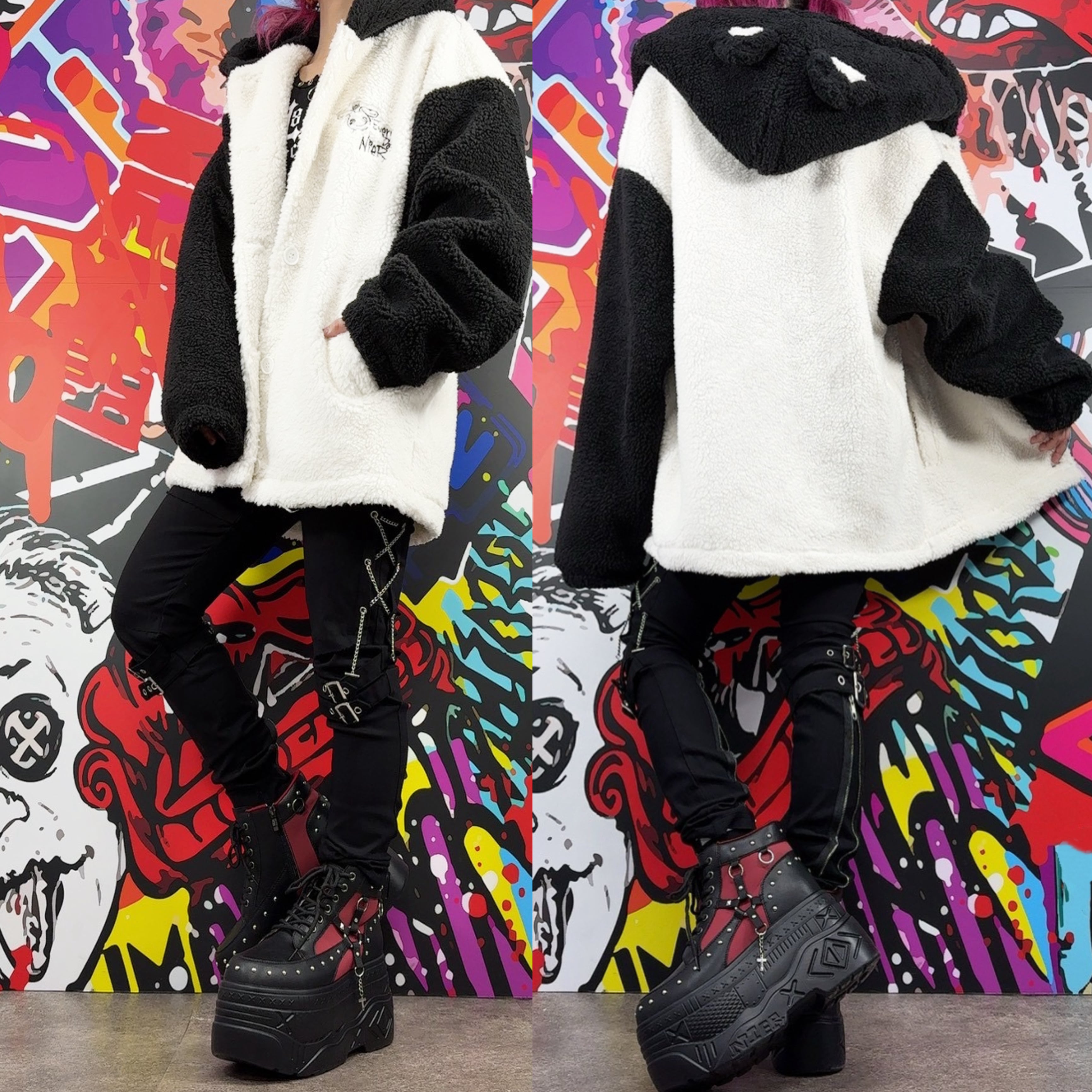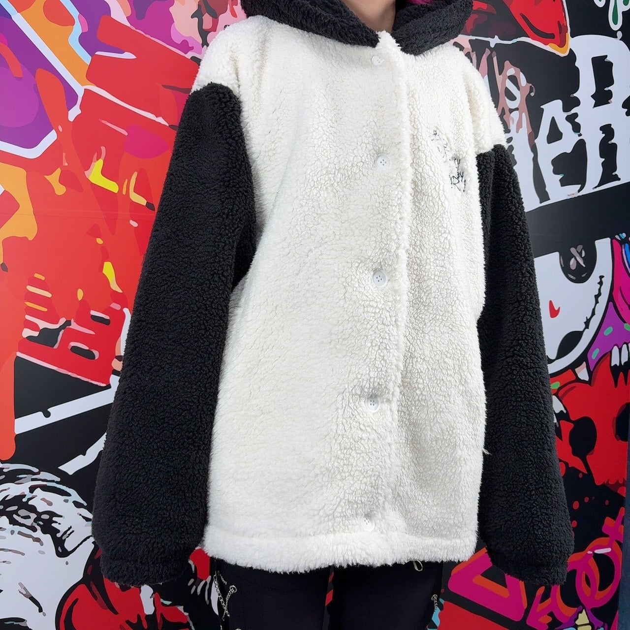 身頃部分はホワイト、袖とフードはブラックの配色で、