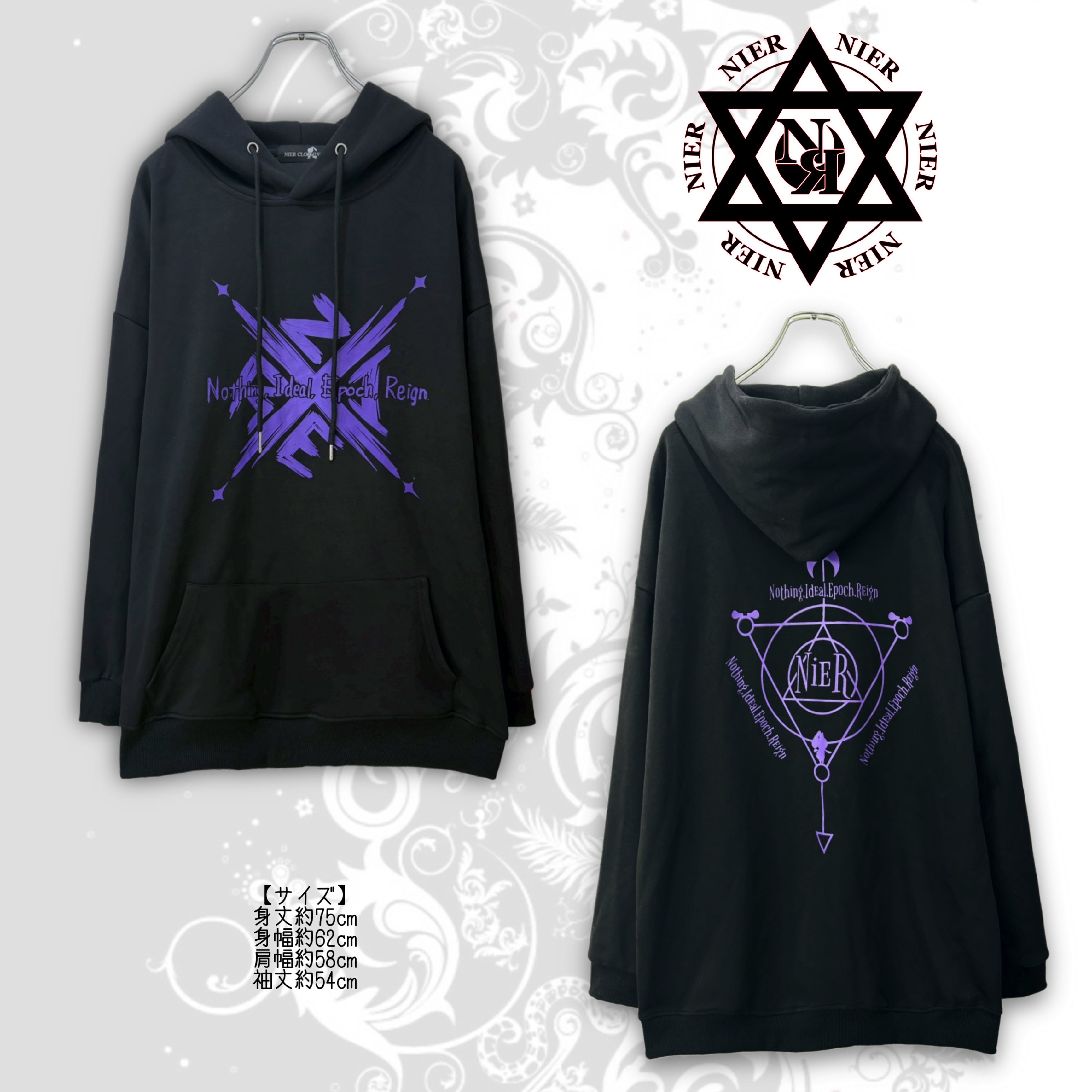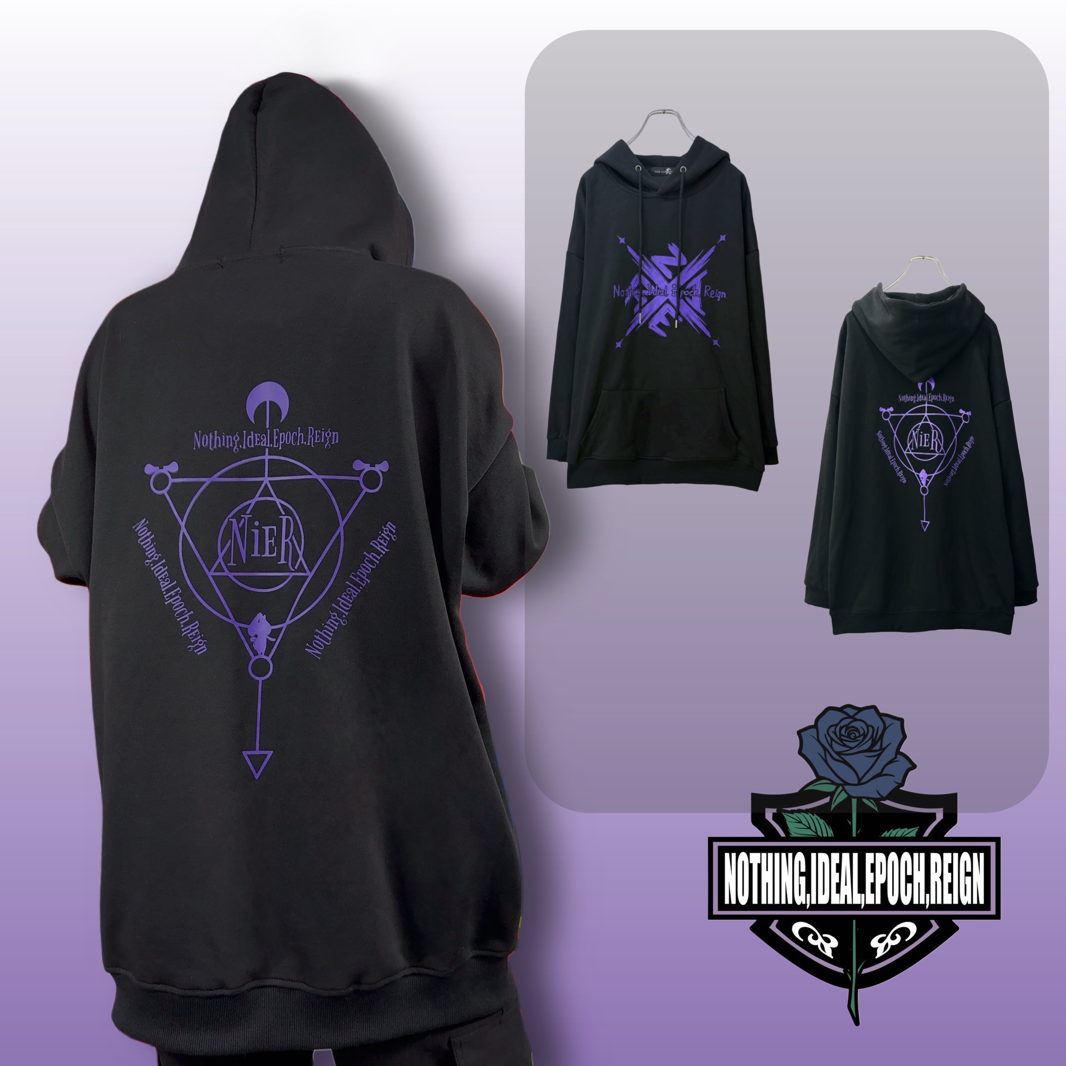 バックにはNIERロゴを中心に、モチーフを組み合わせた存在感のあるプリントを配置しました。