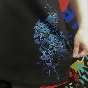 裾サイドへ大胆に咲く青薔薇グラフィック。