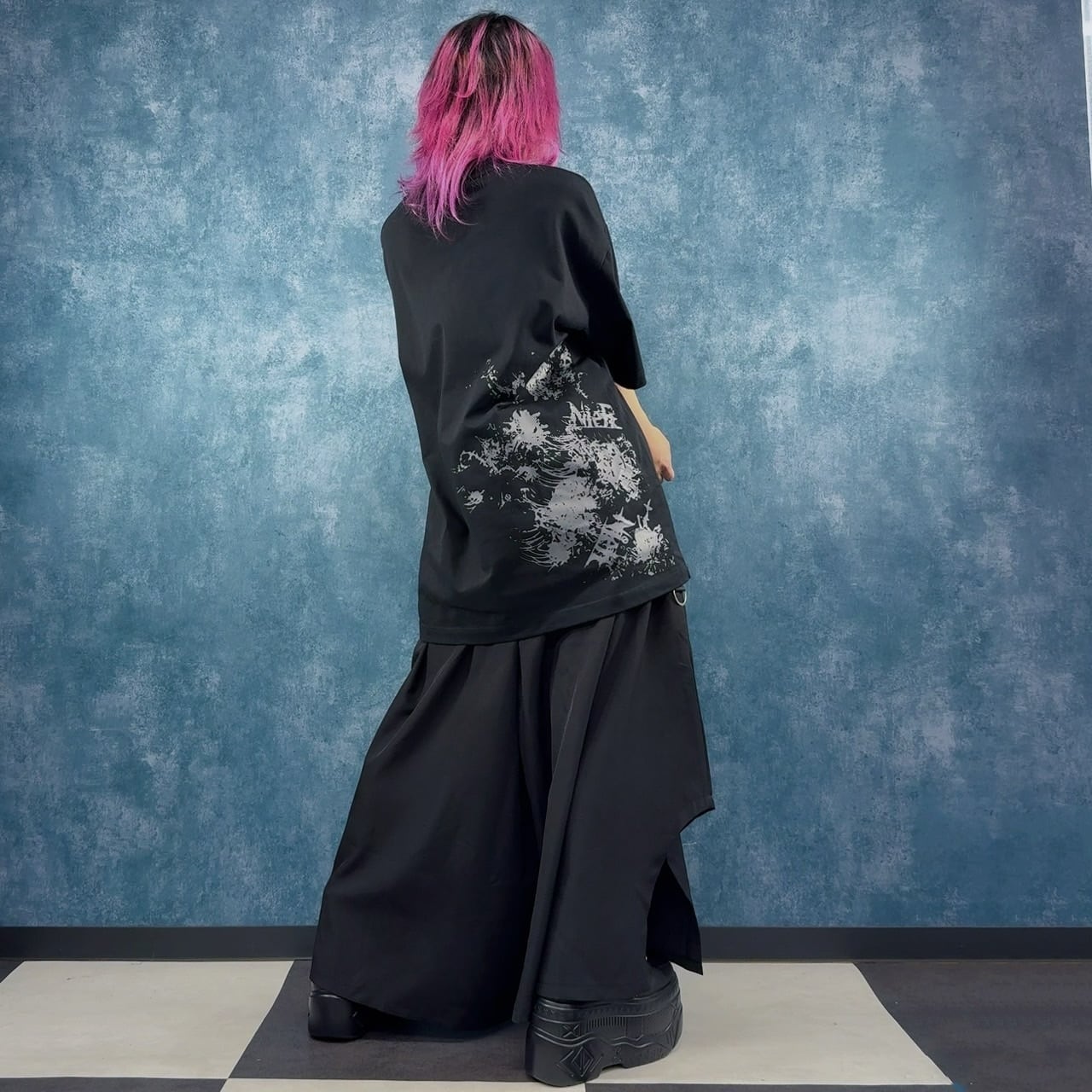 バックには彼岸花を取り入れた存在感のあるアートを落とし込んだ半袖Tシャツです。
