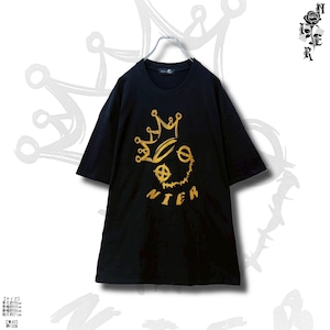 ラフな手描きタッチで描かれたクラウン×フェイスモチーフをゴールドプリントで落とし込んだ、