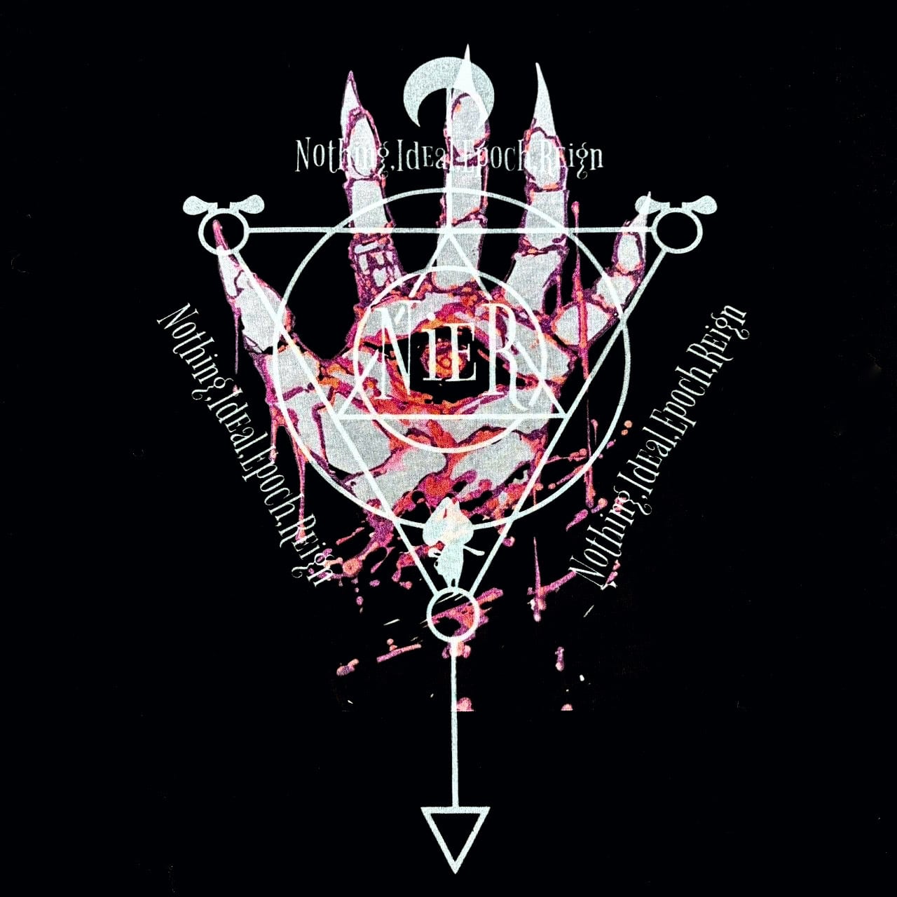 血痕を思わせるグラフィックとNIERロゴを組み合わせたシンボリックなプリントを配置。
