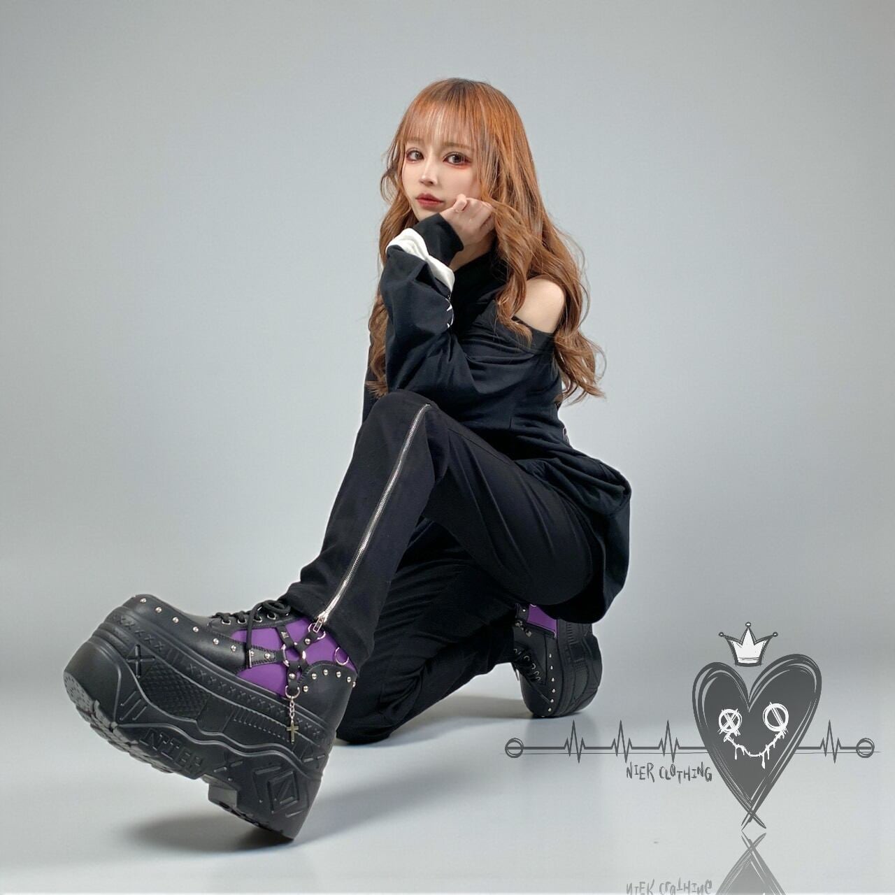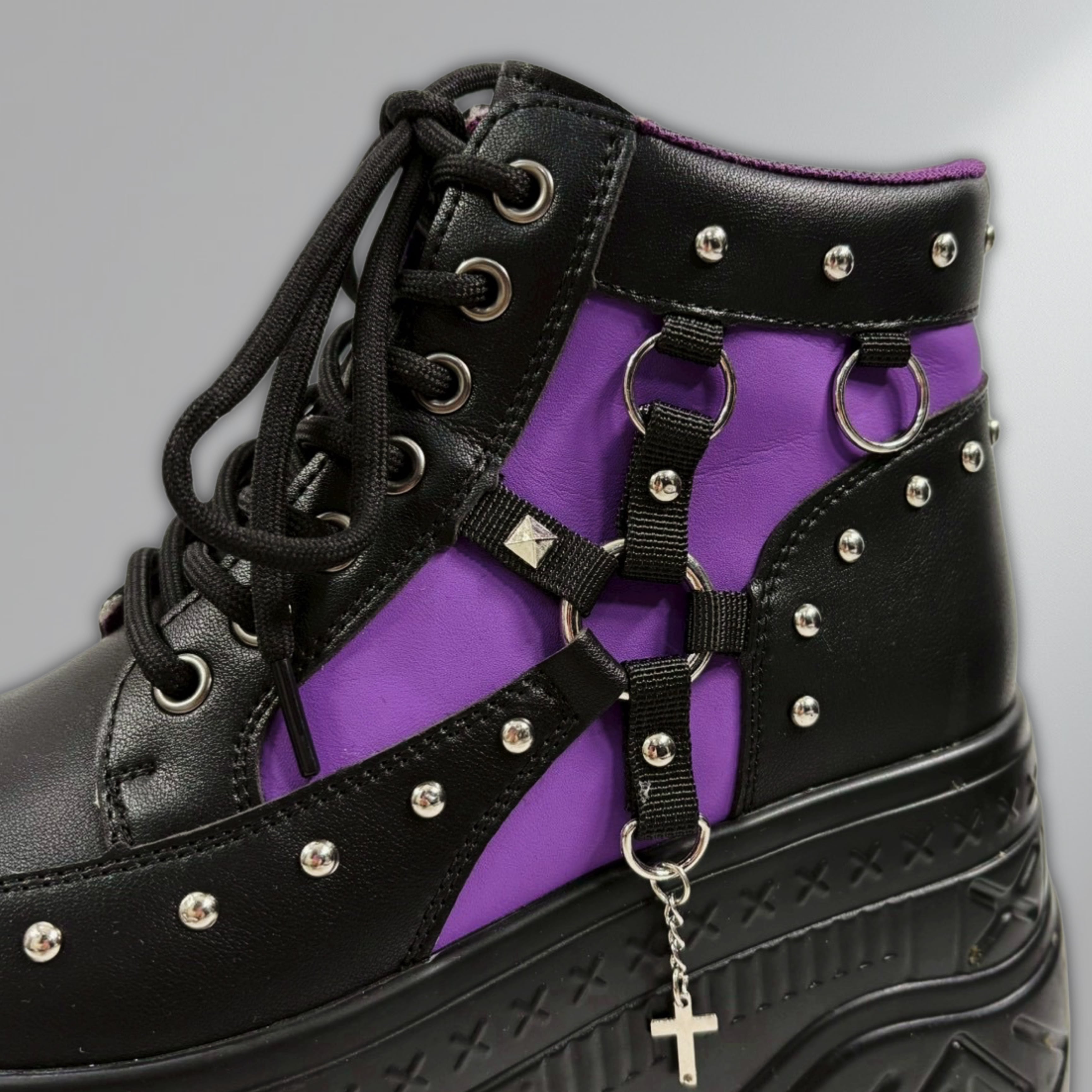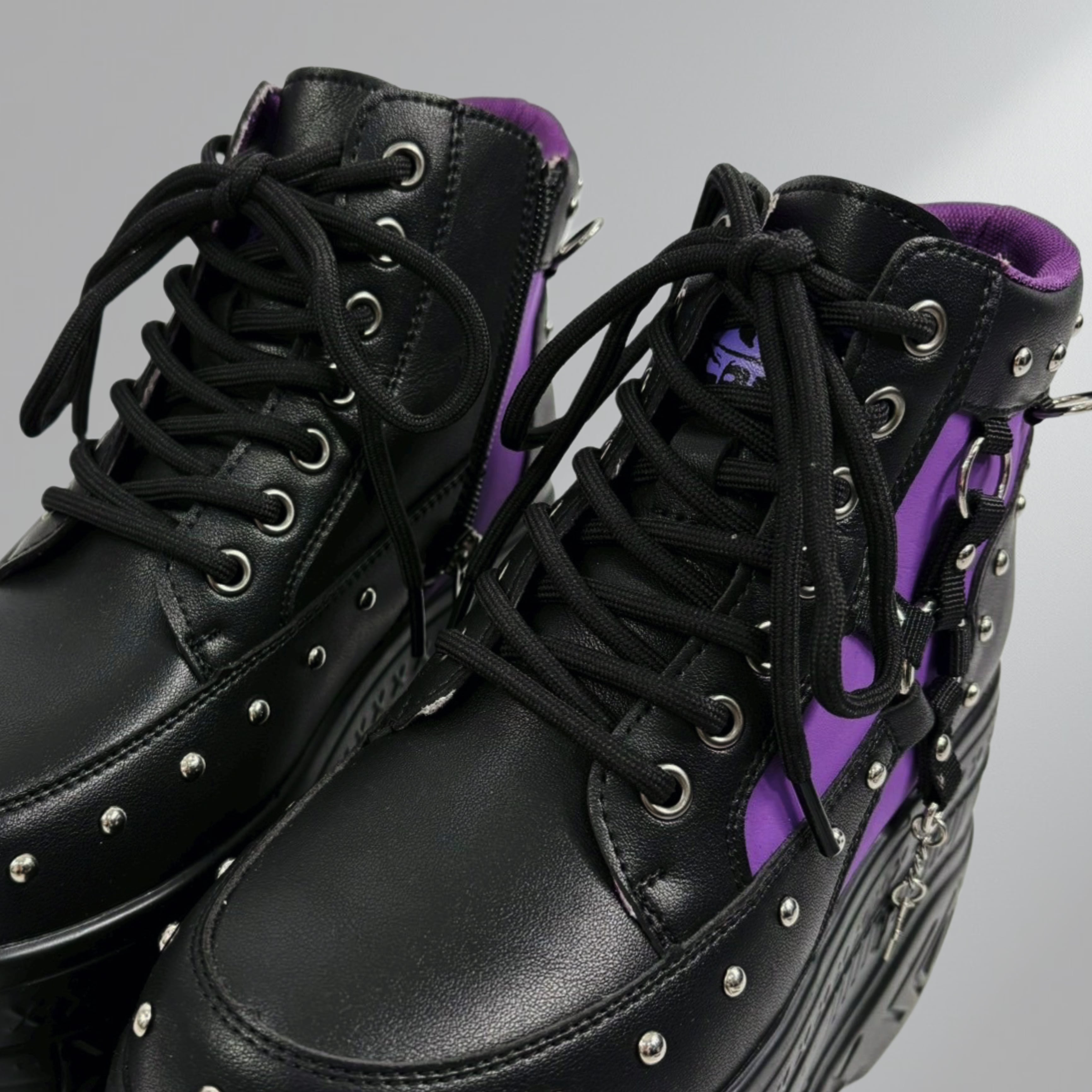 重厚感のあるブラックをベースに、パープルパネルとスタッズ、ハーネスディテールを組み合わせた、存在感のある一足。