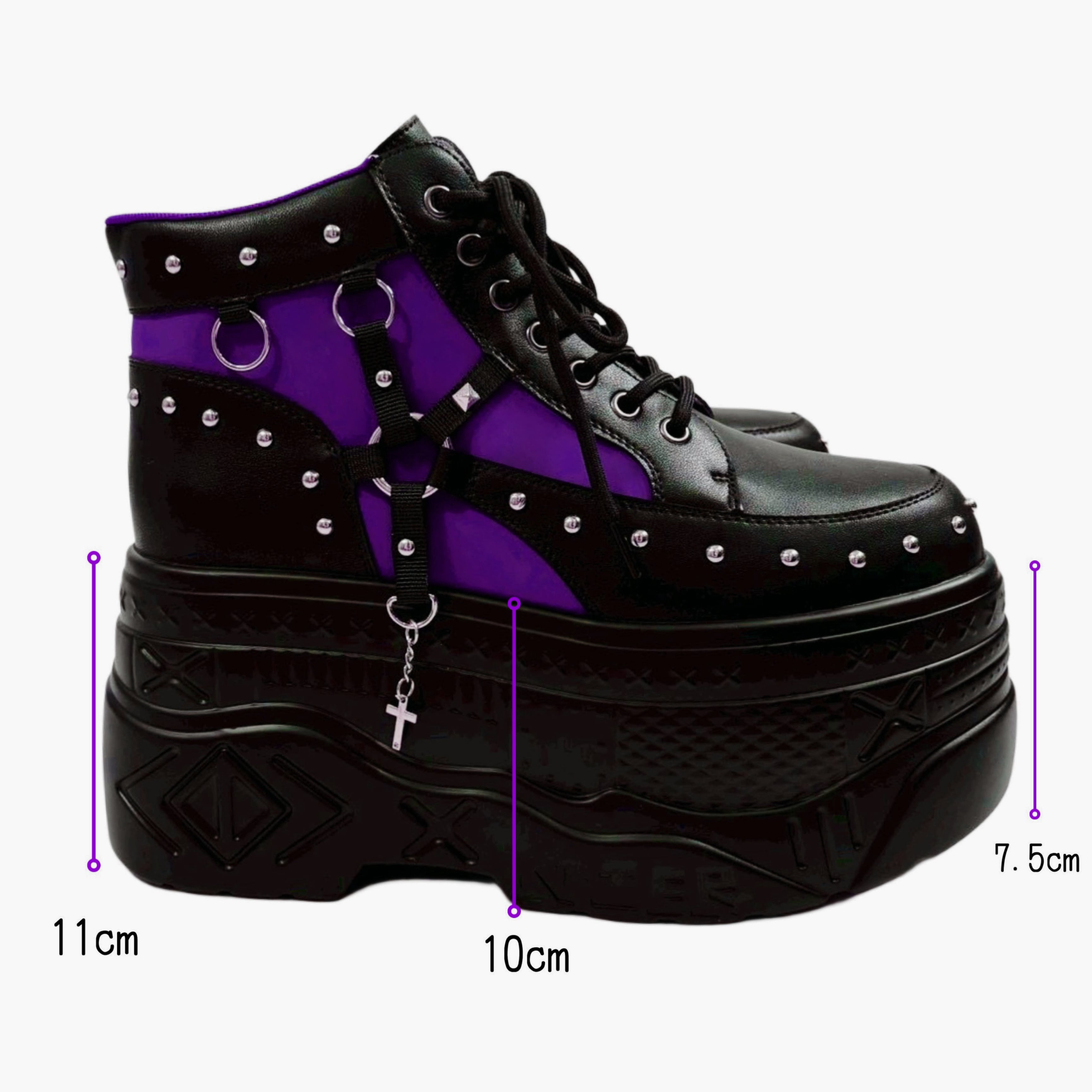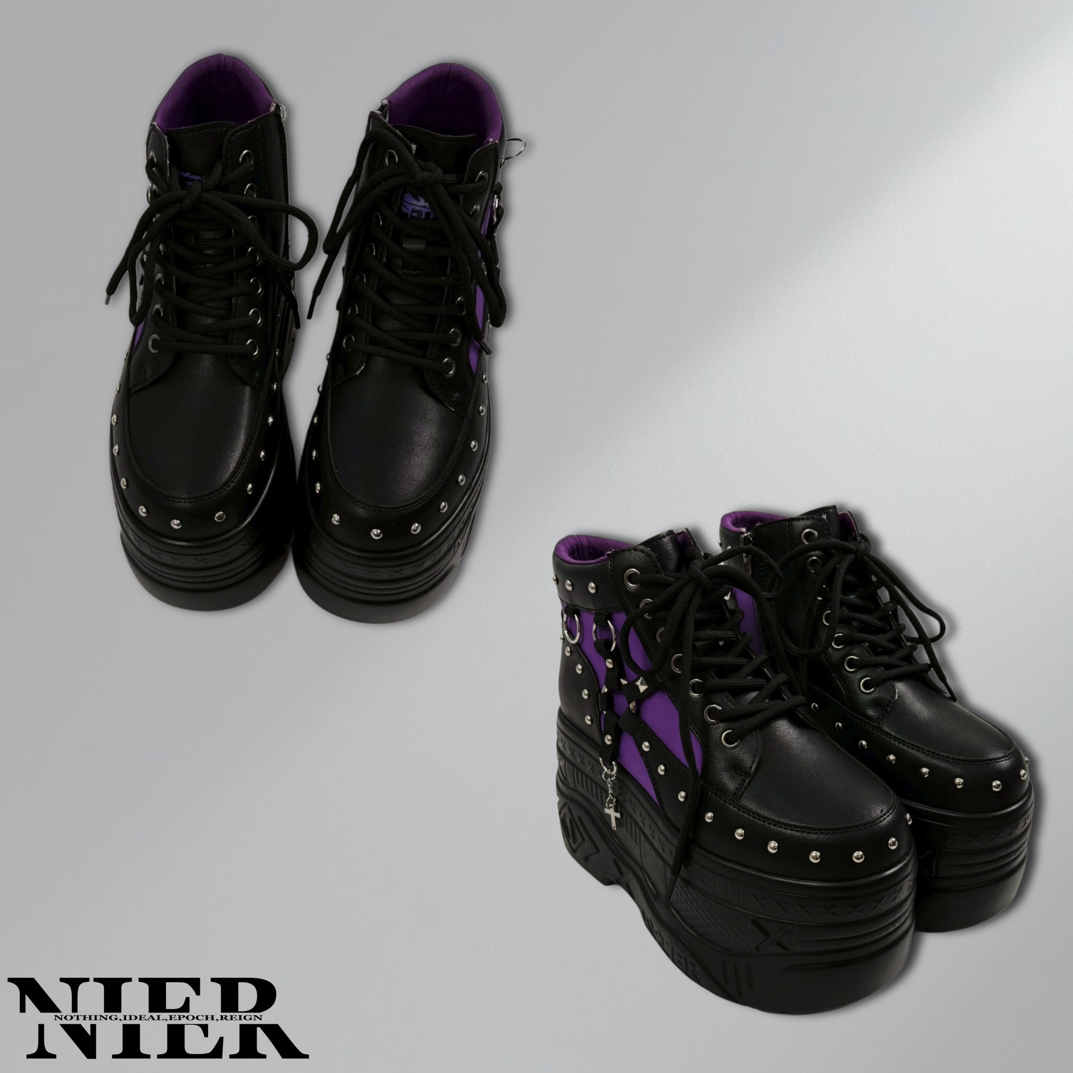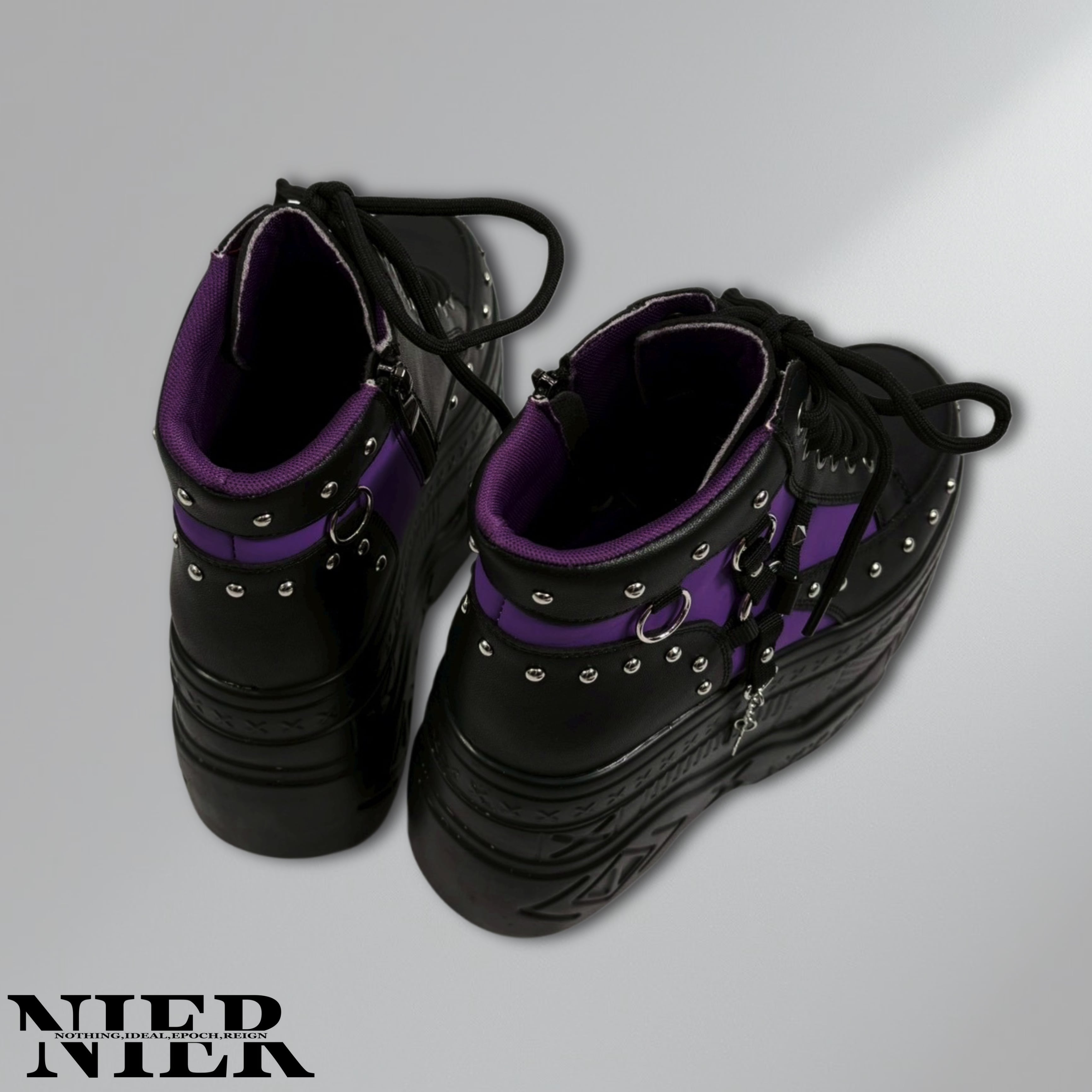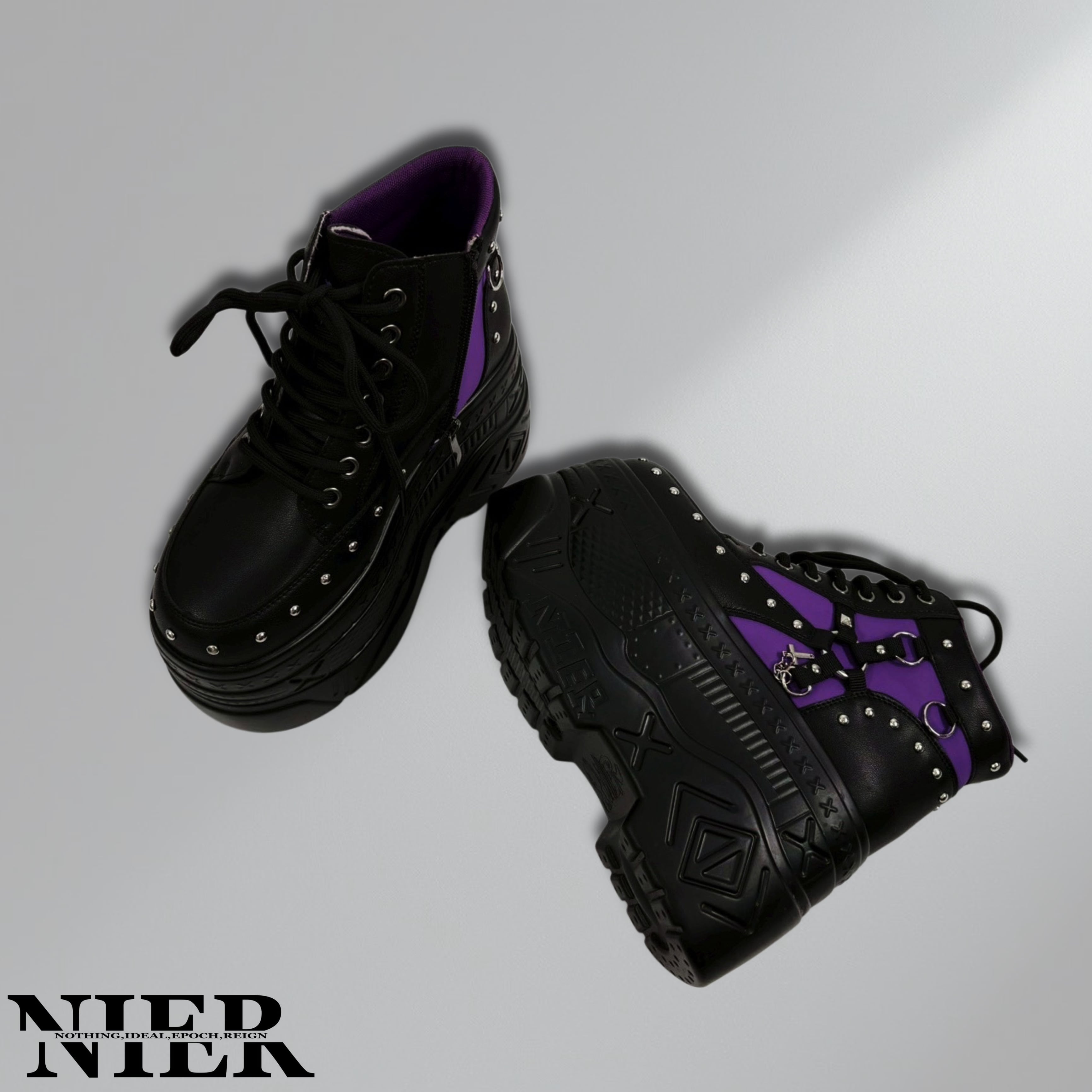 重厚感のあるブラックをベースに、パープルパネルとスタッズ、ハーネスディテールを組み合わせた、存在感のある一足。