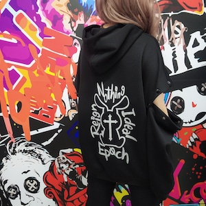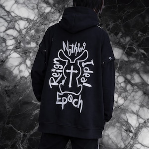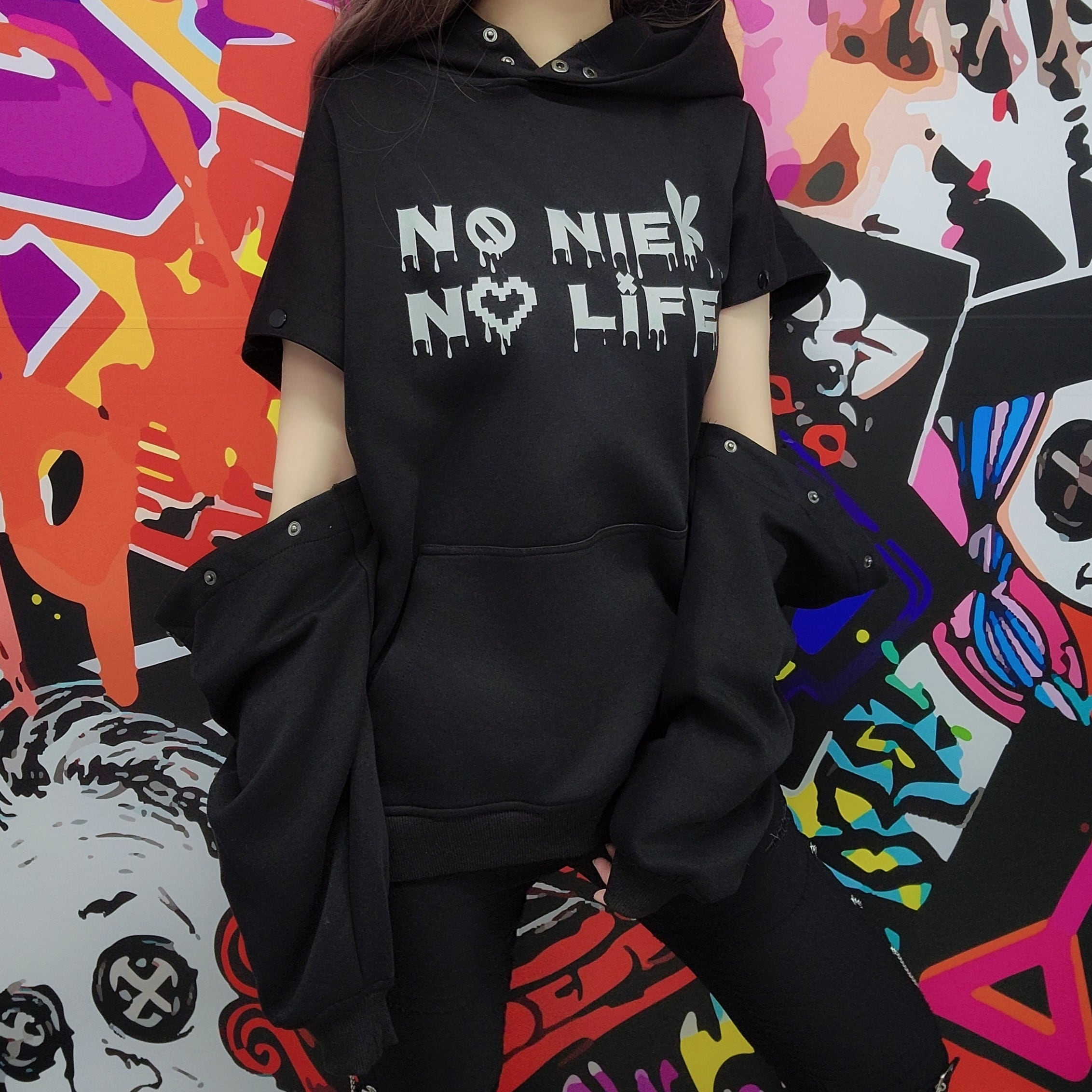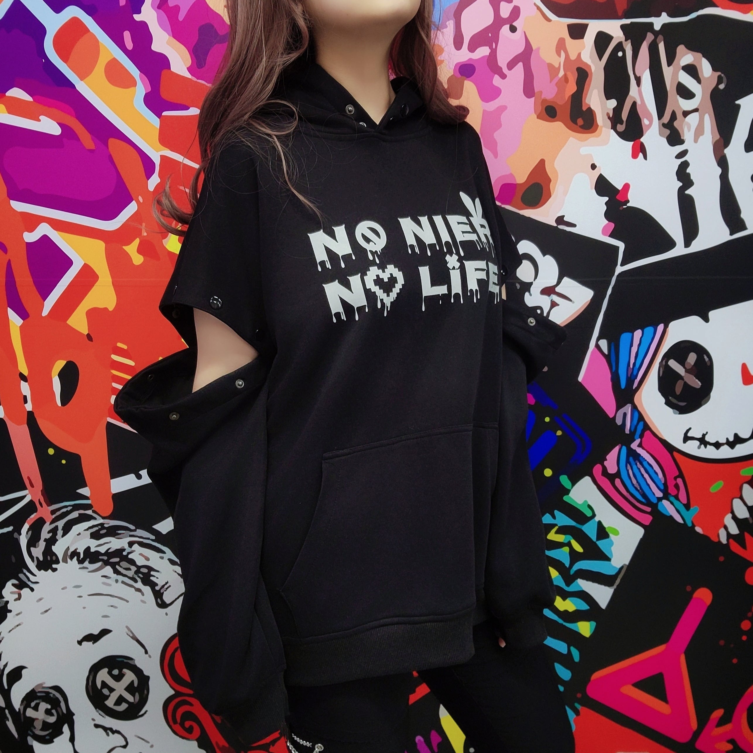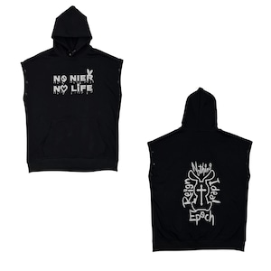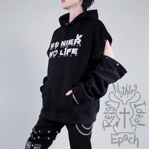 「NO NIER NO LIFE」 をフロントに落とし込んだ、存在感抜群のフーディトップスです。