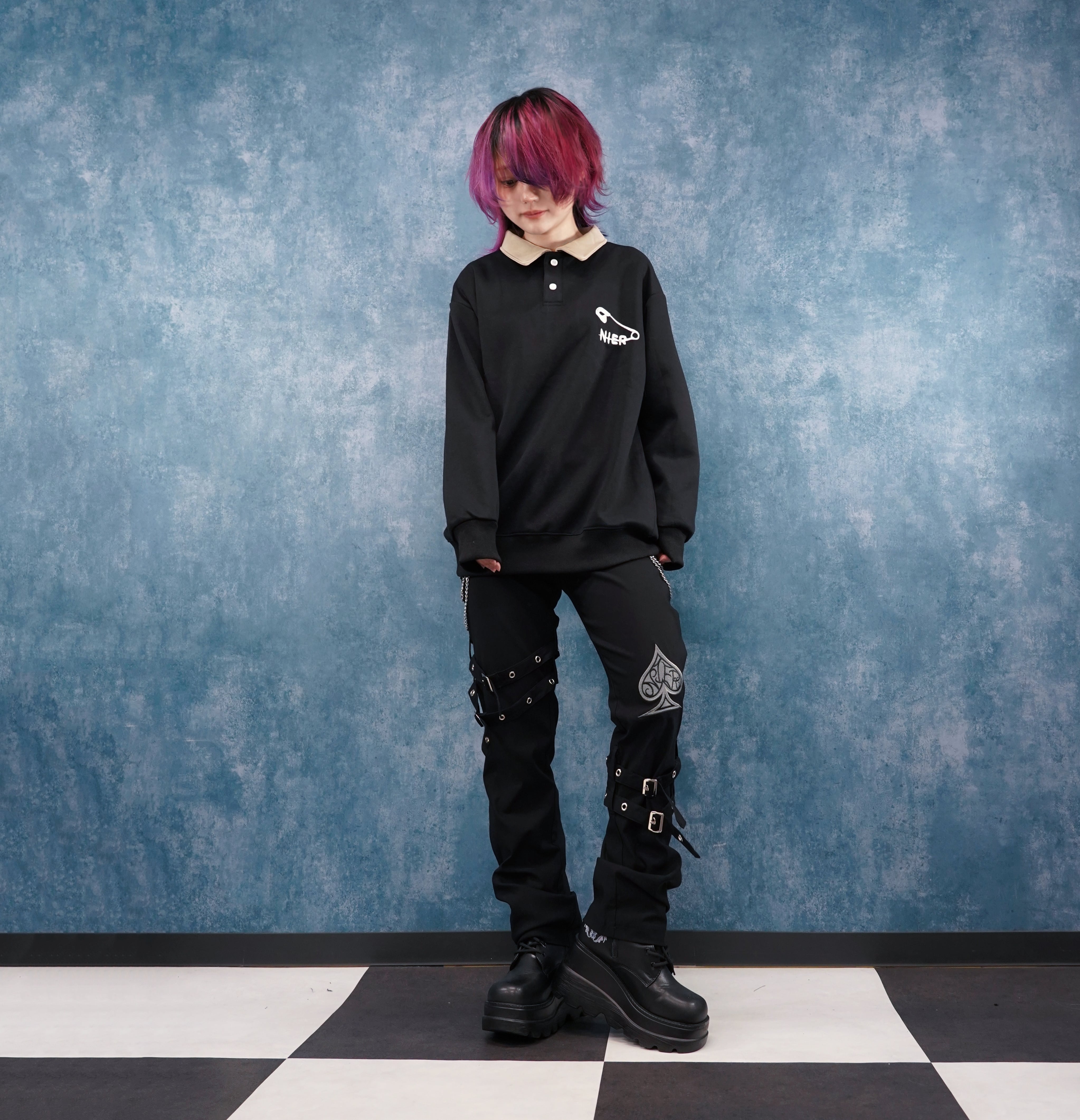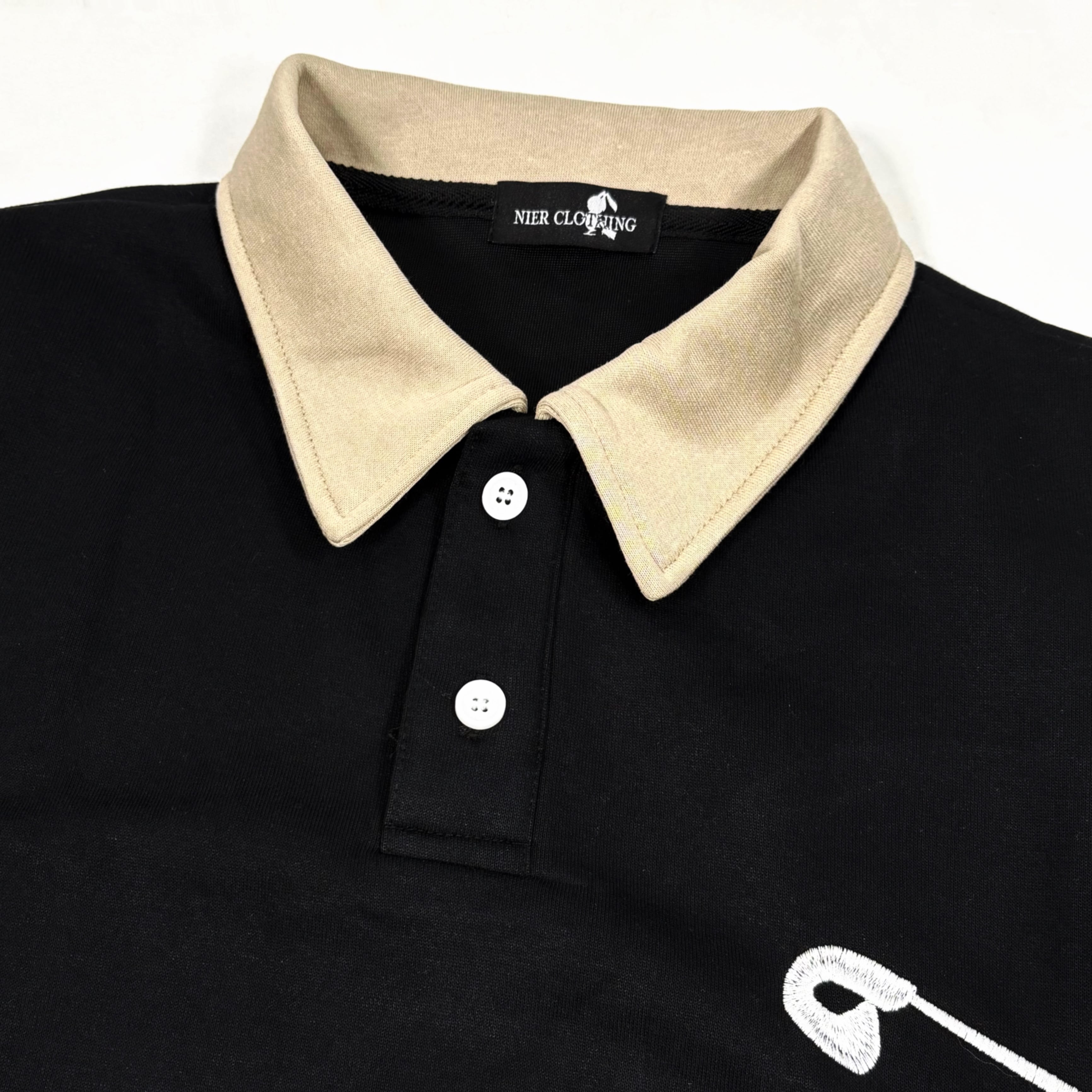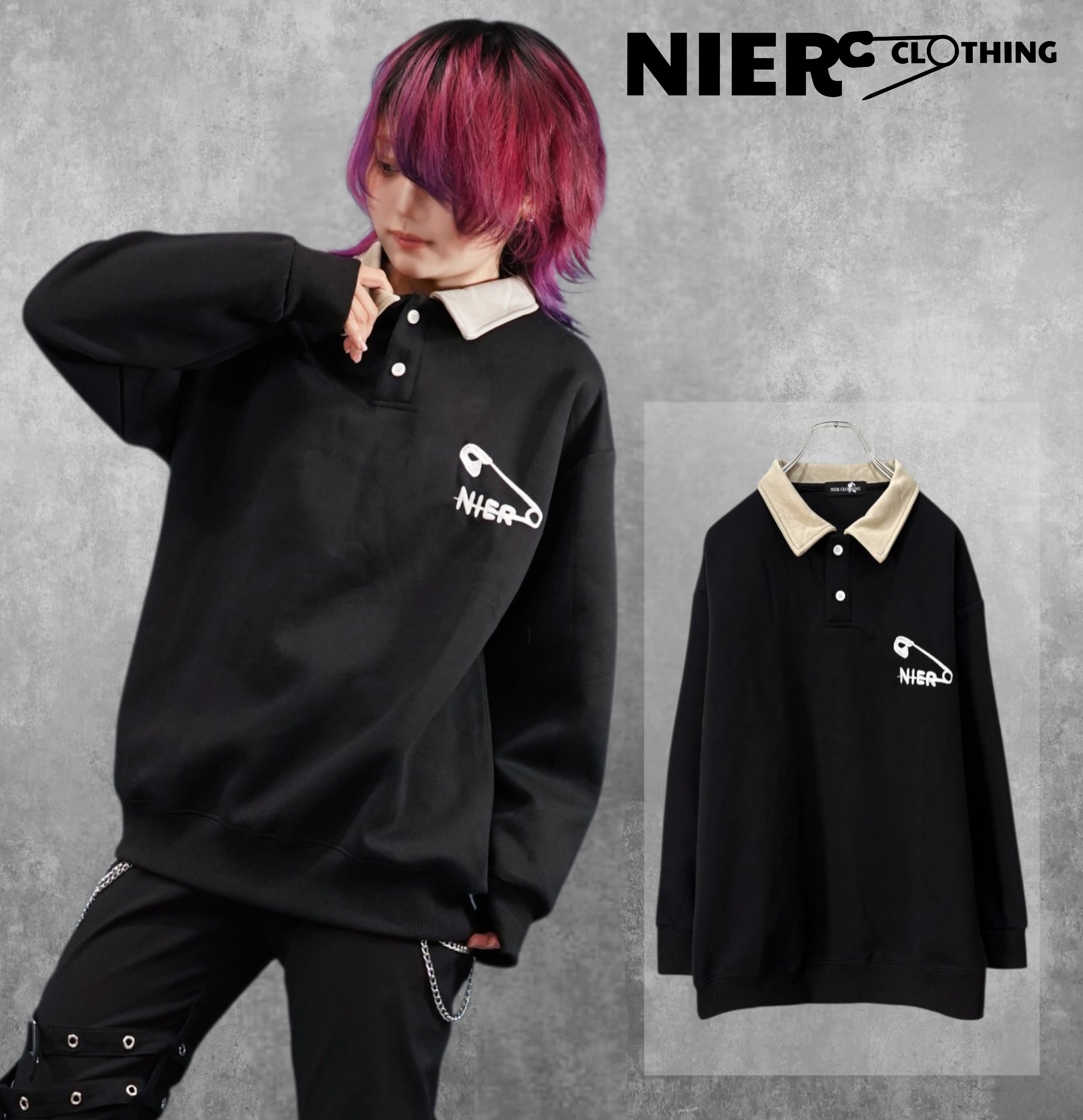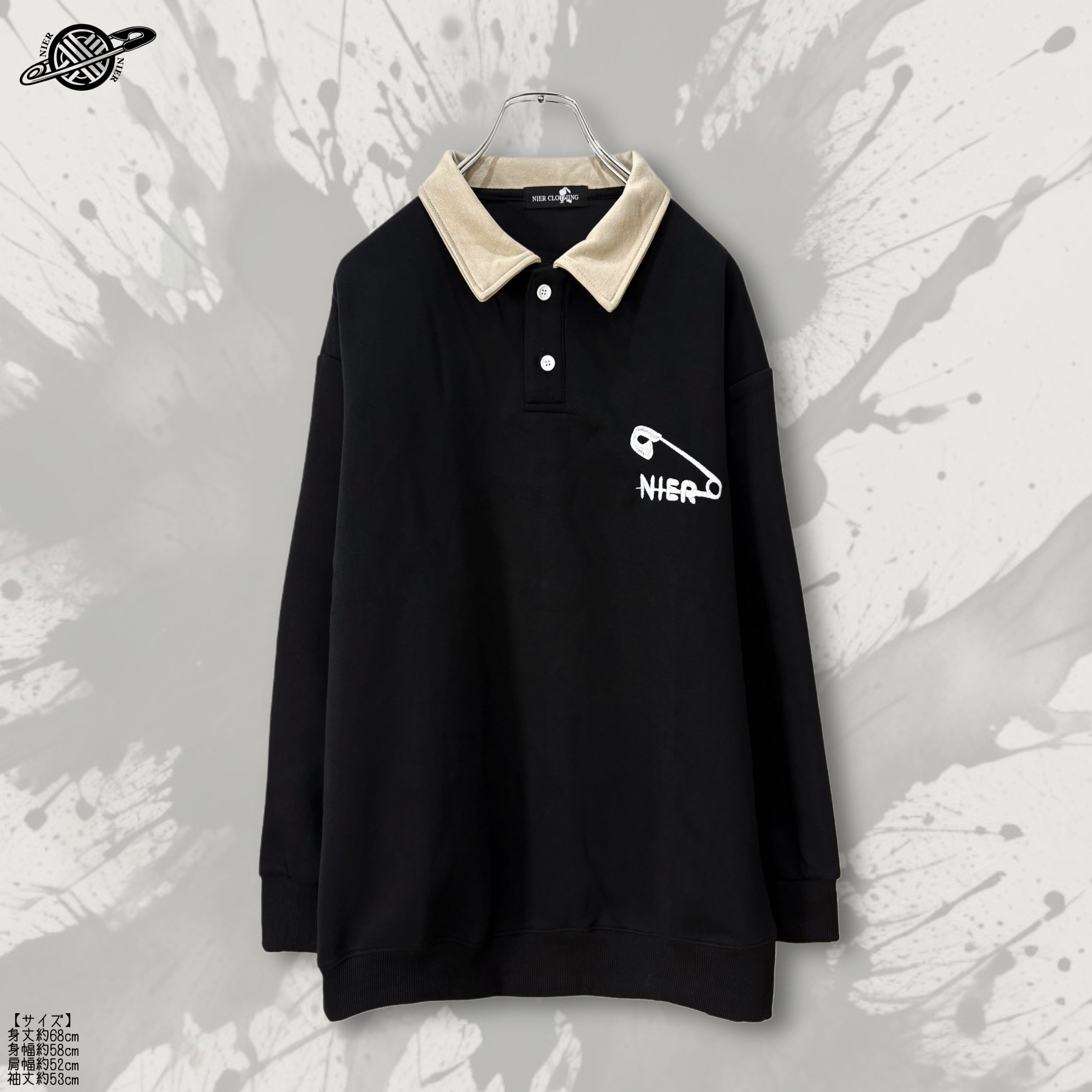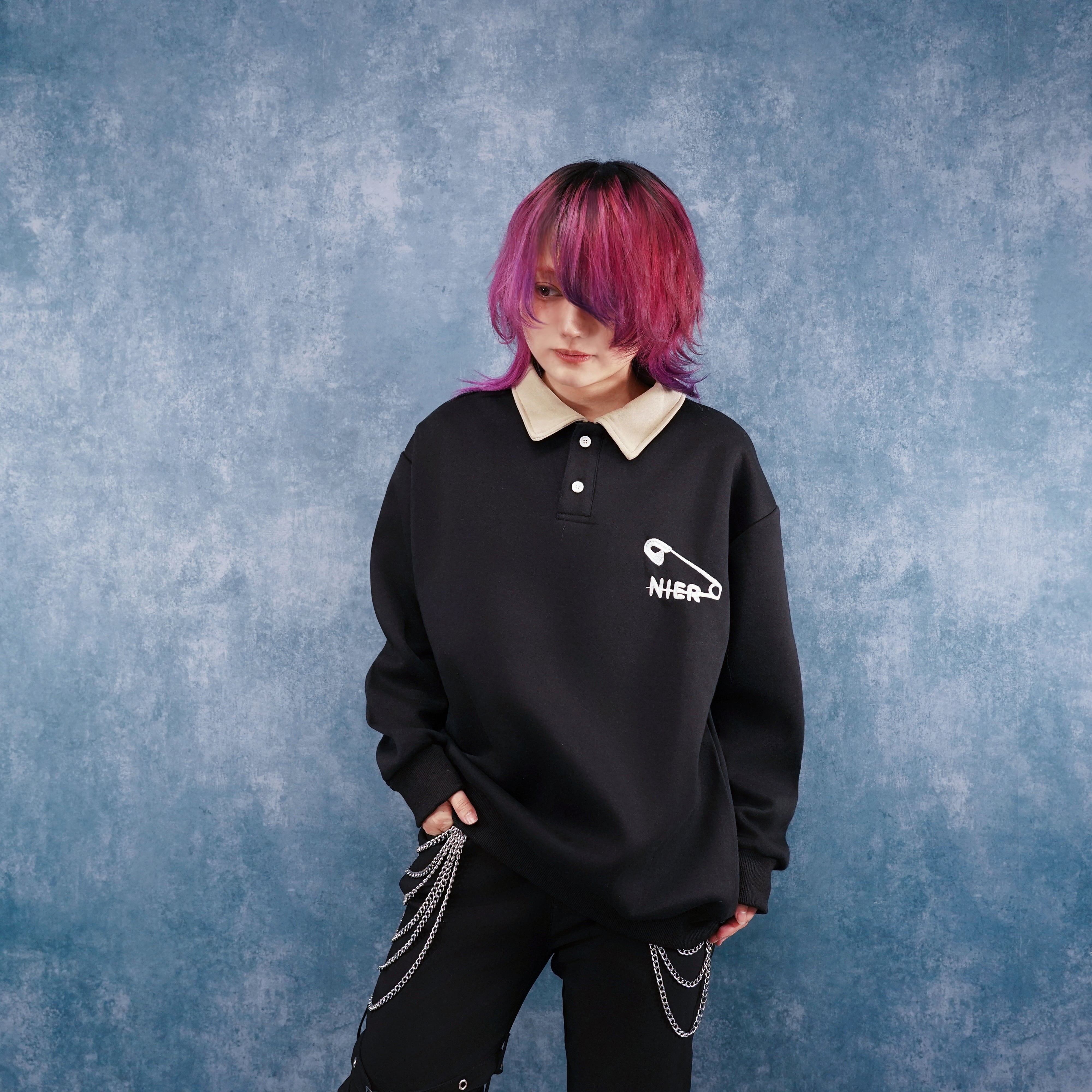 フロントには大きめの安全ピンモチーフと「NIER」ロゴを刺繍で配置。