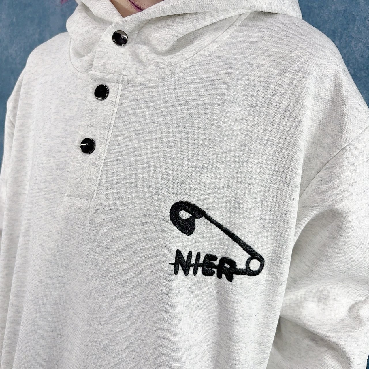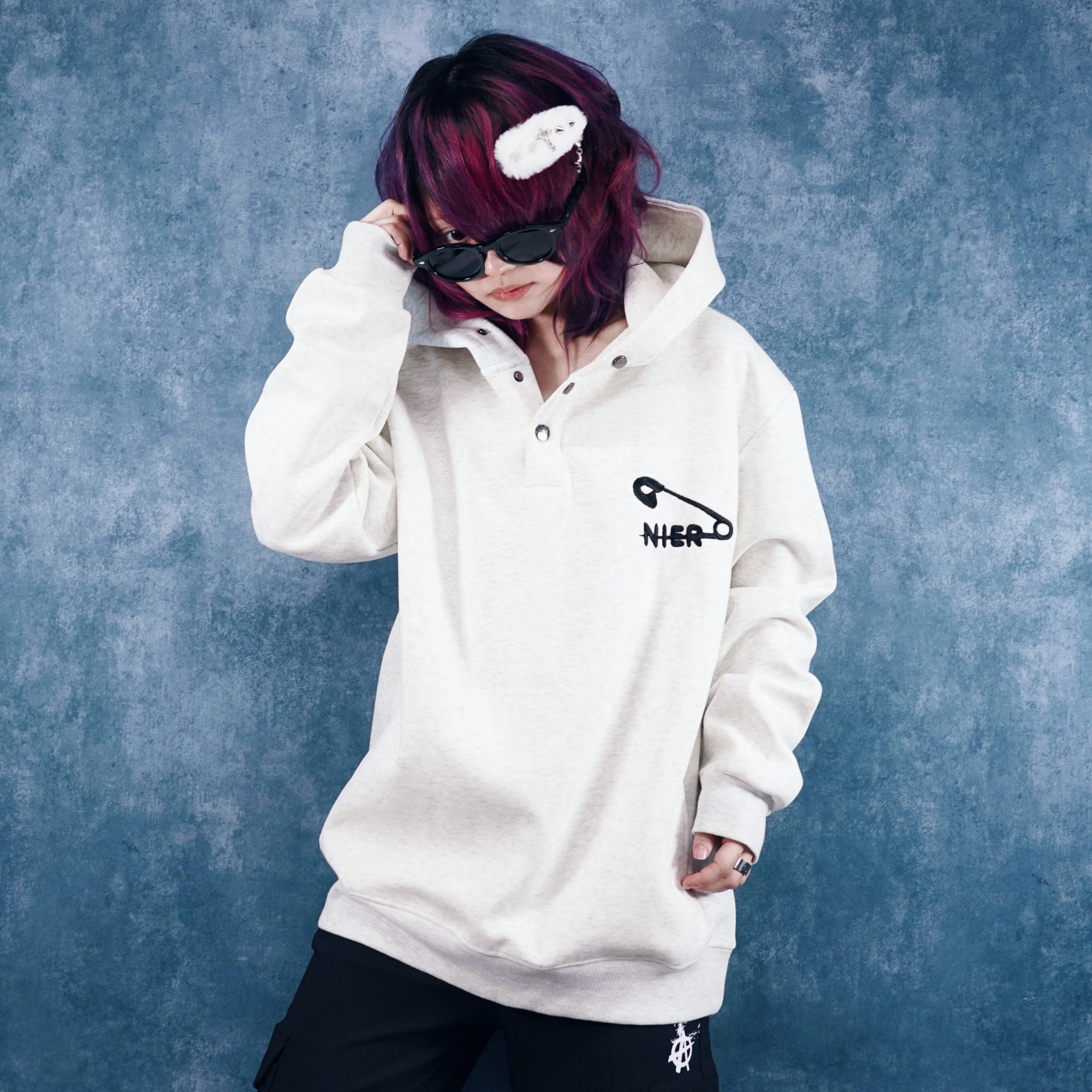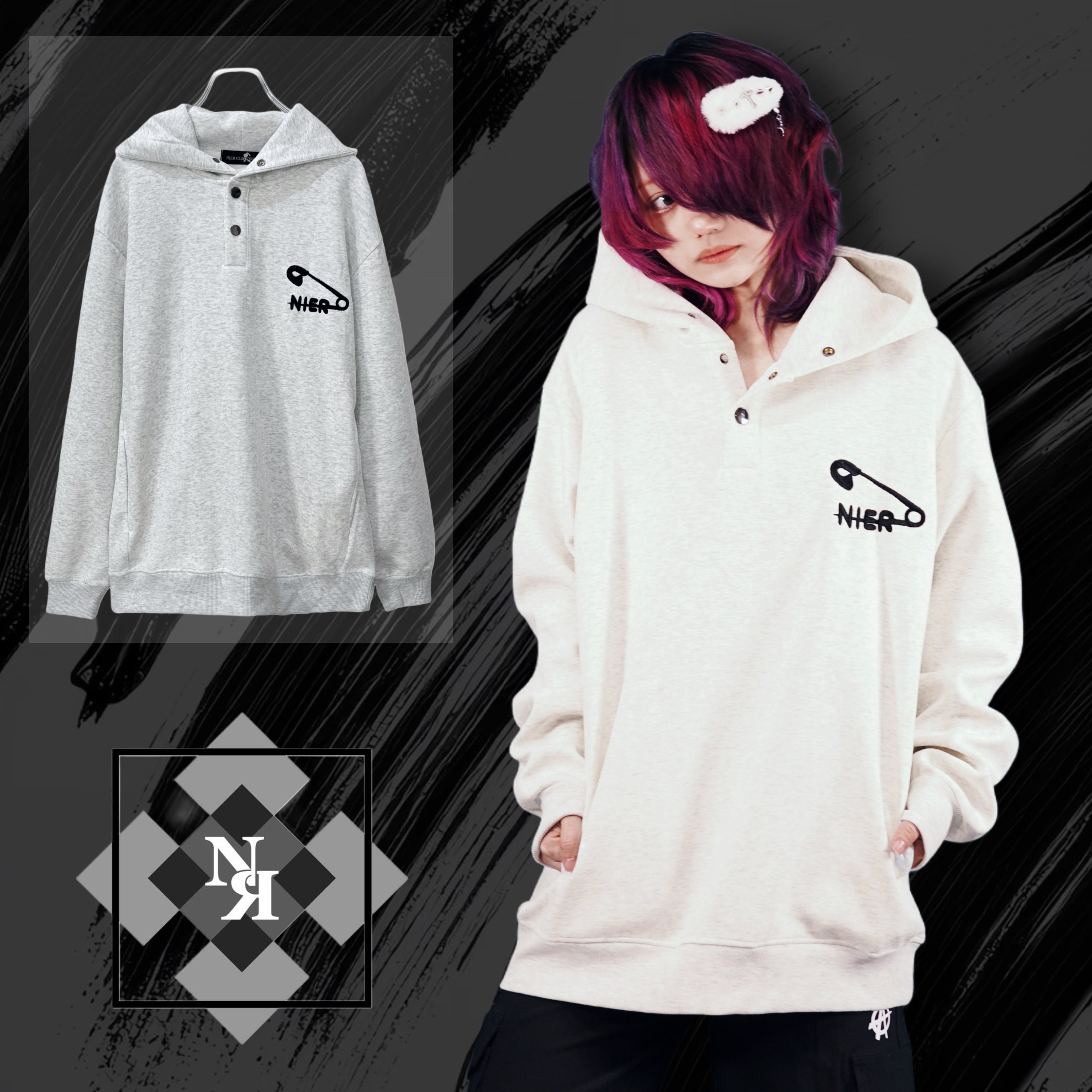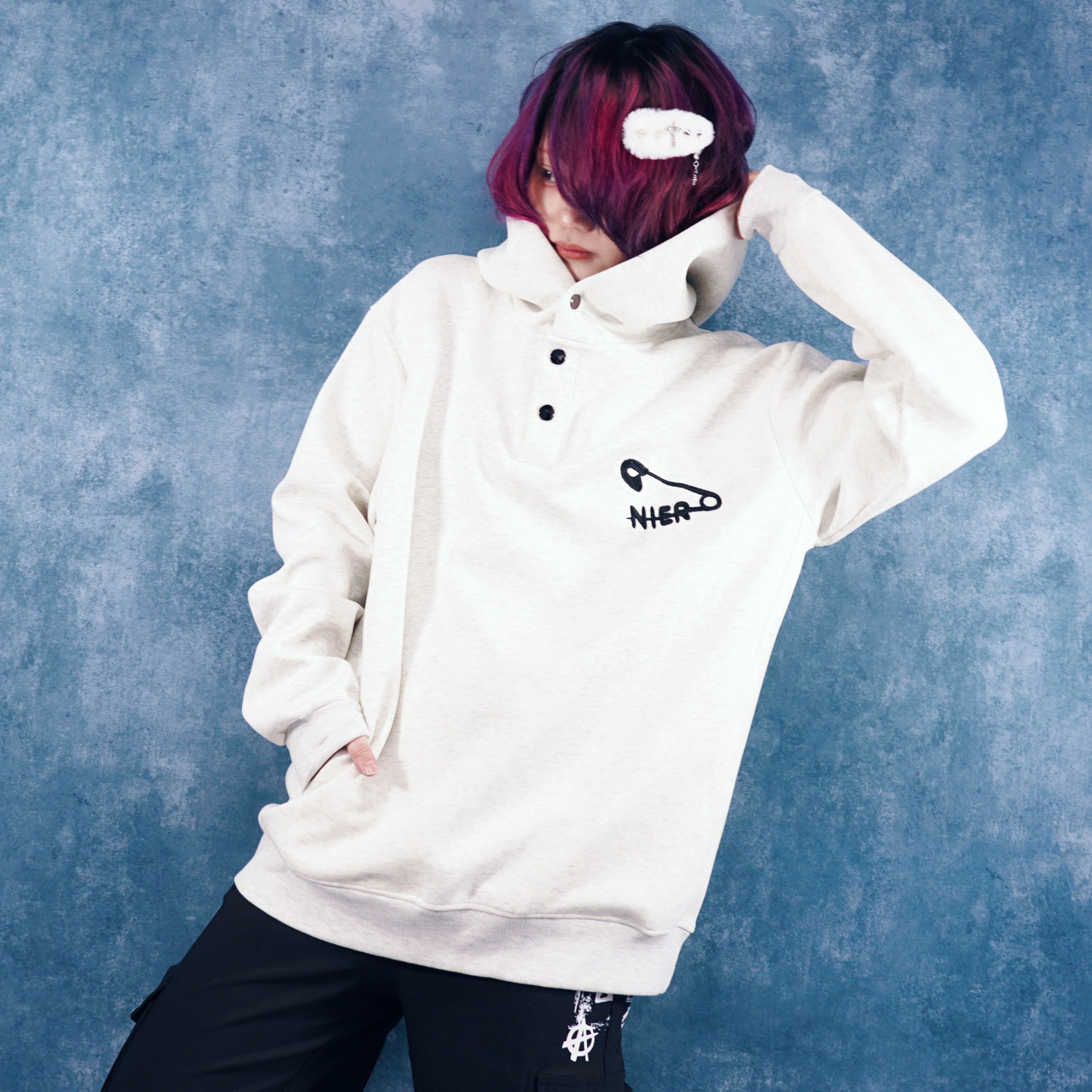 胸元に施された安全ピン×NIERの刺繍が目を惹く、