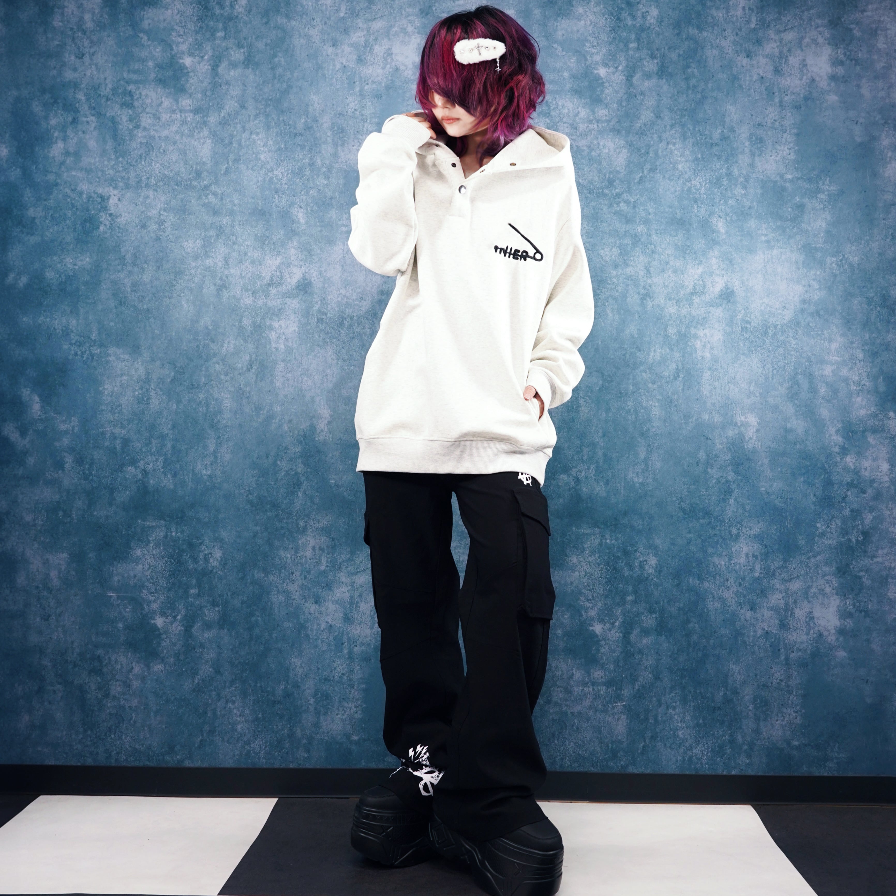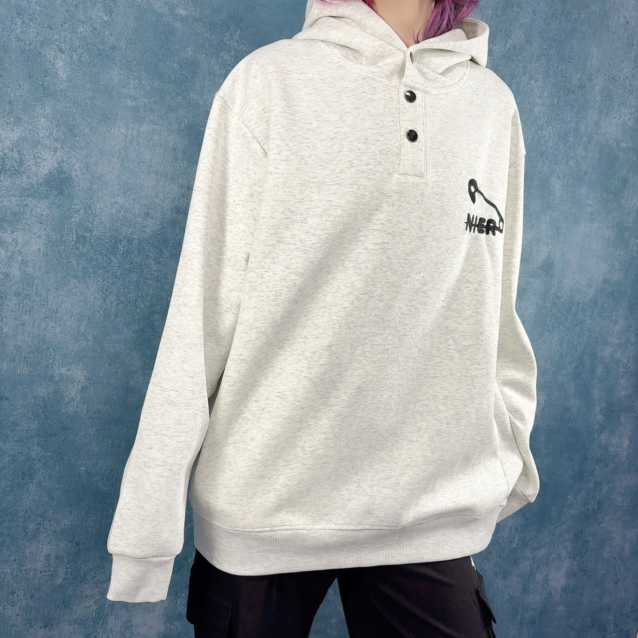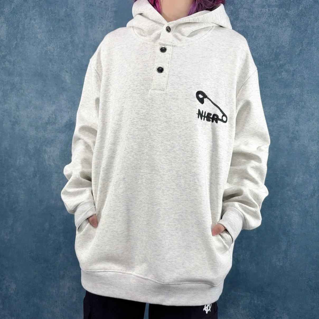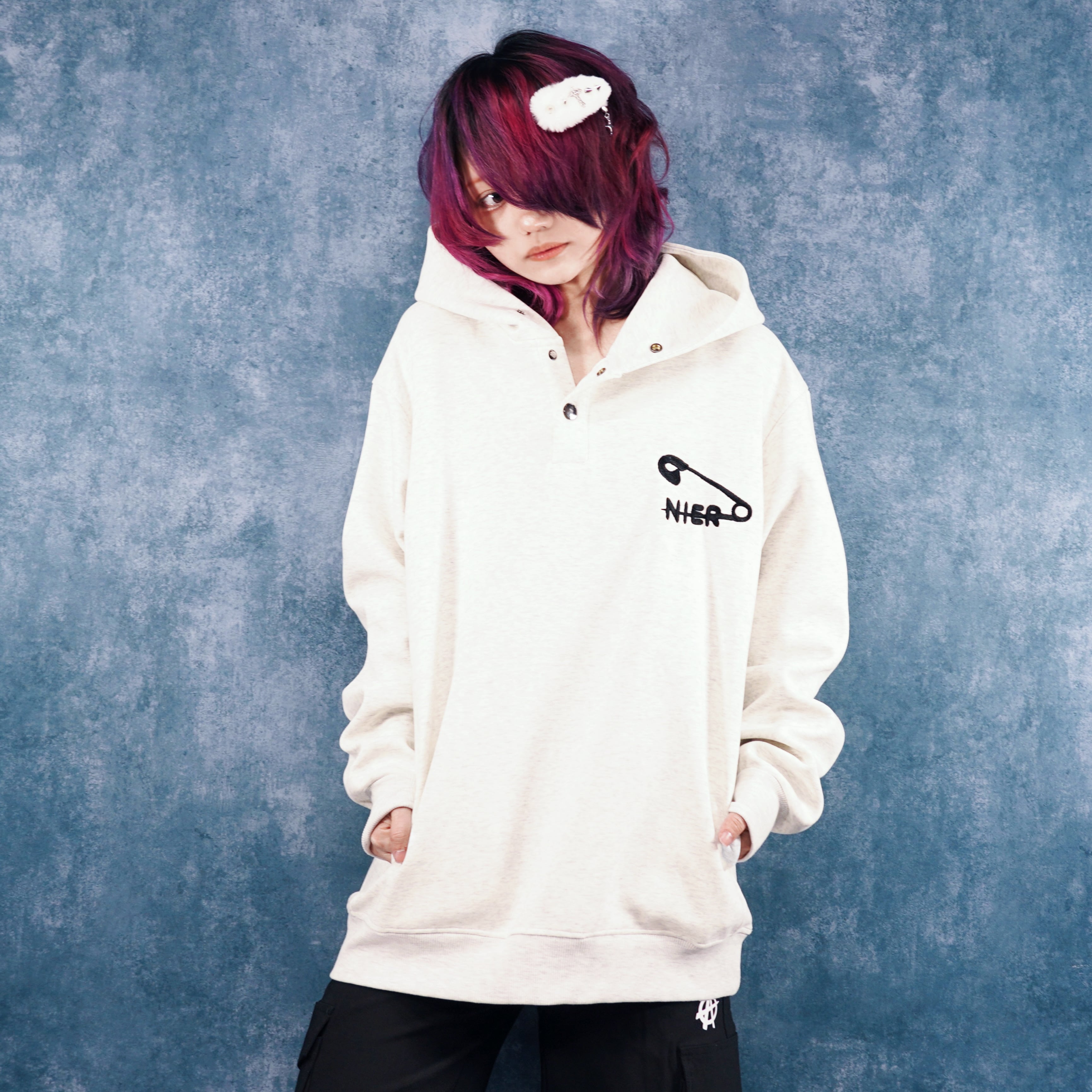 胸元に施された安全ピン×NIERの刺繍が目を惹く、