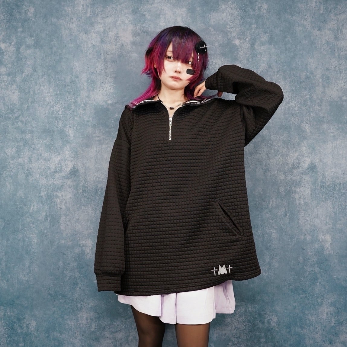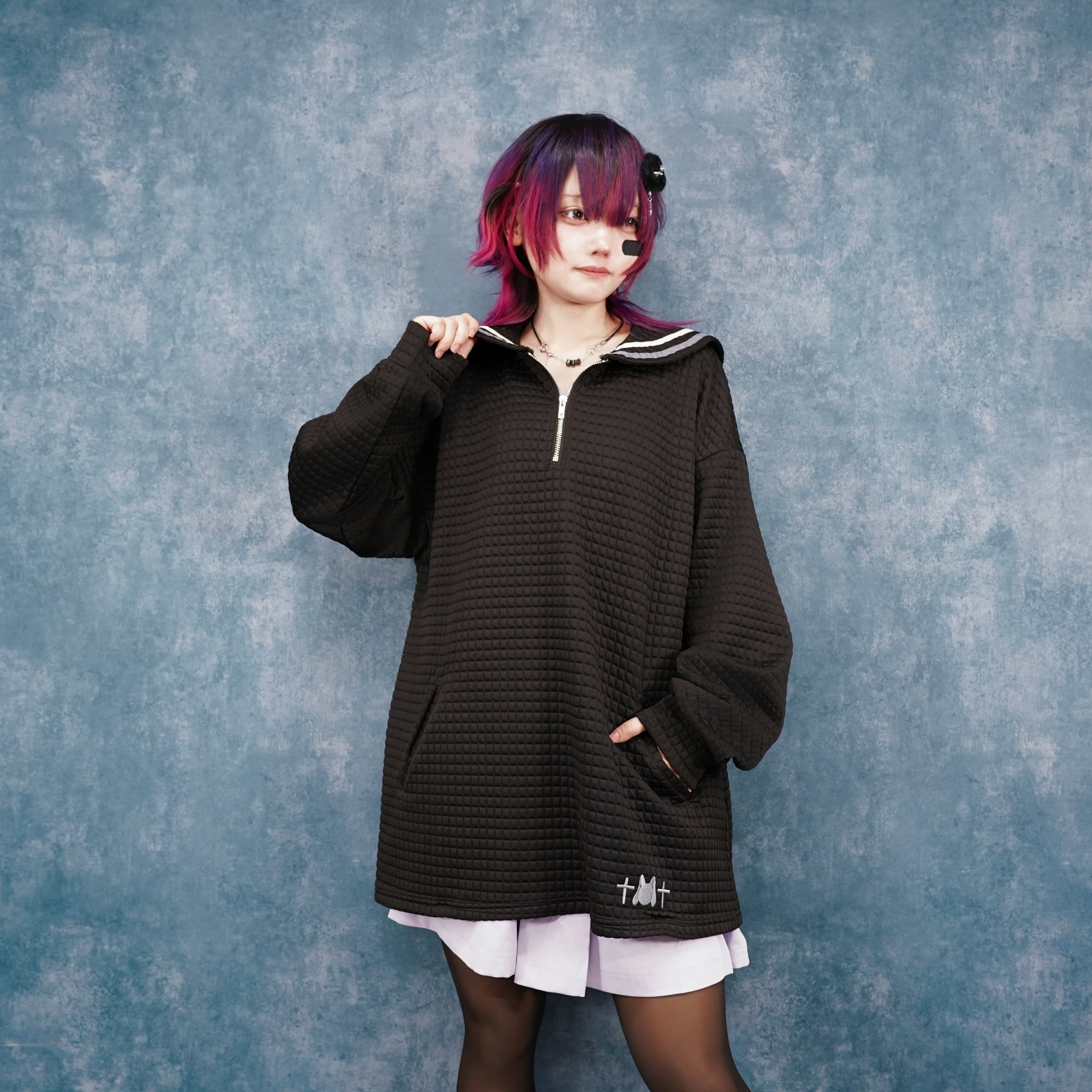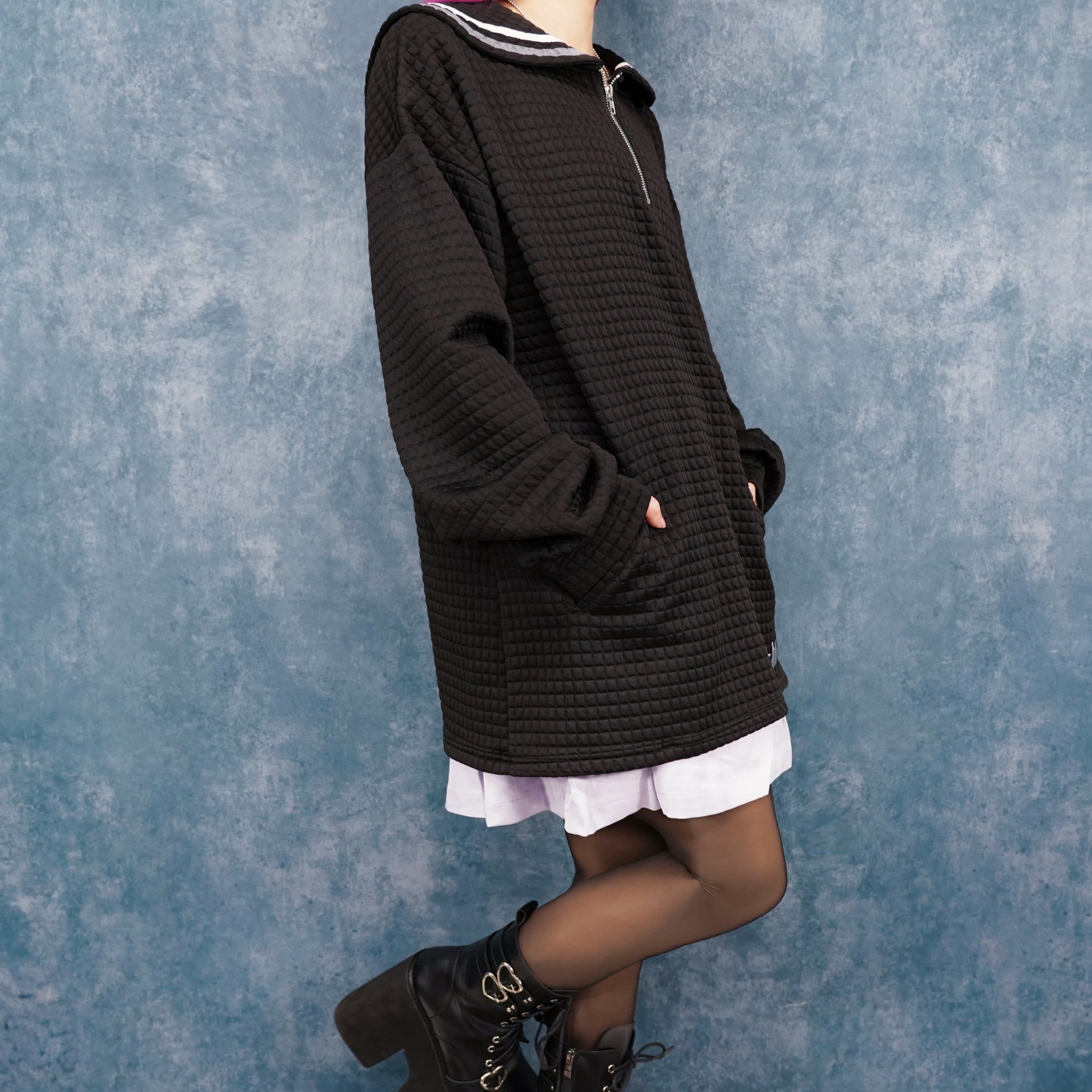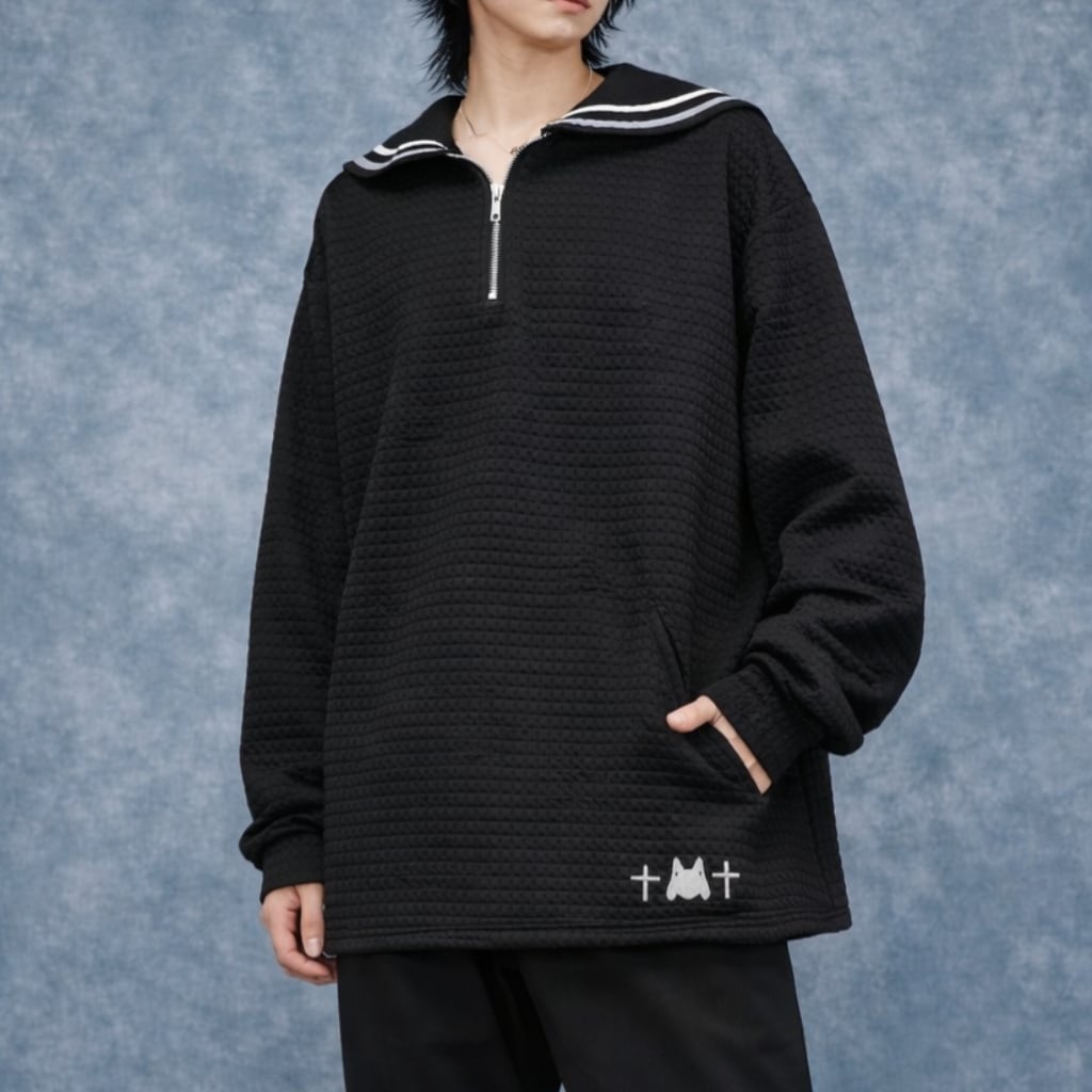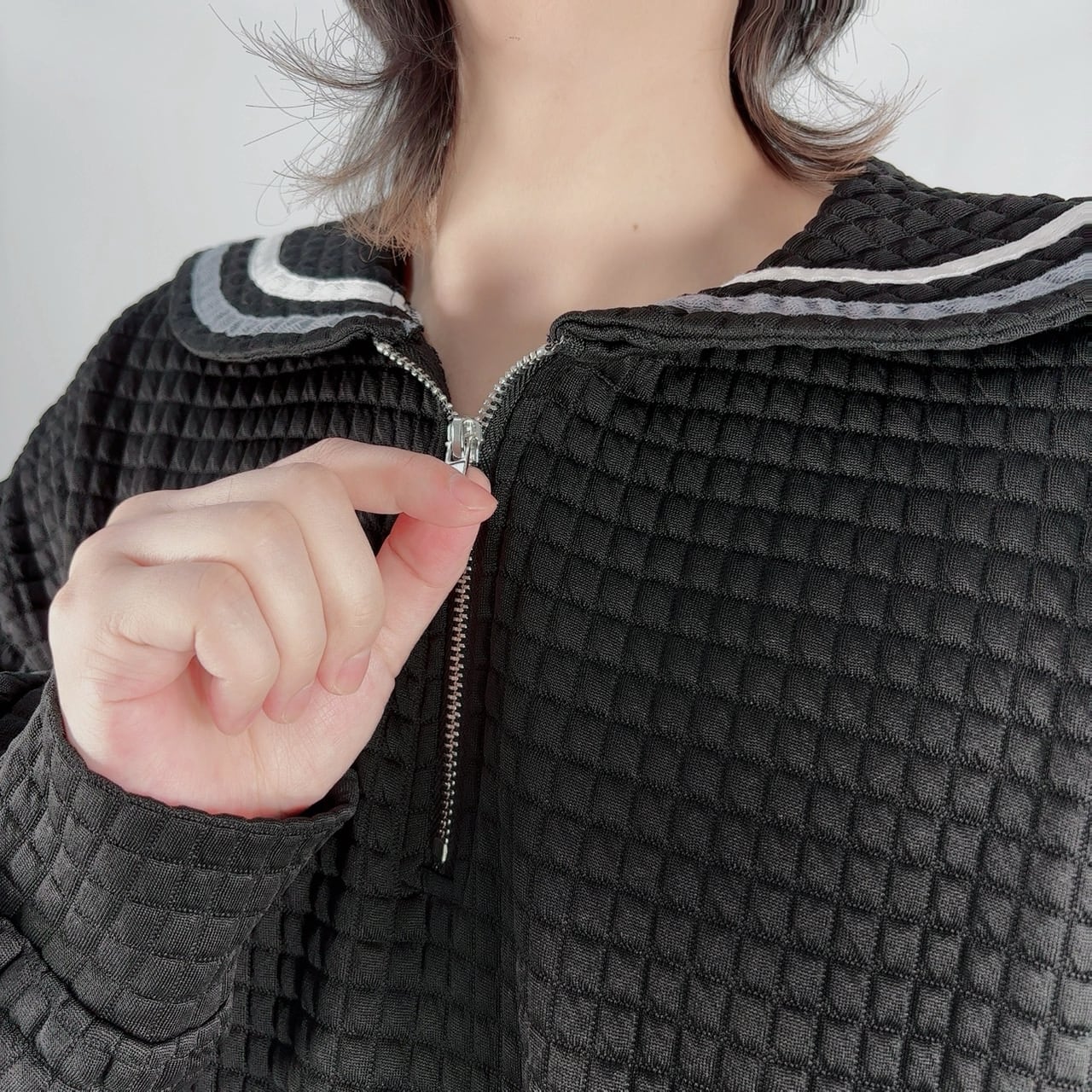《先着50点限定66%OFFプレゼント》UNISEXセーラー襟ハーフZIPワッフルトップス【BLACK】