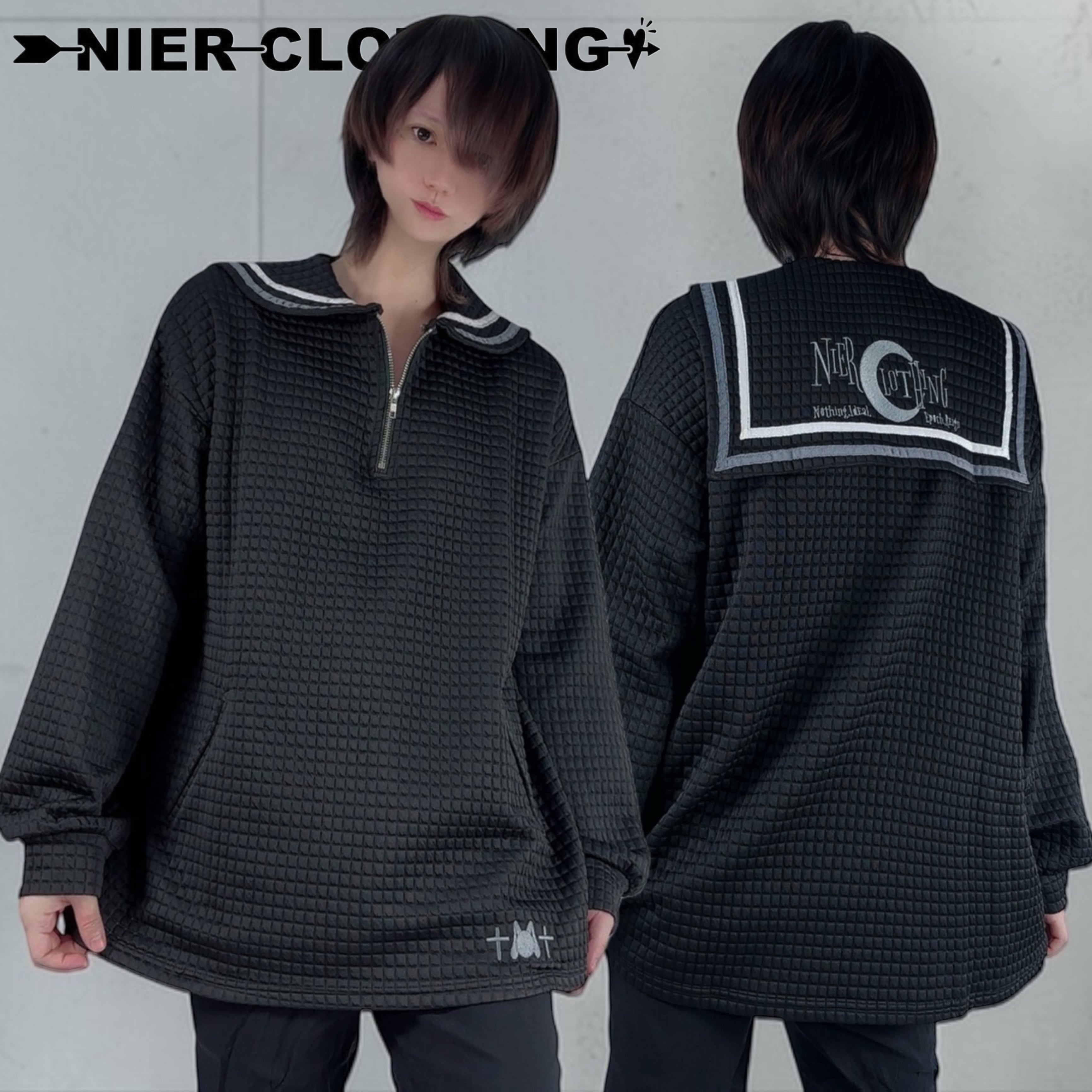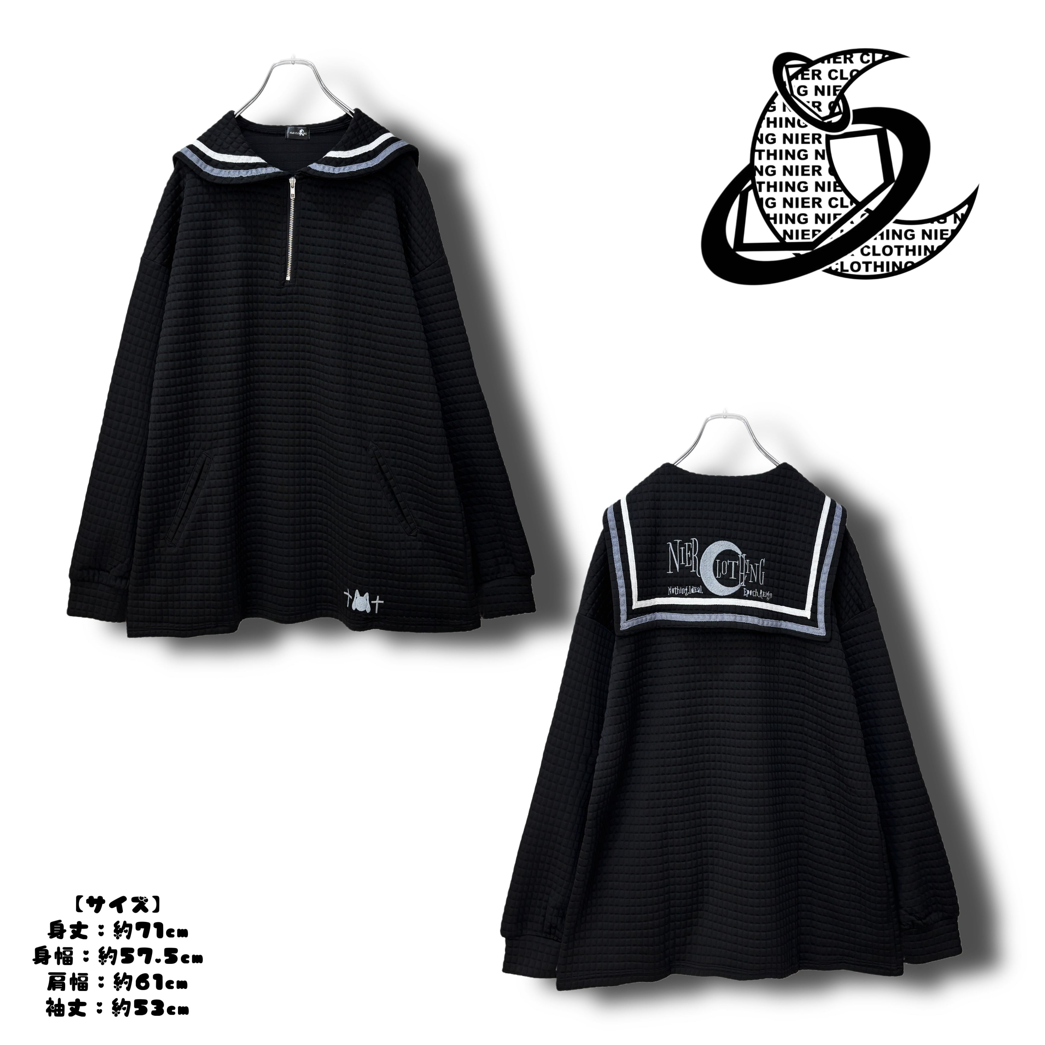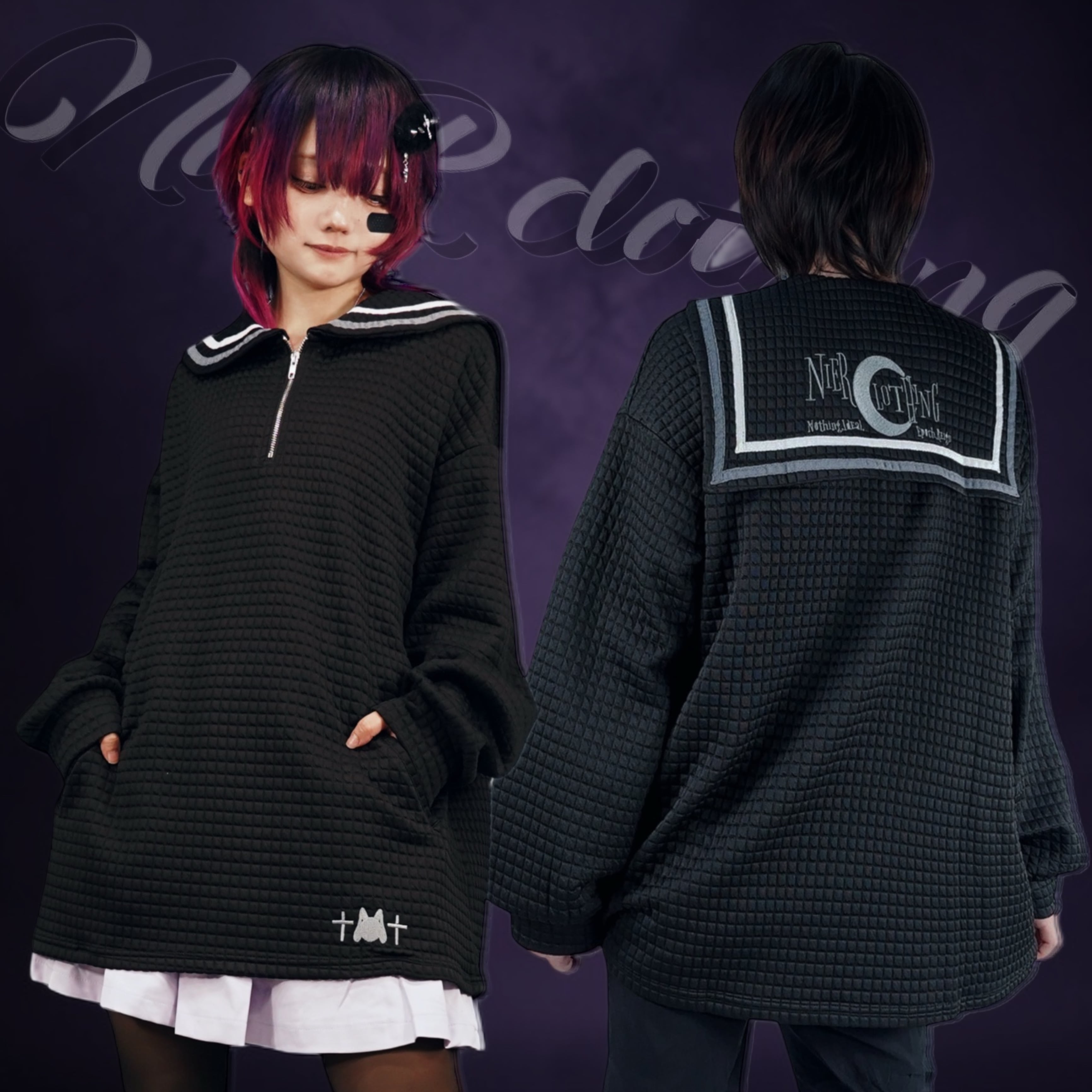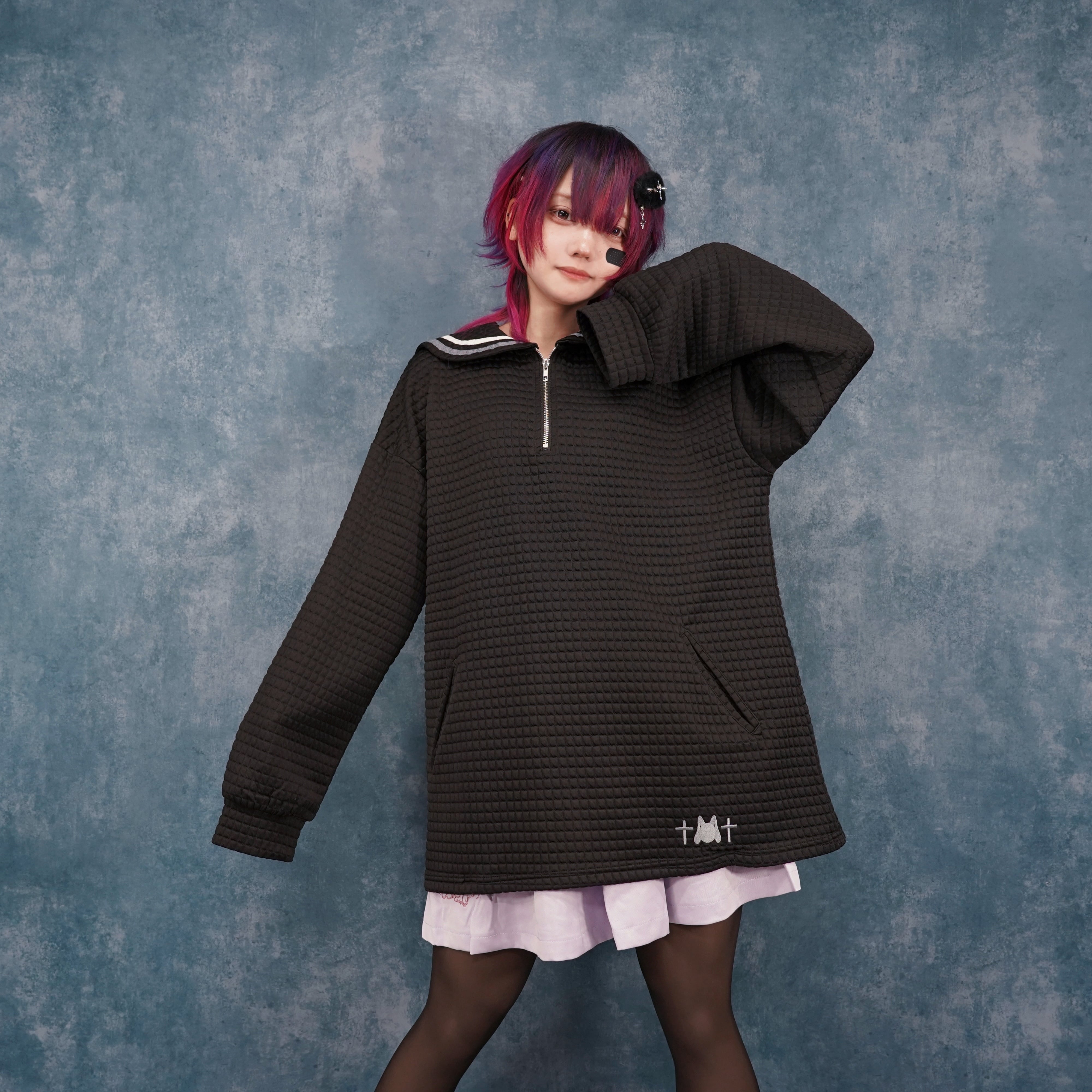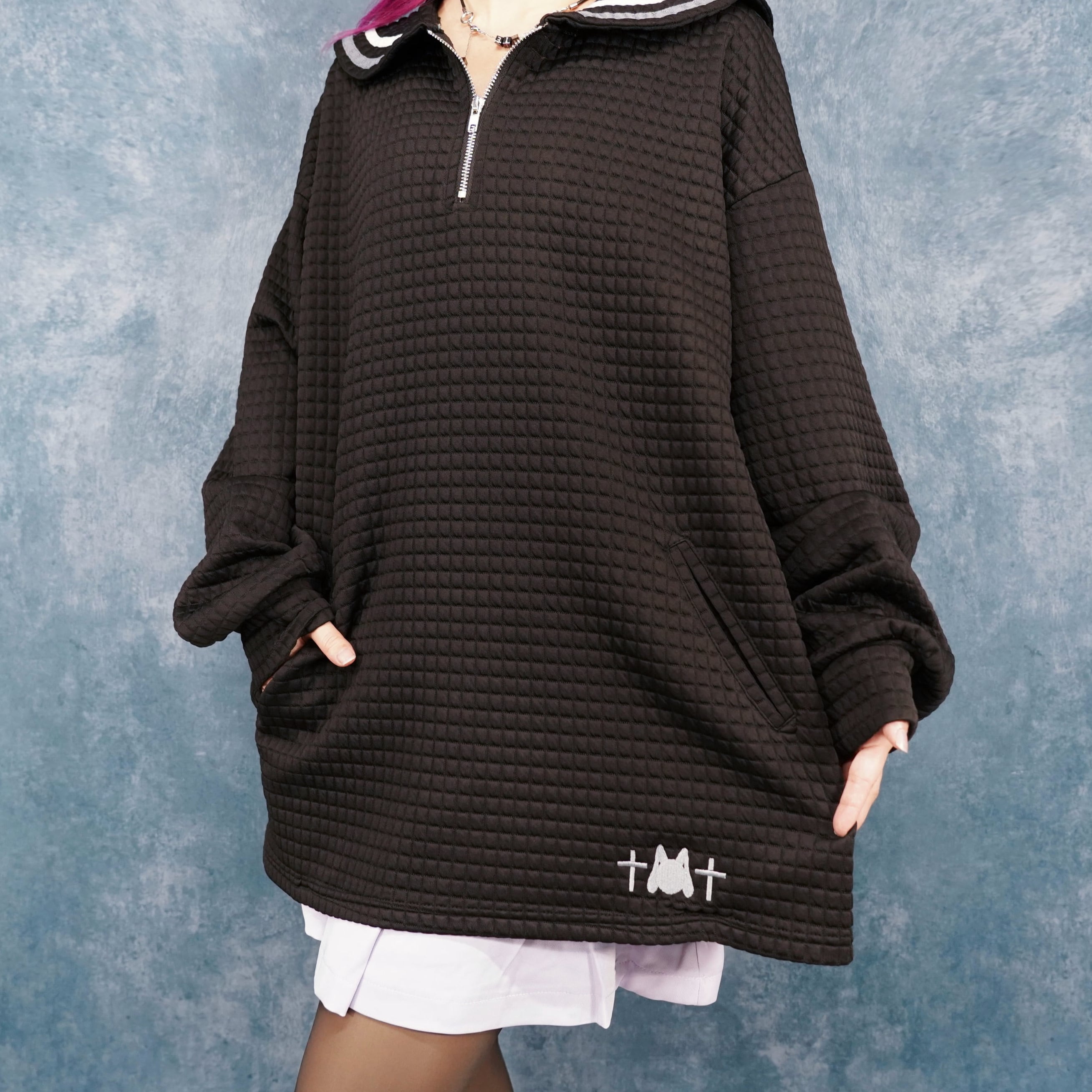 《先着50点限定66%OFFプレゼント》UNISEXセーラー襟ハーフZIPワッフルトップス【BLACK】