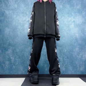 ブラックベースなのでボトムスを選ばず、セットアップ風のコーデやモード・ストリートスタイルにも相性抜群です。