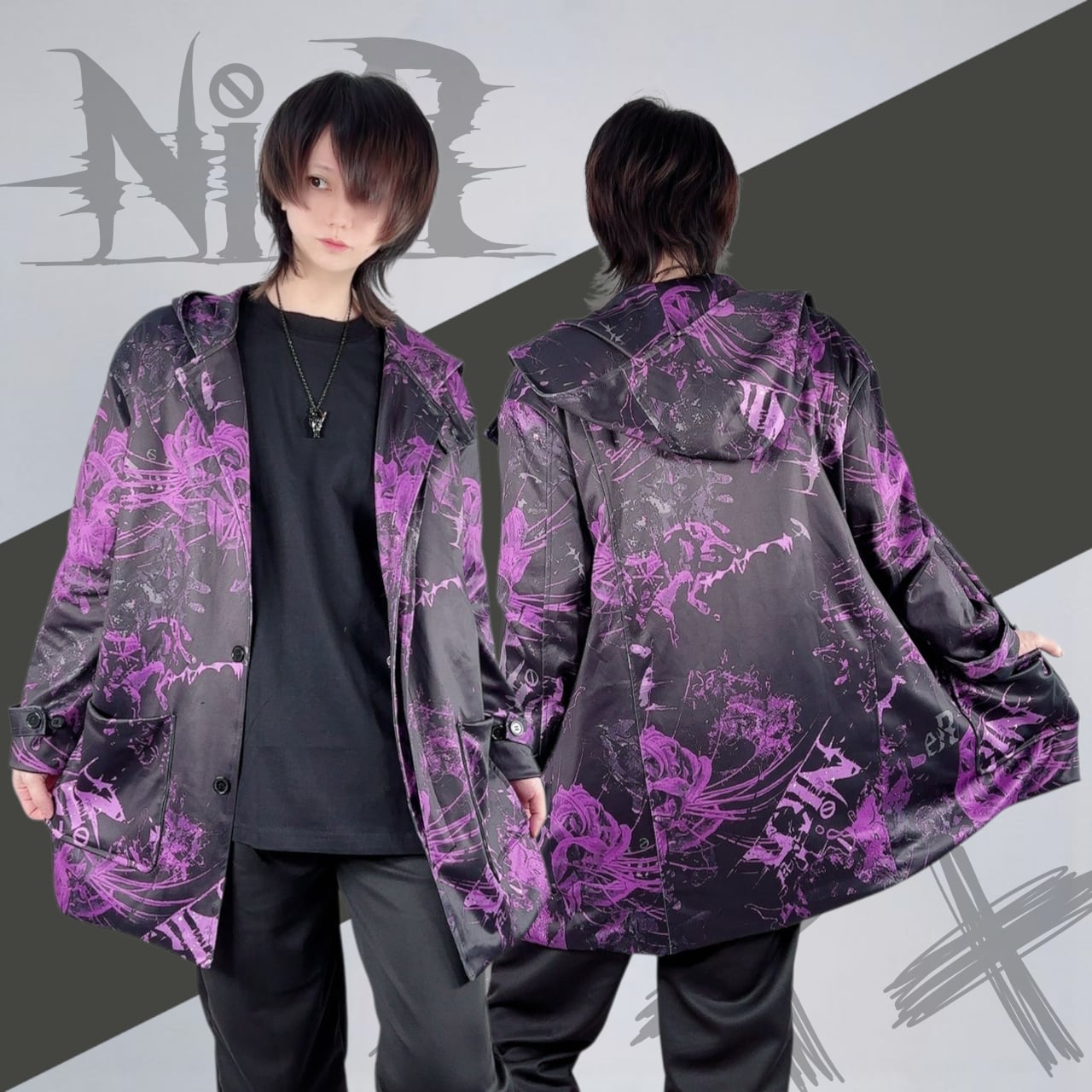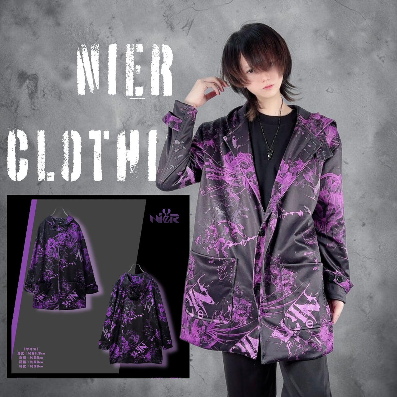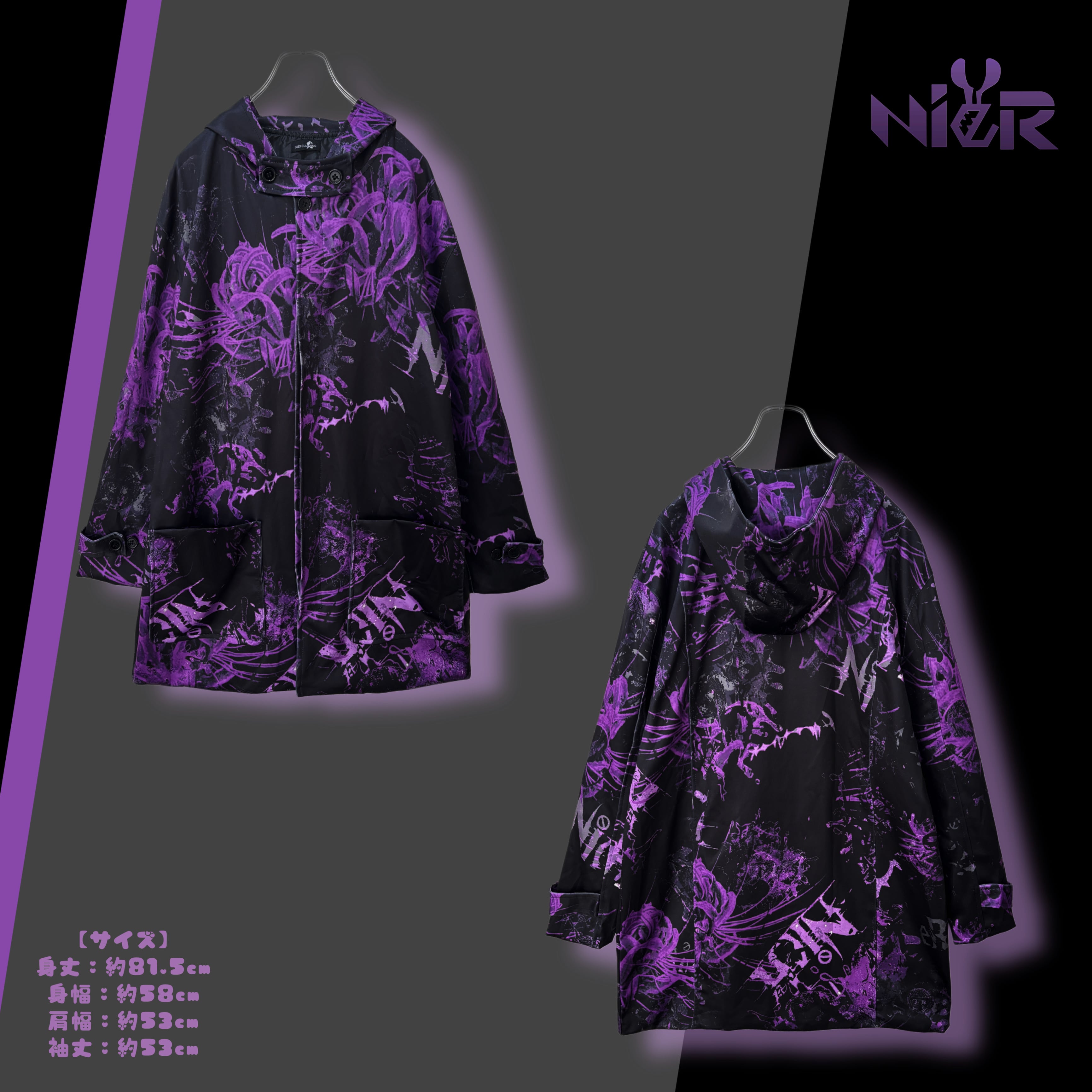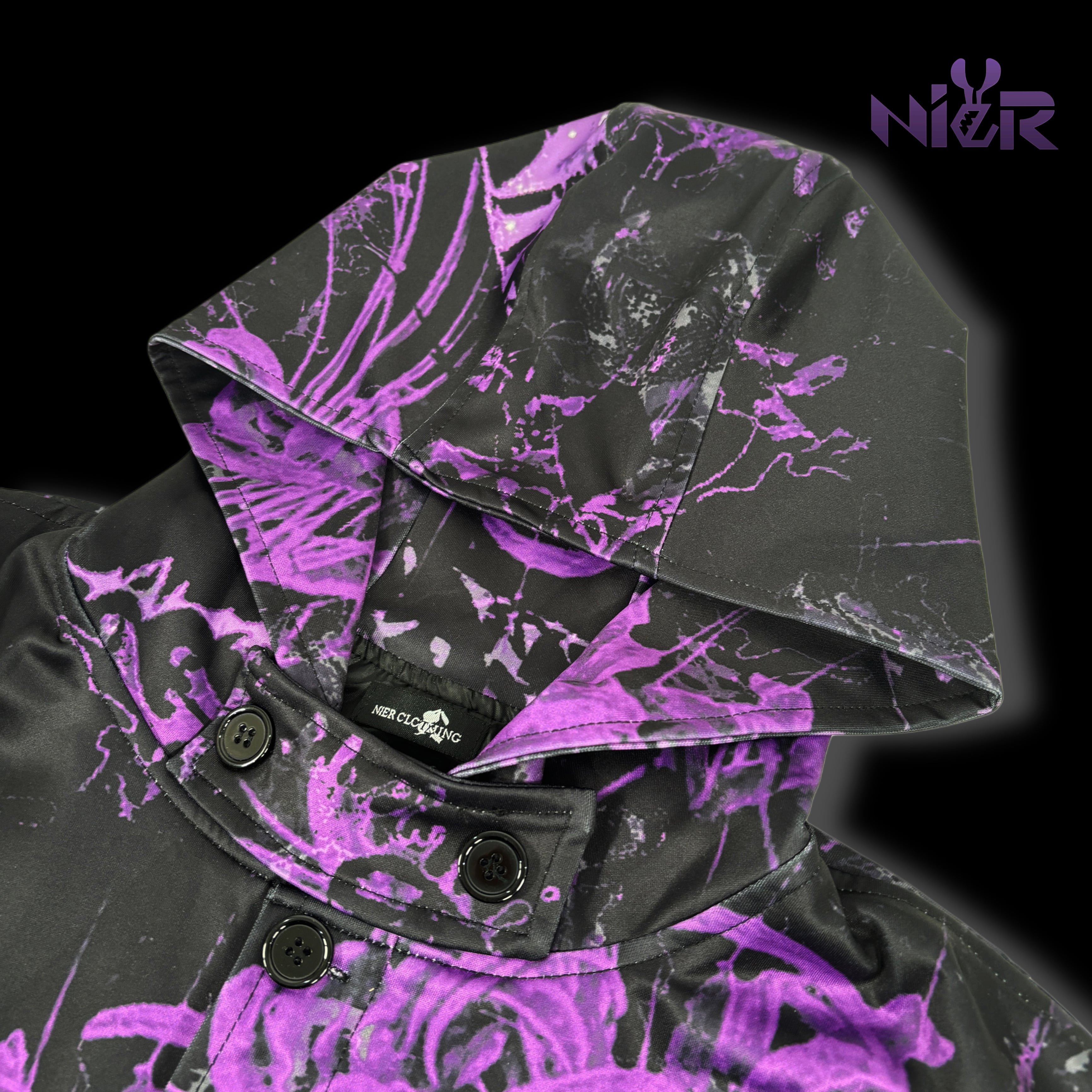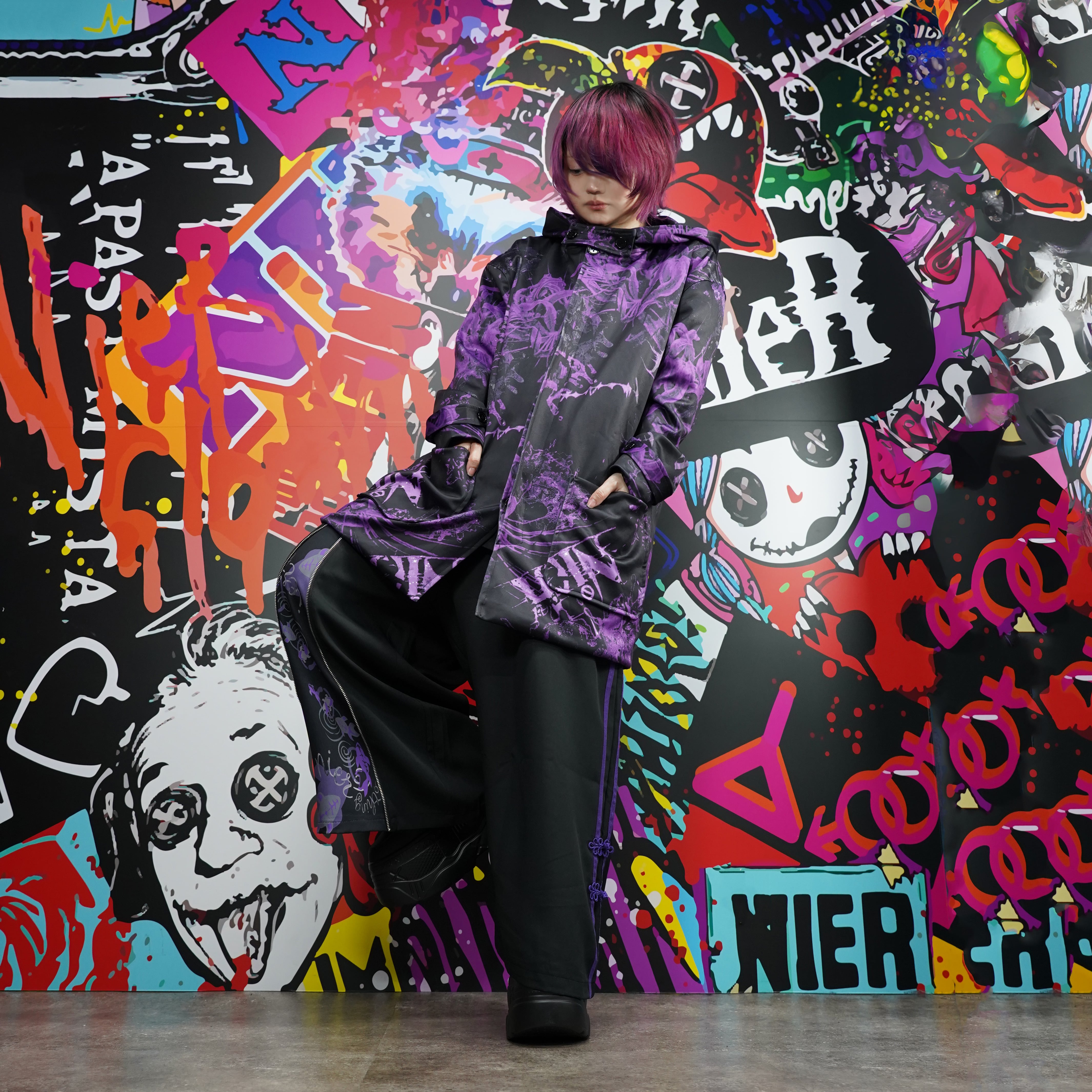ブラックをベースに、鮮やかなパープルの彼岸花を全面に落とし込んだNIERらしいダークでアート感のあるデザイン。