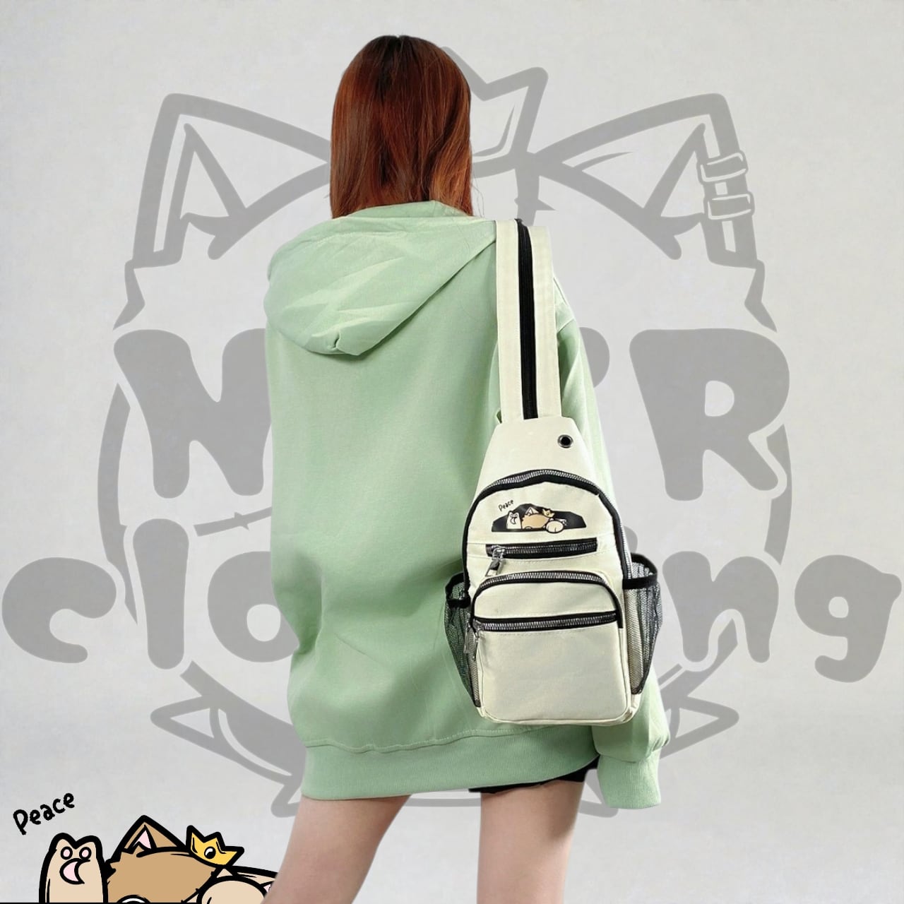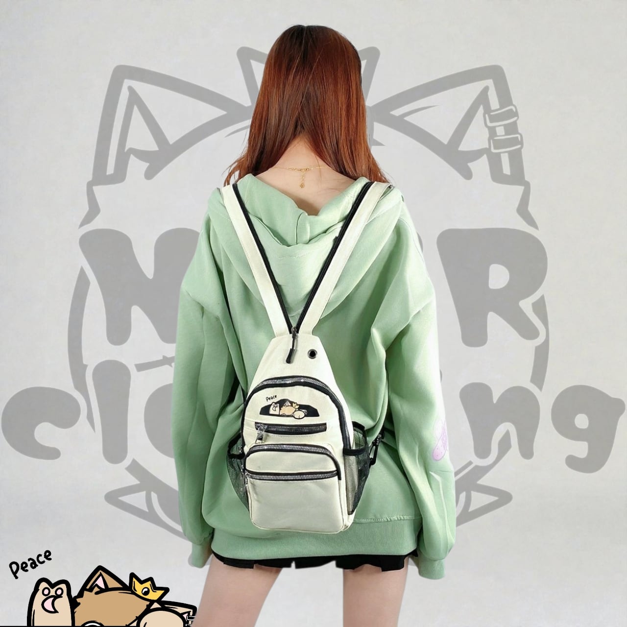 ・フロントにはピースするミケがひょっこり覗くプリント入り