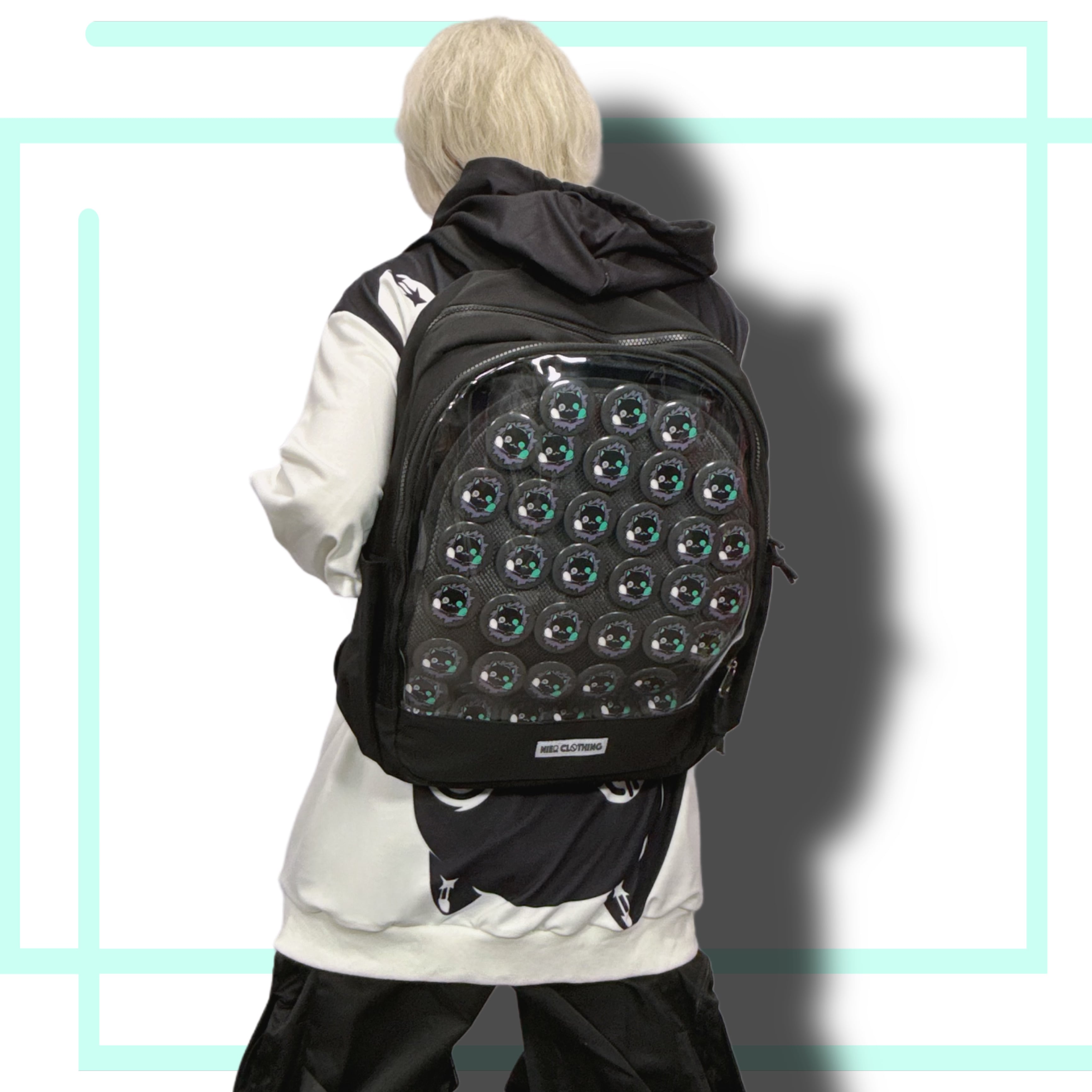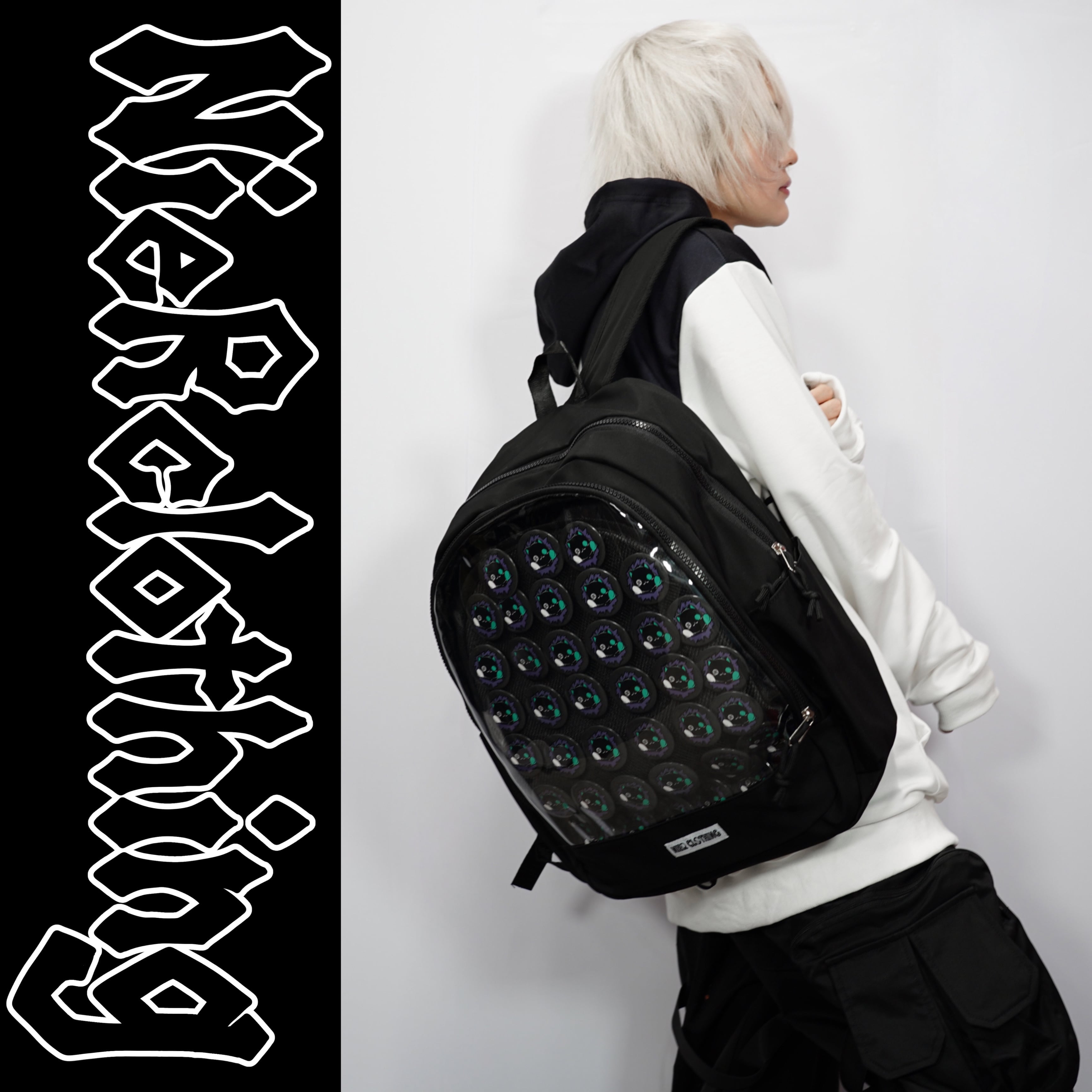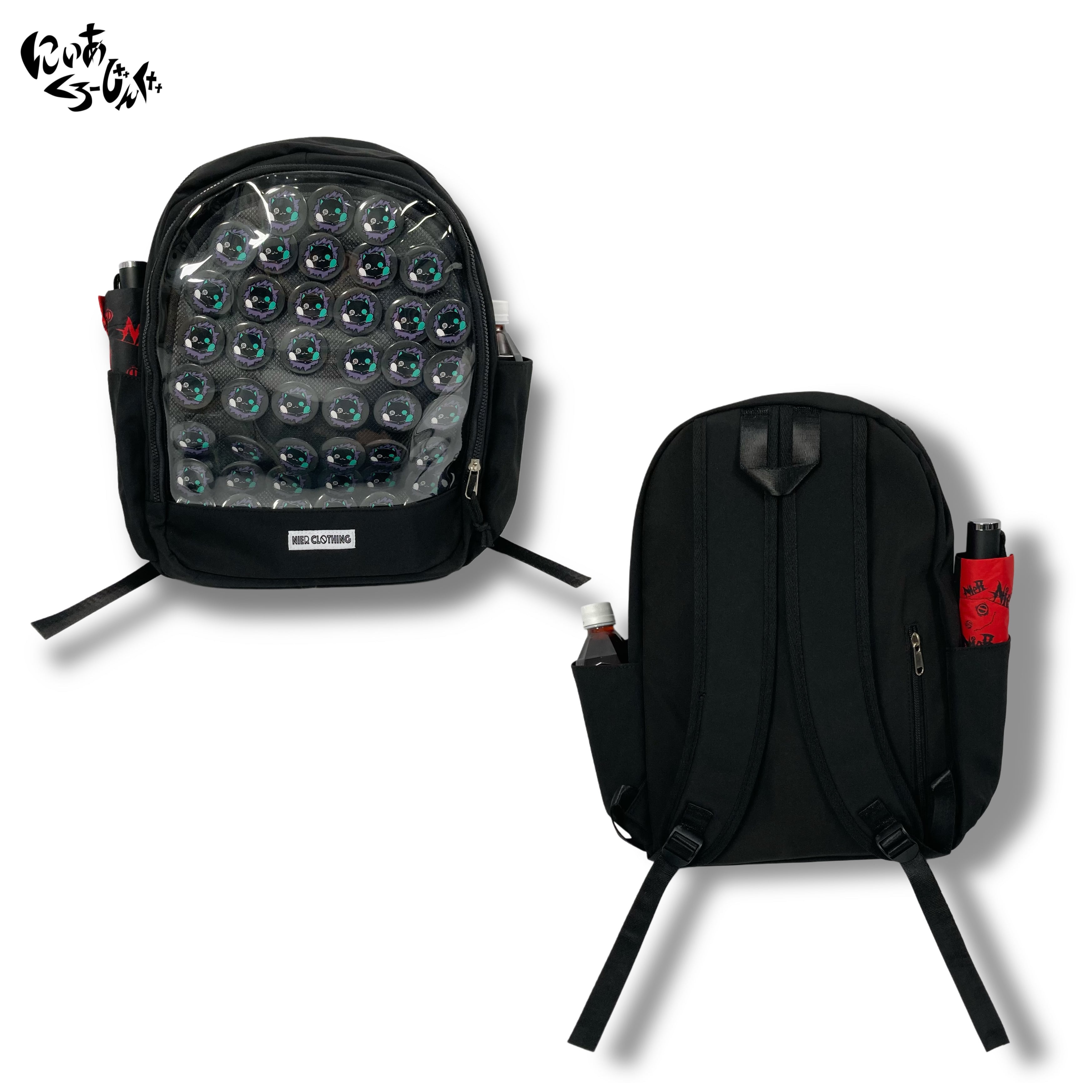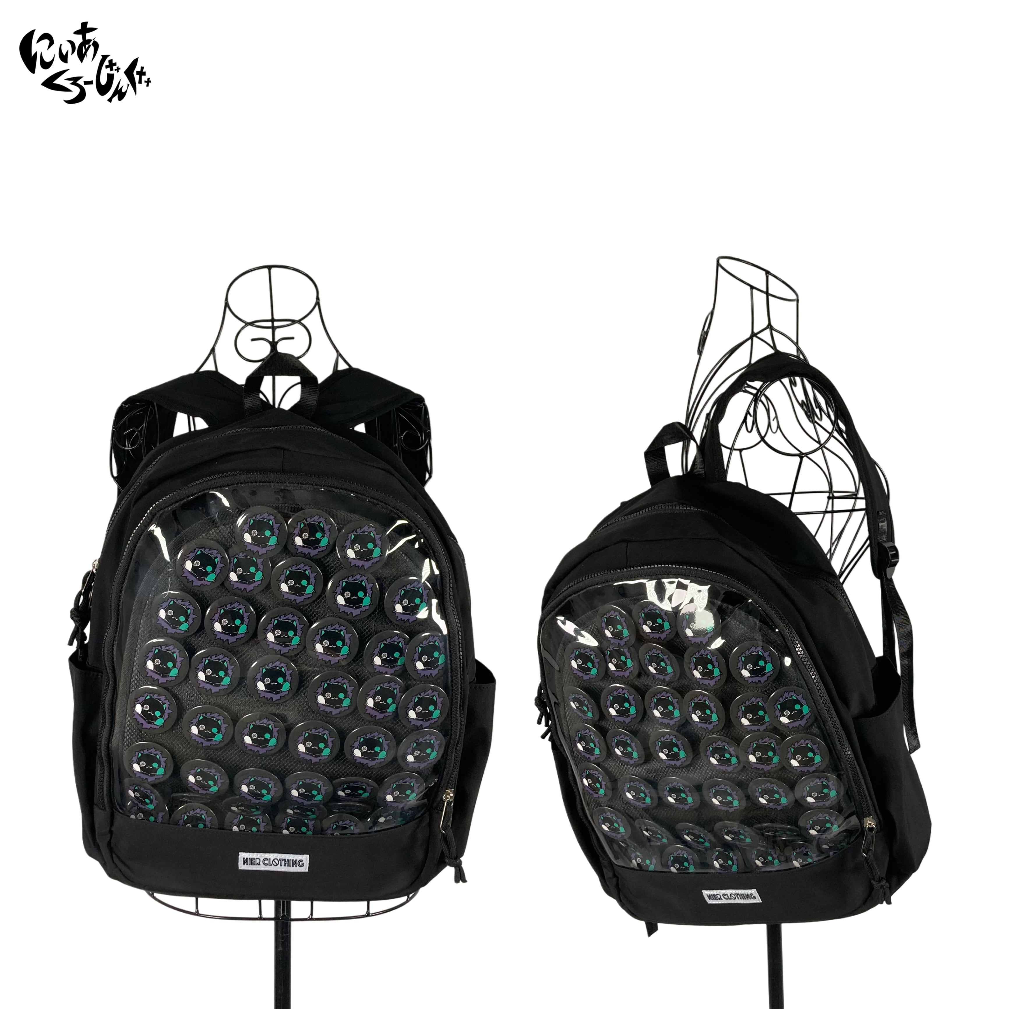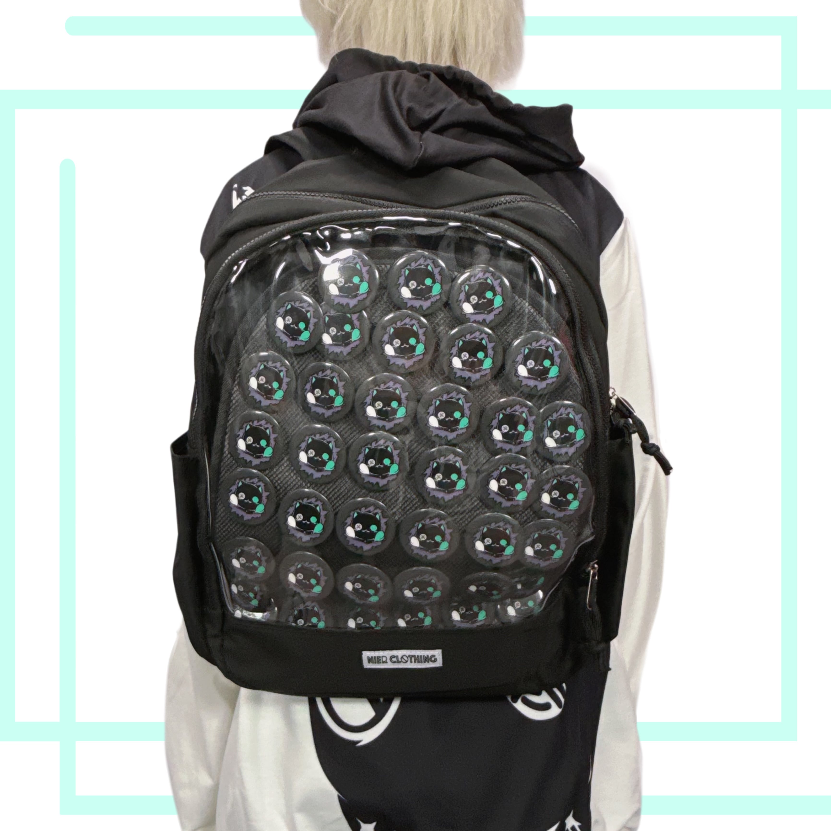 手前のジッパーを開けると、中は1面メッシュ素材になっているので、鞄に穴を開ける事なく缶バッジをお付け頂けます。