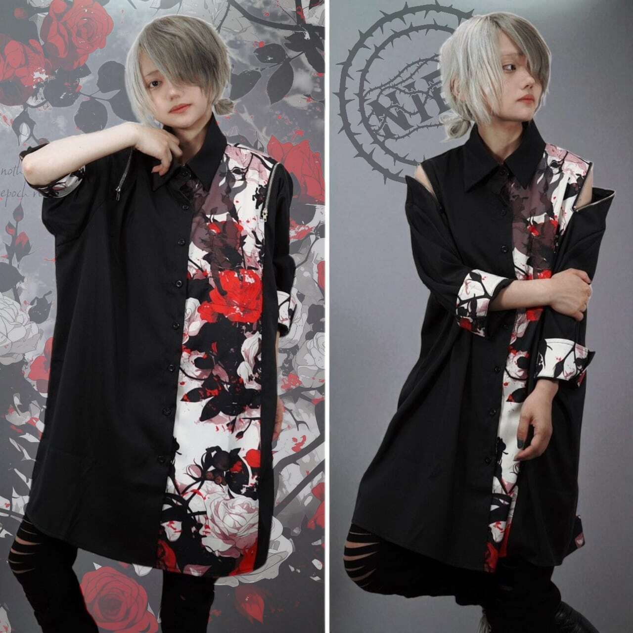 ・赤薔薇袖折返しデザイン2WAY LONG SHIRT