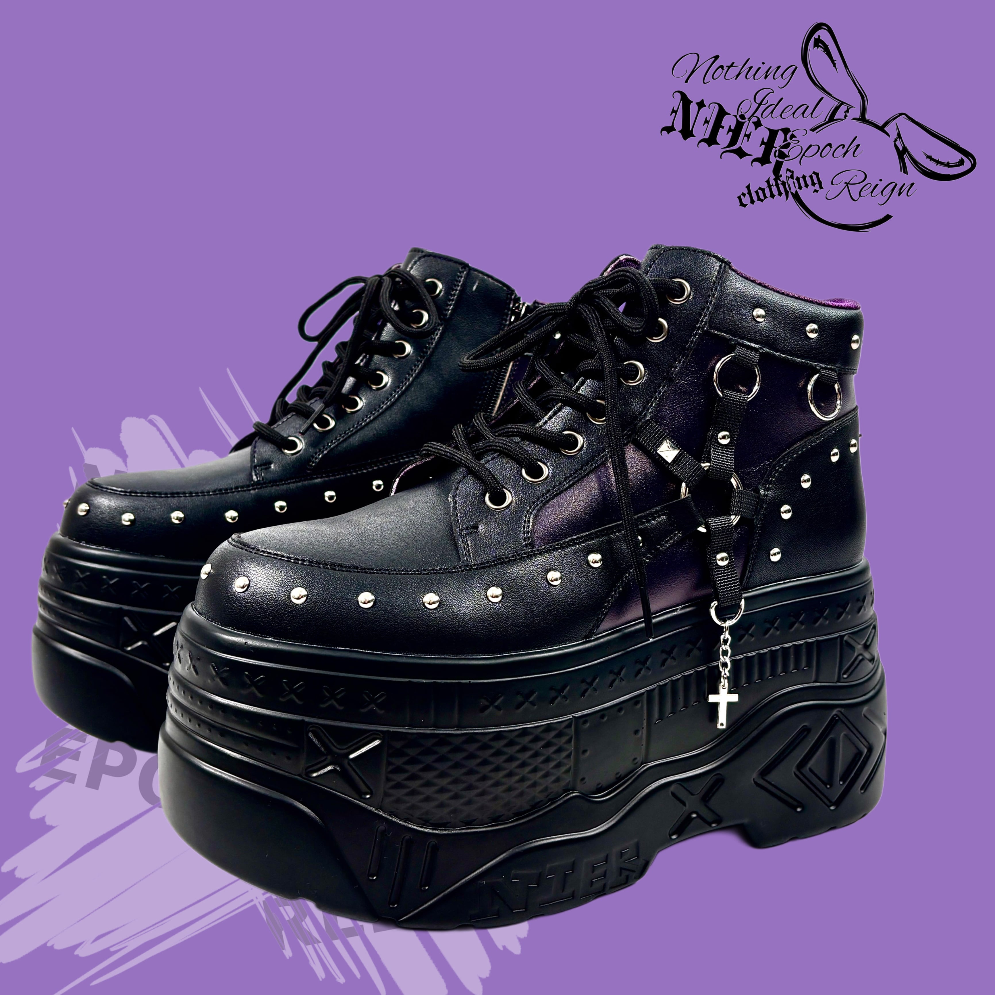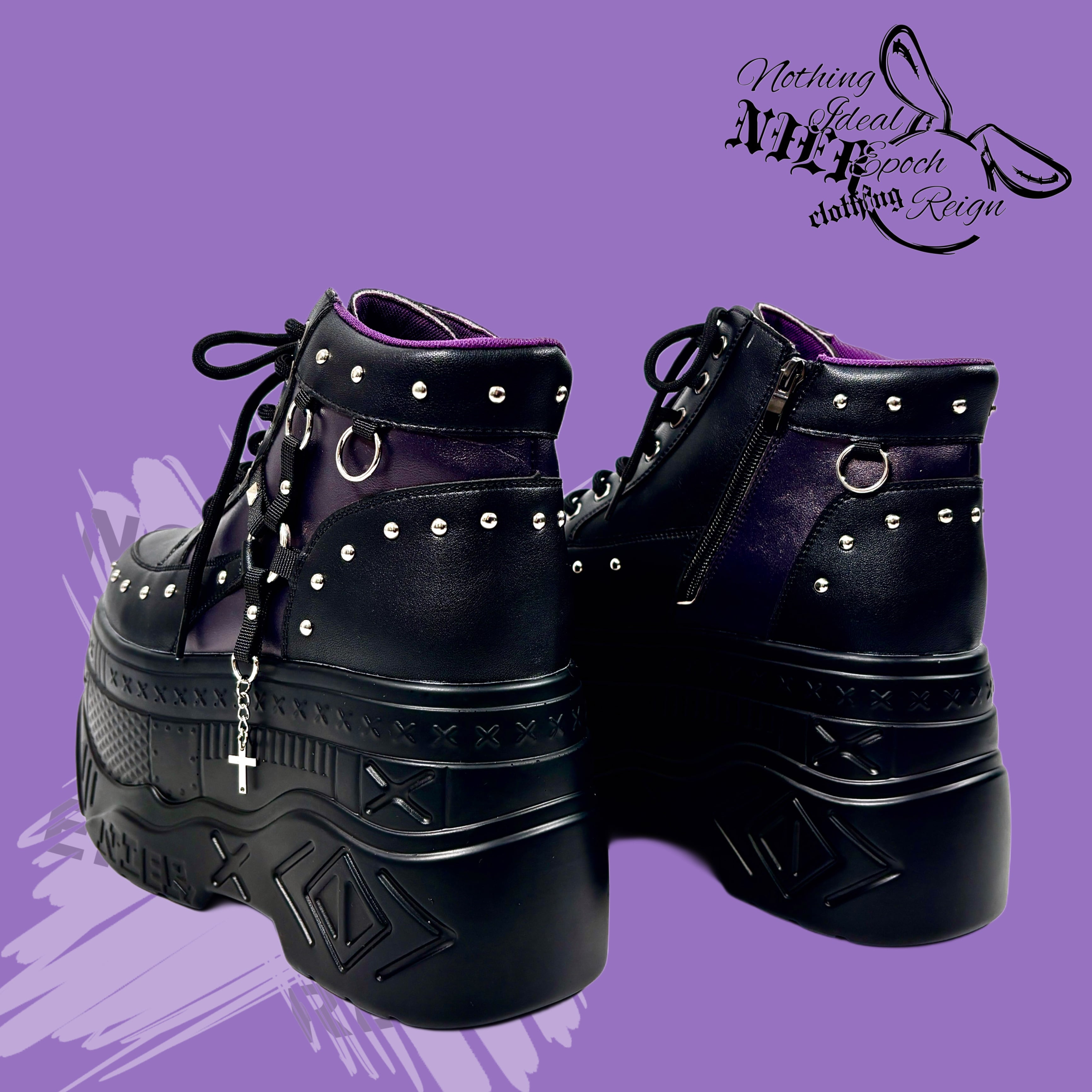 重厚感のあるブラックをベースに、DEEP PURPLEパネルとスタッズ、ハーネスディテールを組み合わせた、存在感のある一足。
