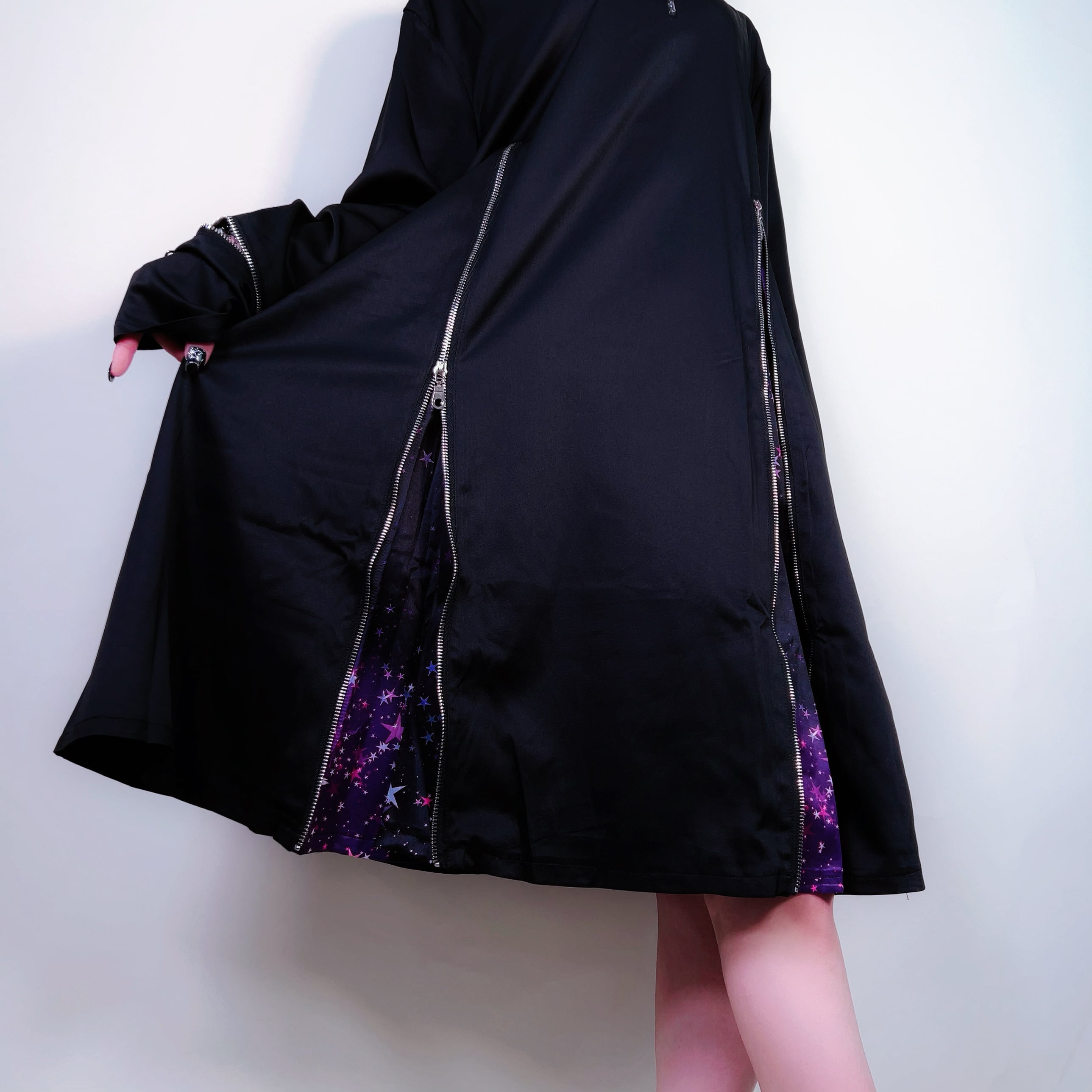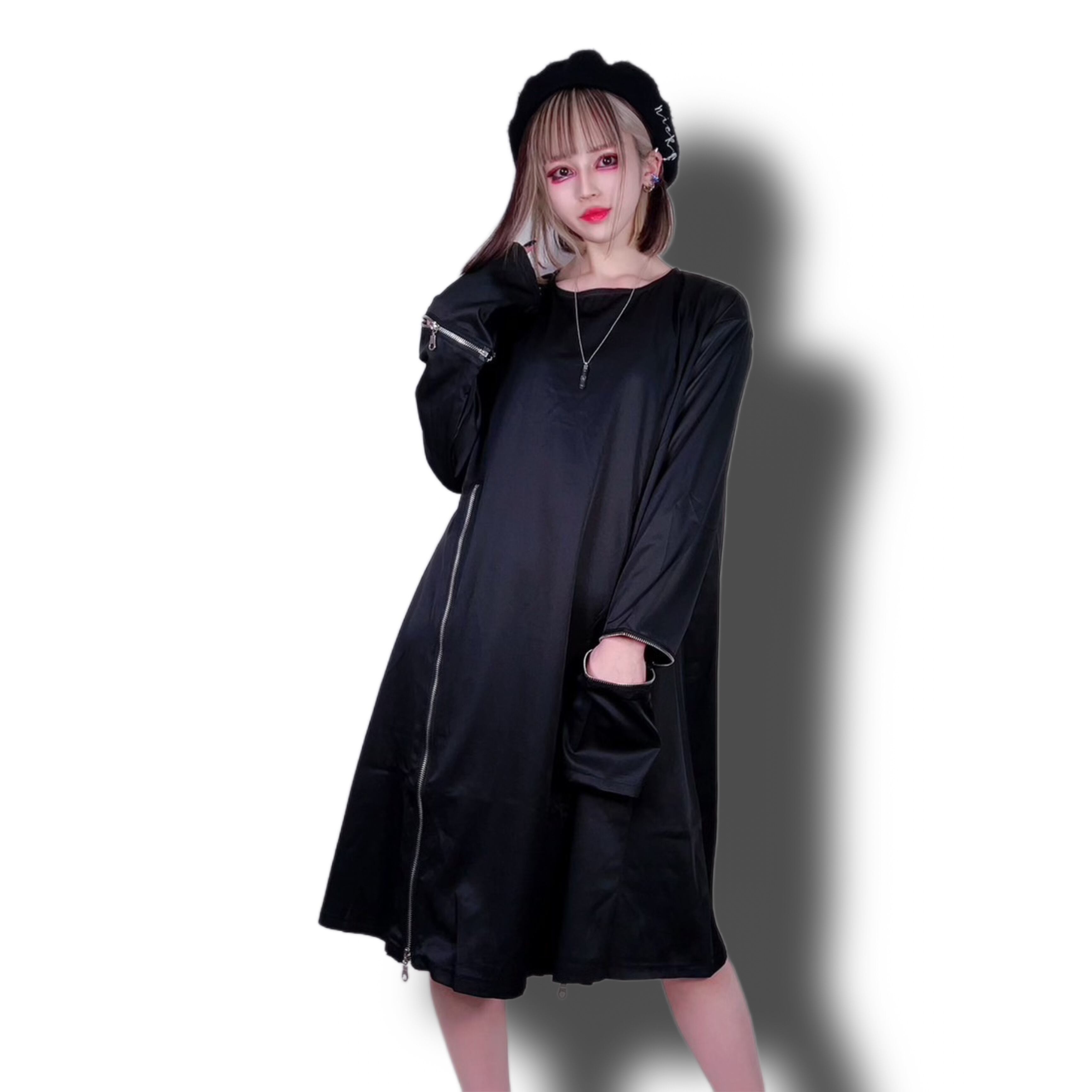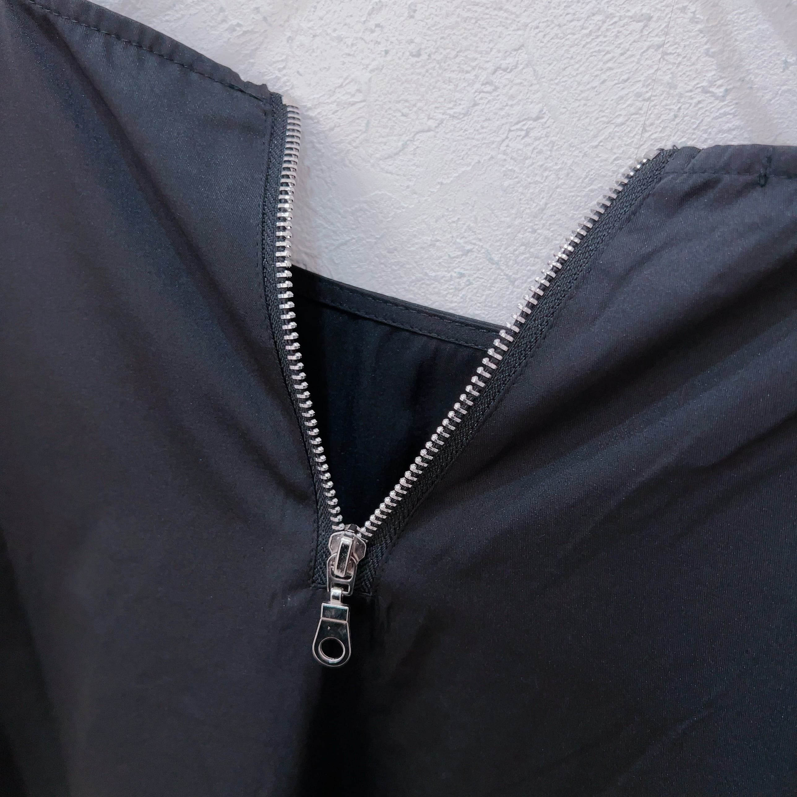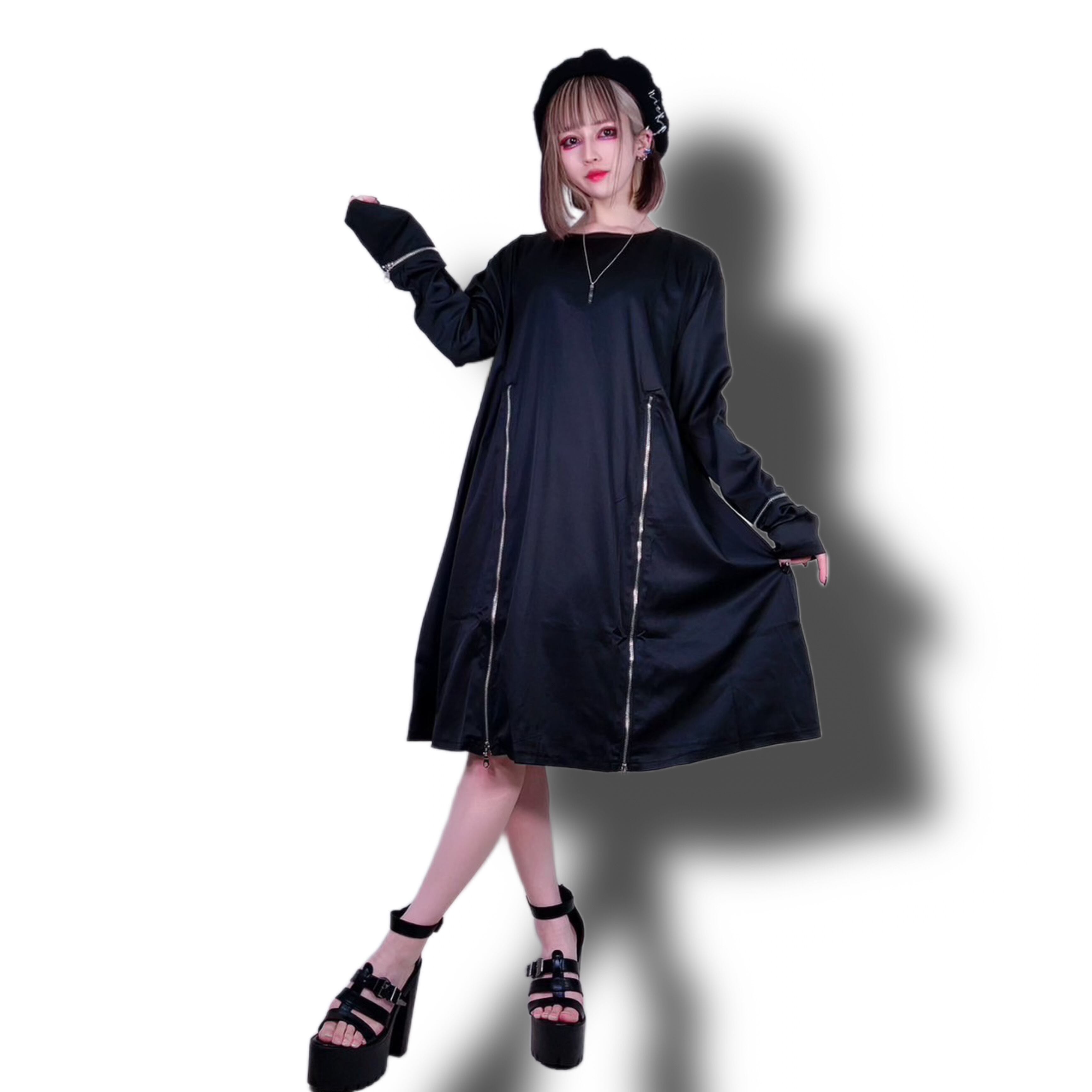 フロントジッパーを開ければフレアなシルエットに早変わり☆ジッパーを閉めればスッキリとしたシルエットの無地のトップスに早変わりする為、様々なシーンで活躍出来る商品です。