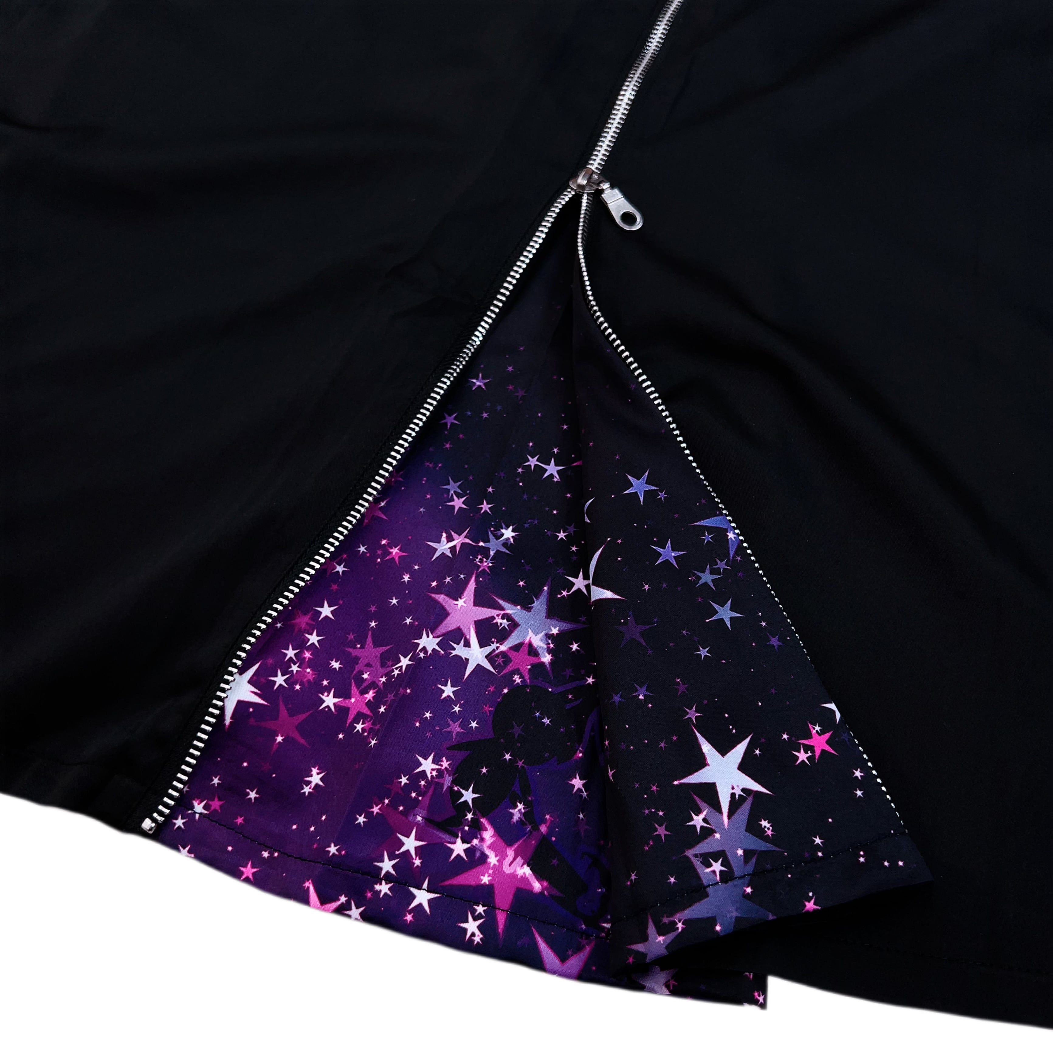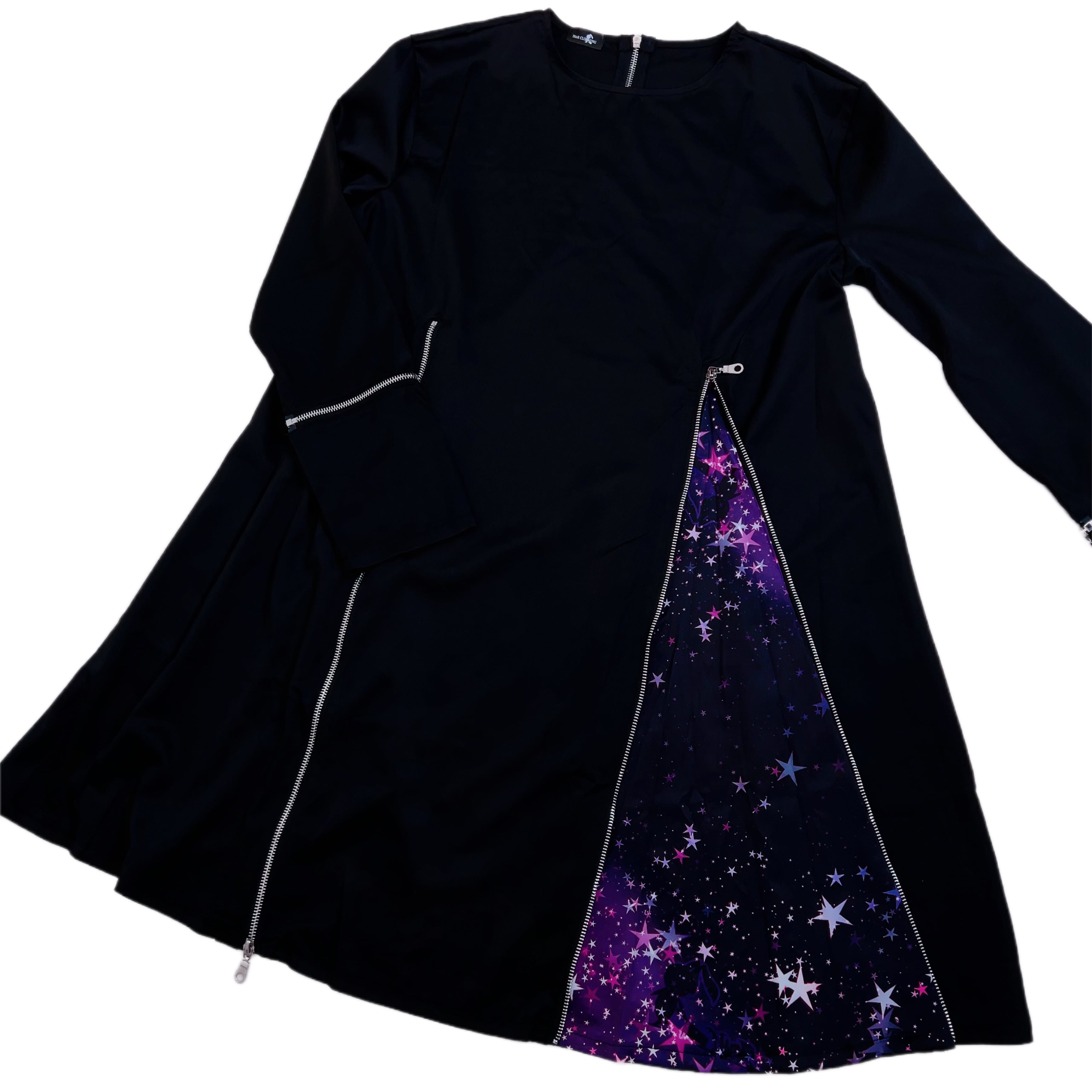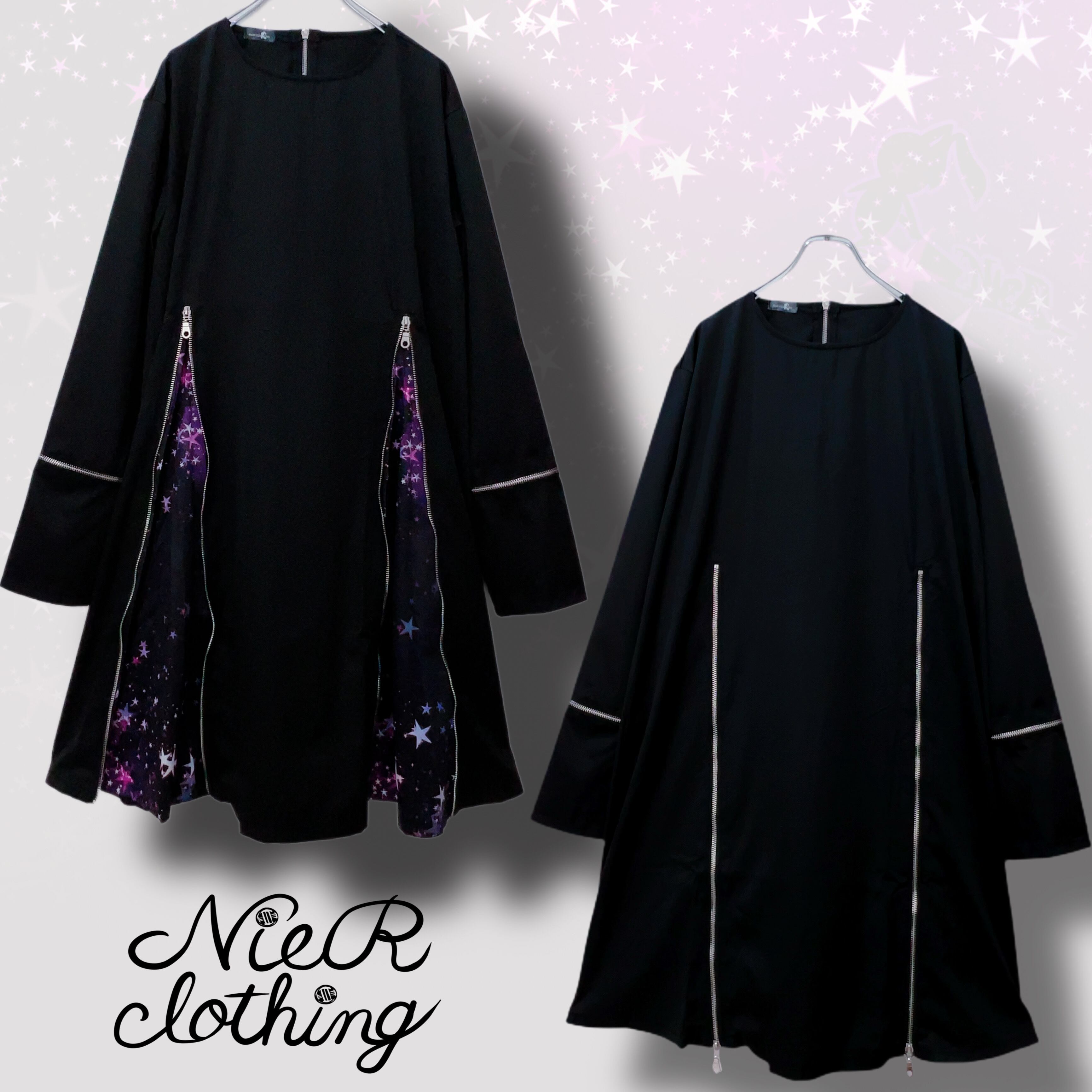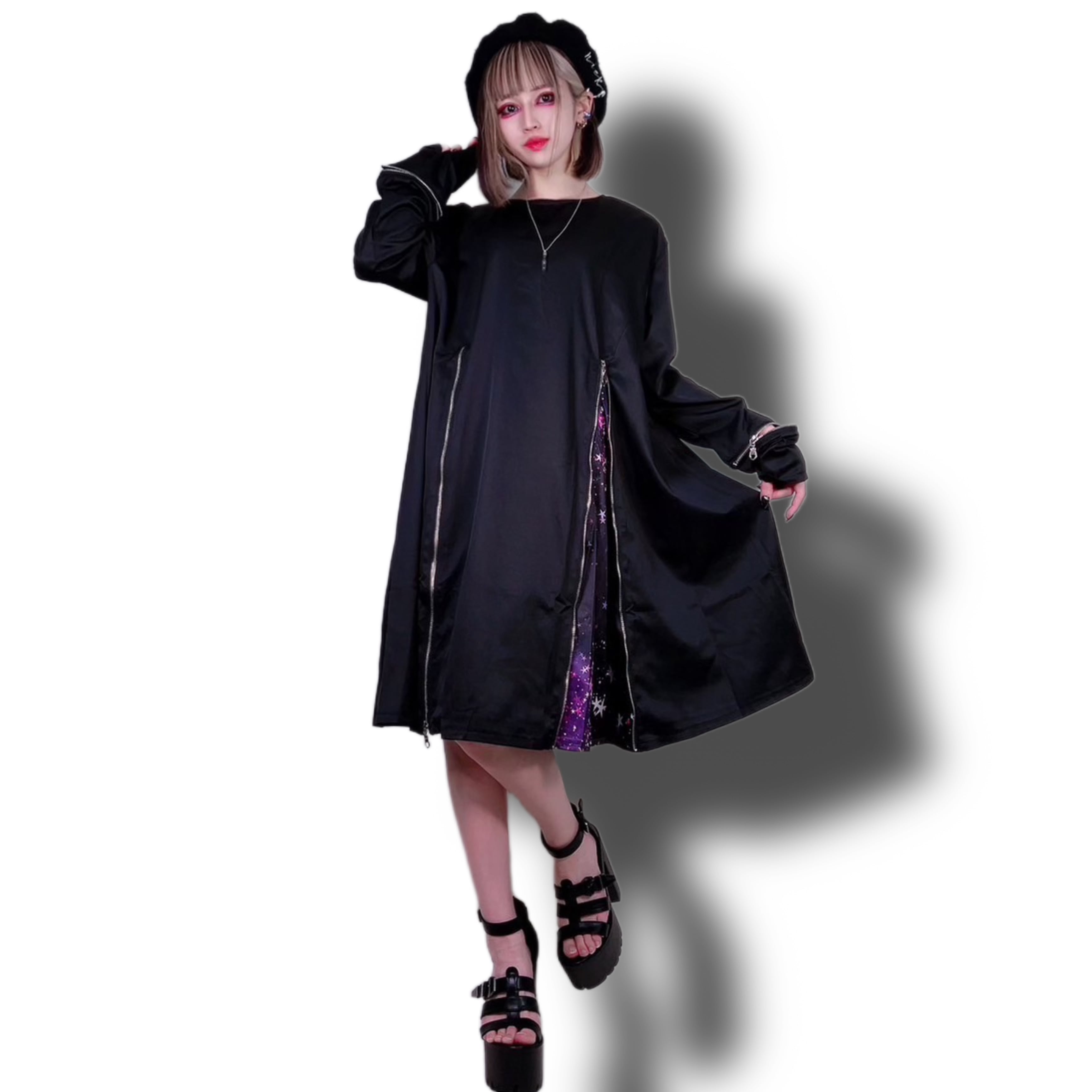 フロントジッパーを開ければフレアなシルエットに早変わり☆ジッパーを閉めればスッキリとしたシルエットの無地のトップスに早変わりする為、様々なシーンで活躍出来る商品です。