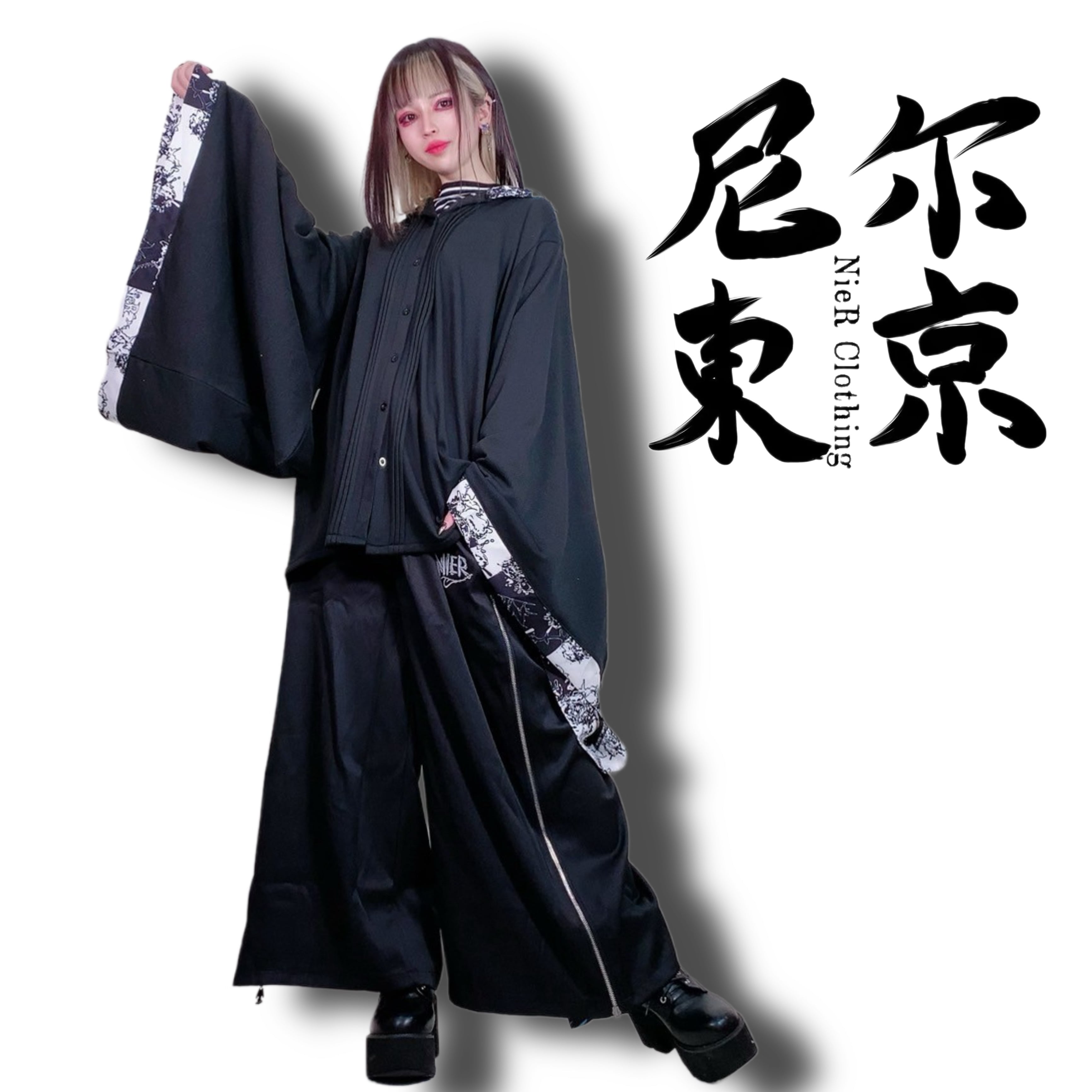 内側さらふわ防寒着物風袖ブロッキングシャツ【MONOCHROME HEART BEAT】