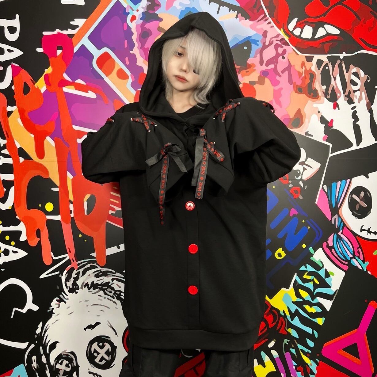 ワイド×ロングスリーブ袖リボン防寒プルオーバー【BLACK×RED】