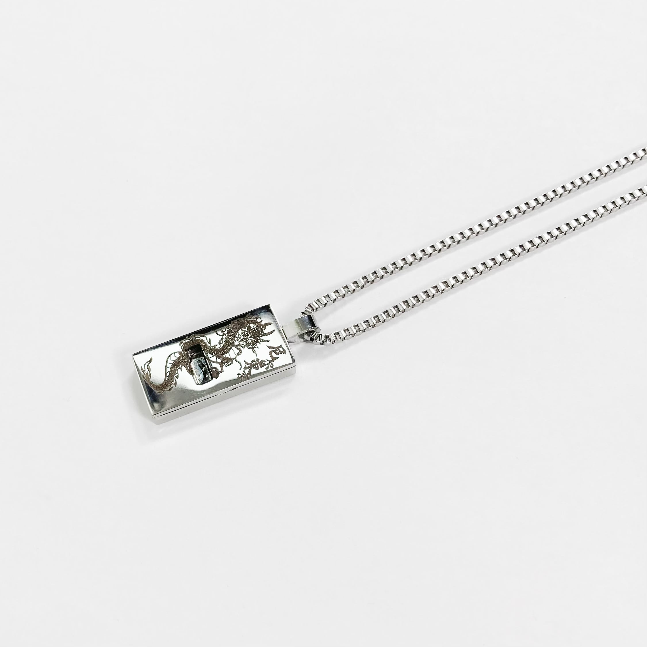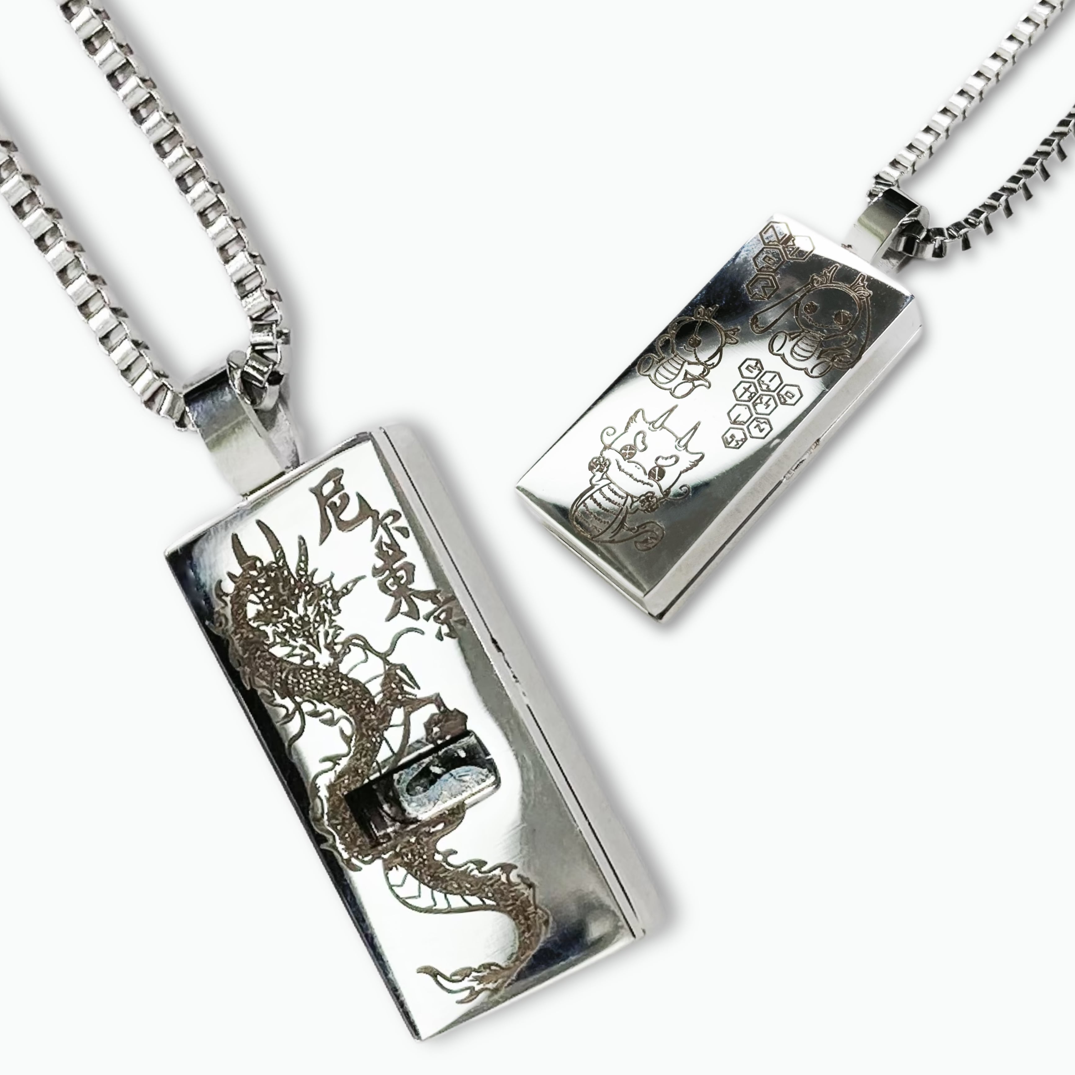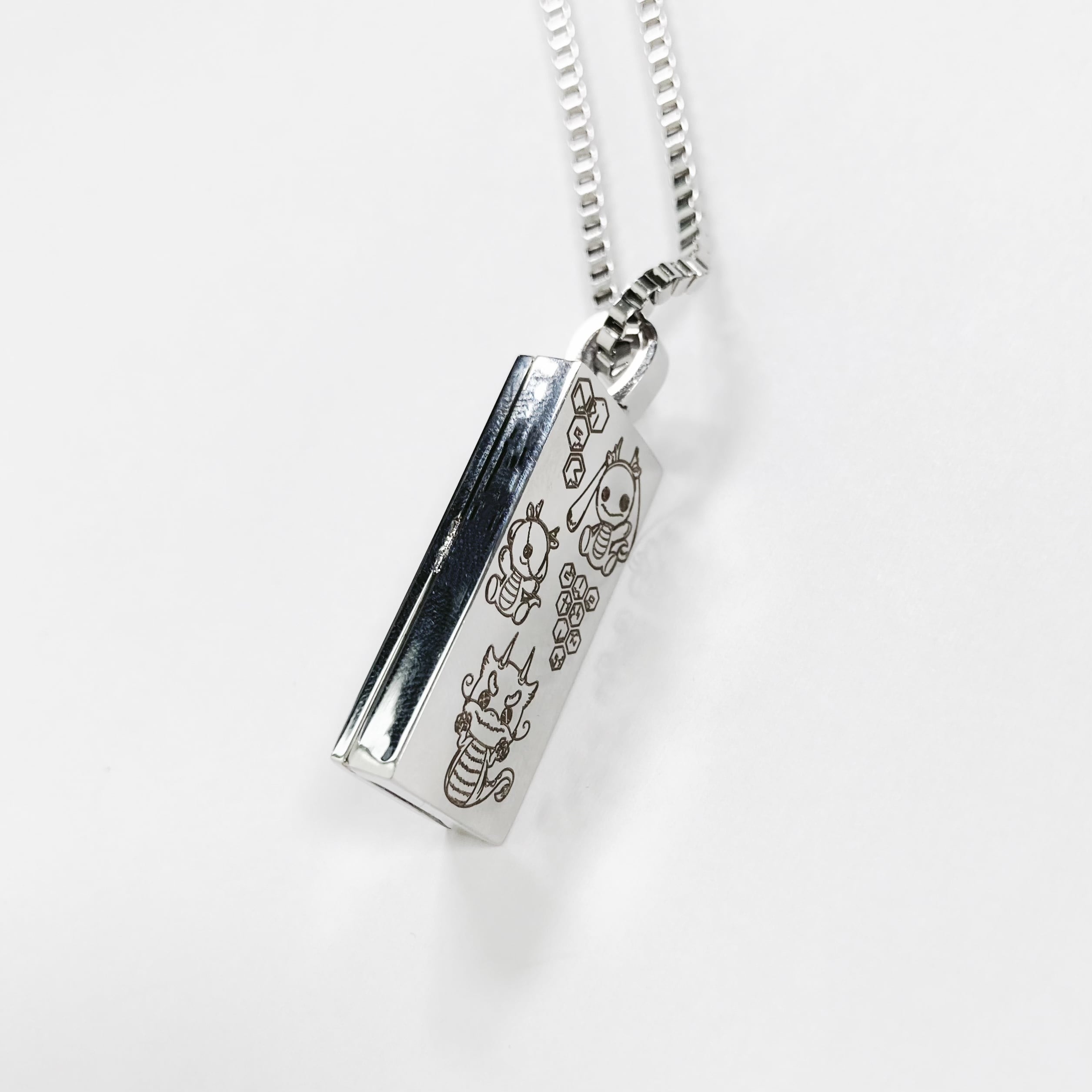 一見ただのプレートネックレスに見えますが、笛になっておりもしもの時は吹けるようになっております。