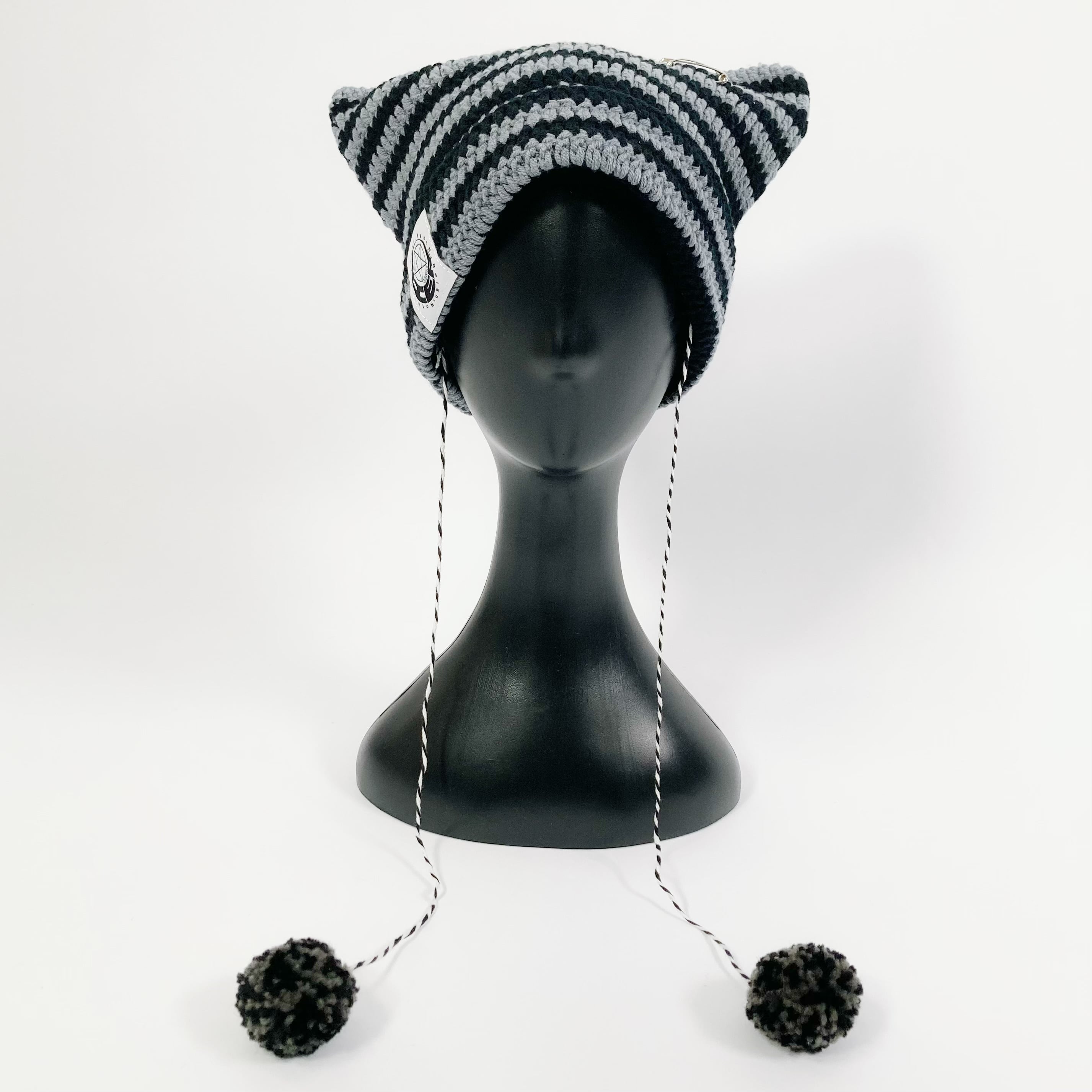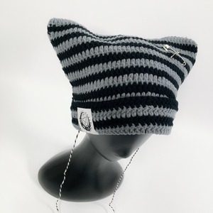 ポンポン×安ピン付き猫耳ニットキャップ【GRAY×BLACK】