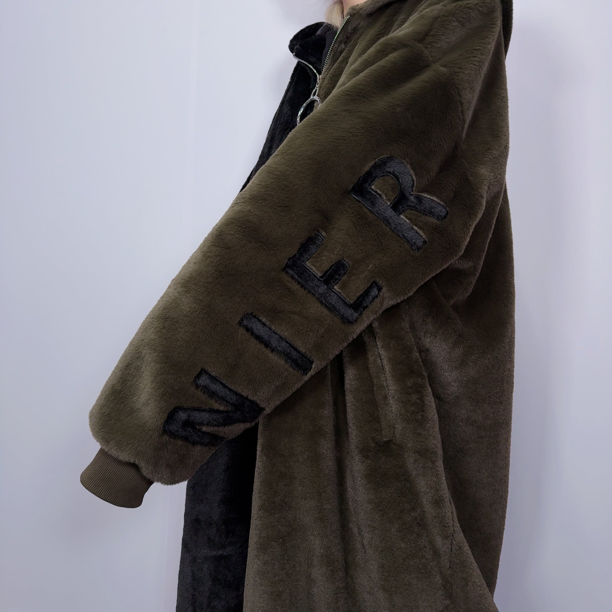 超ふわもこBACK LOGO TWO-TONE LONG COAT【BLACK×KHAKI】